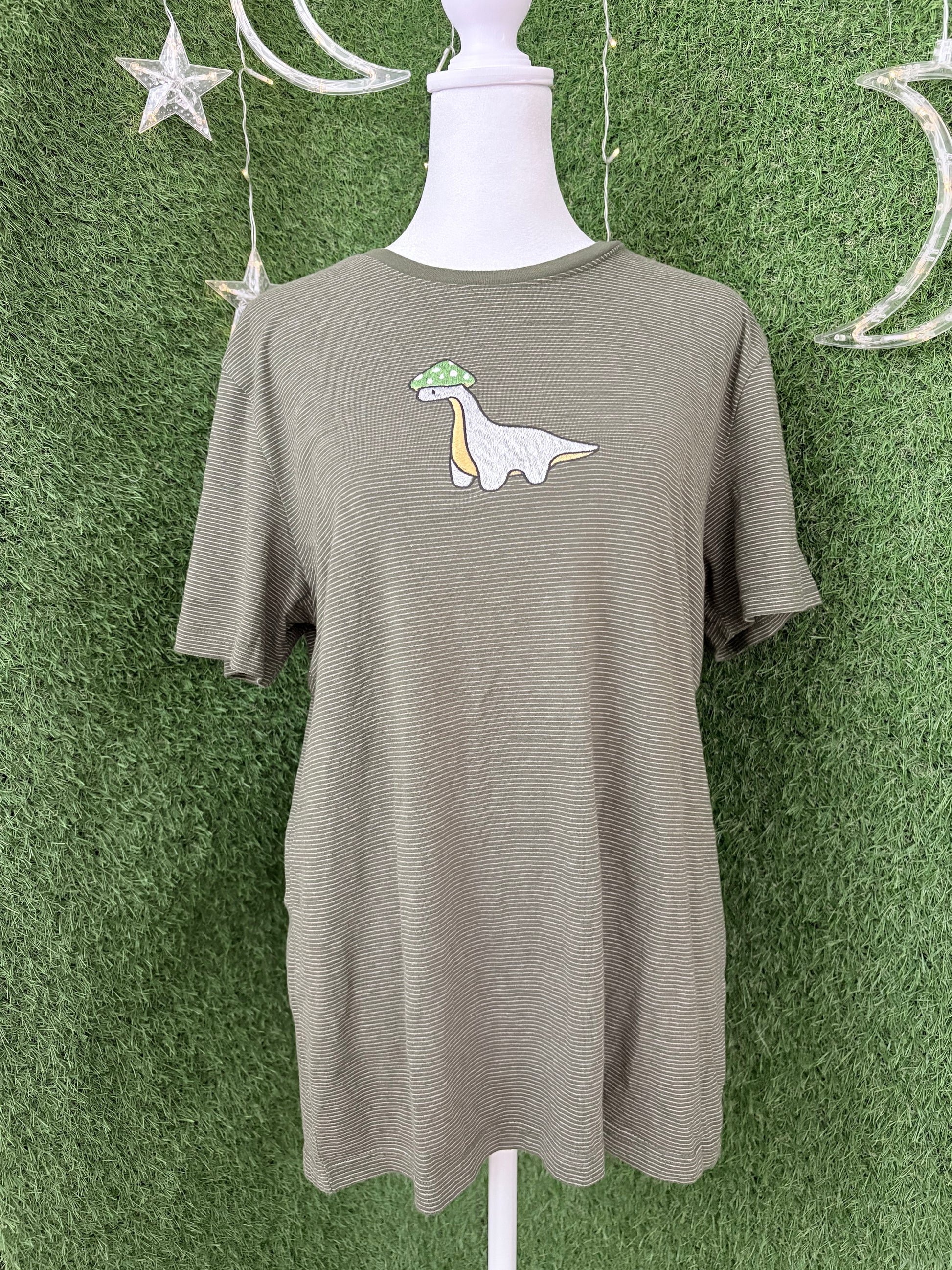 This green striped tee features a fun mushroom dino design and is made with sustainable materials, perfect for those who love playful style and slow fashion values!