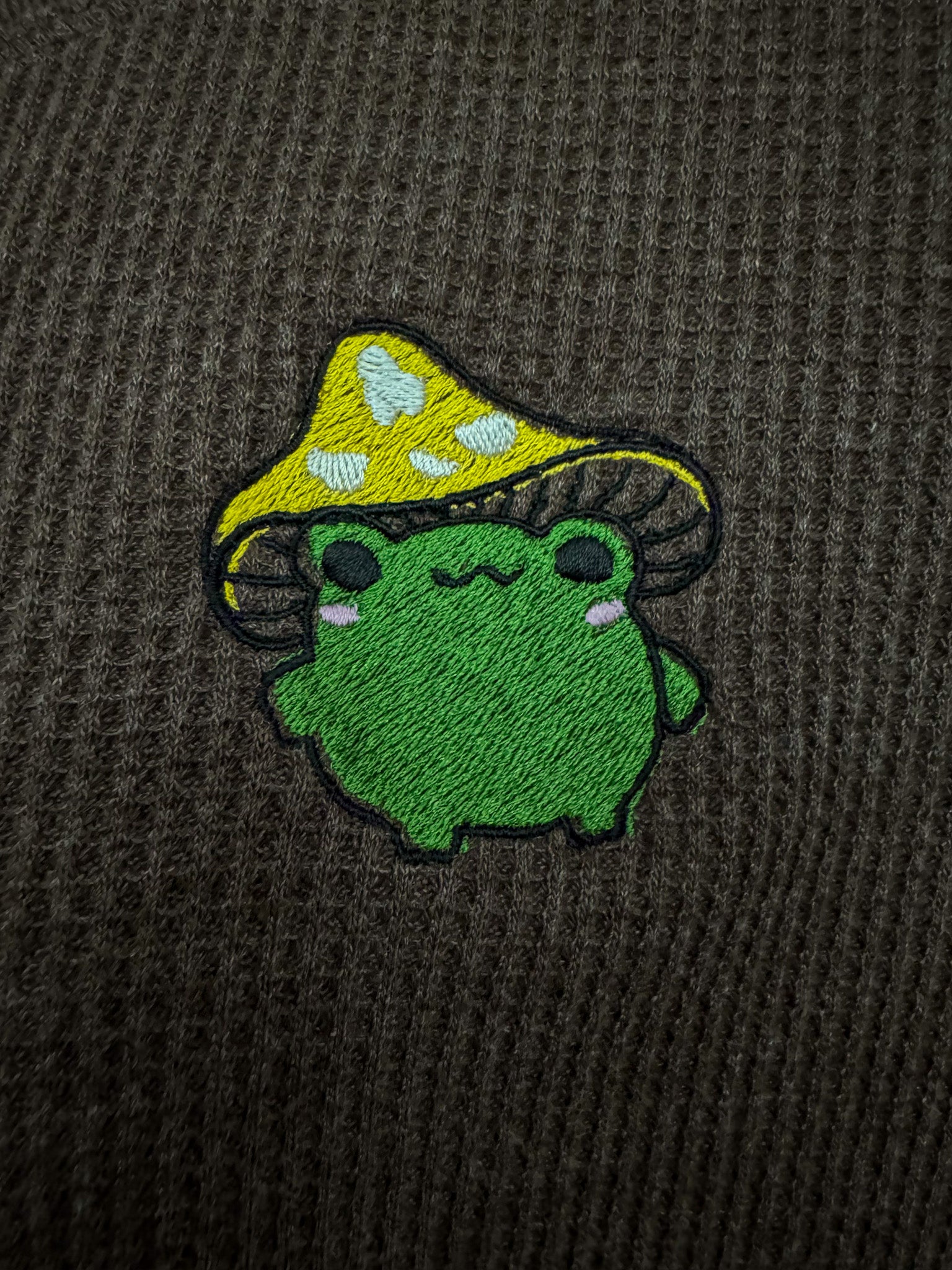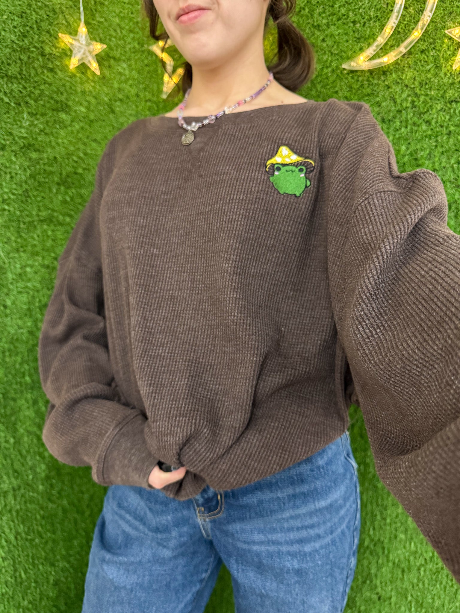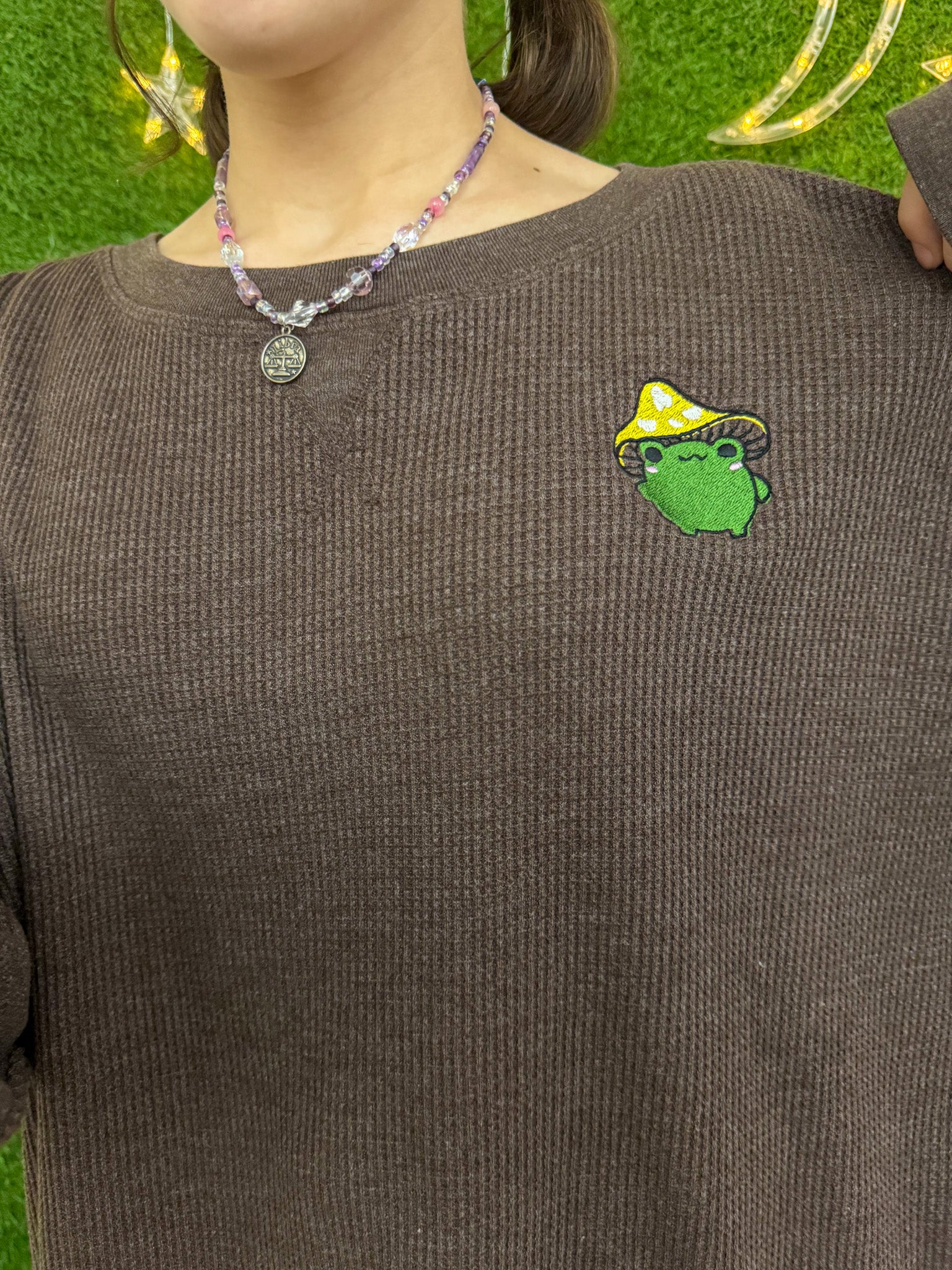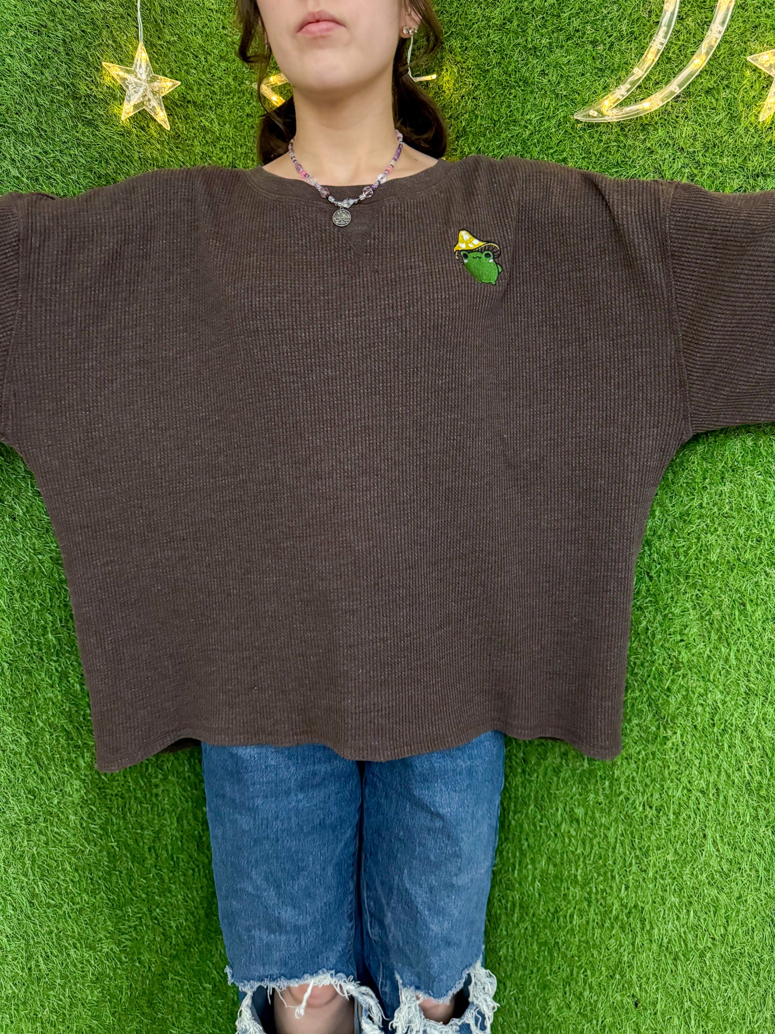 This brown thermal long sleeve is embroidered with a charming mushroom frog design. Supporting our small business and making a sustainable choice, each piece is upcycled and a unique secondhand garment. Embrace slow fashion with this eco-friendly addition to your wardrobe!!