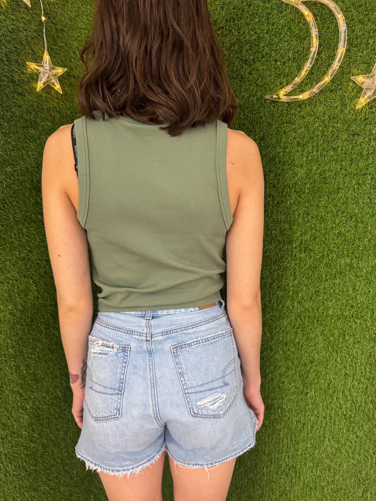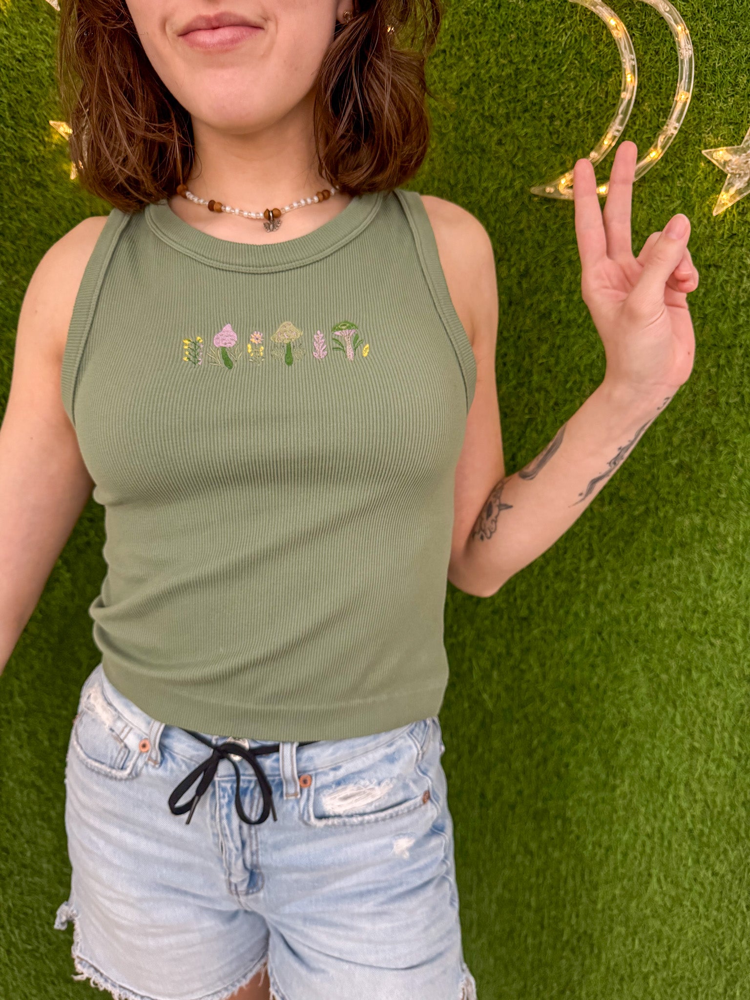Mushrooms & Flowers Green Ribbed Tank Top XL