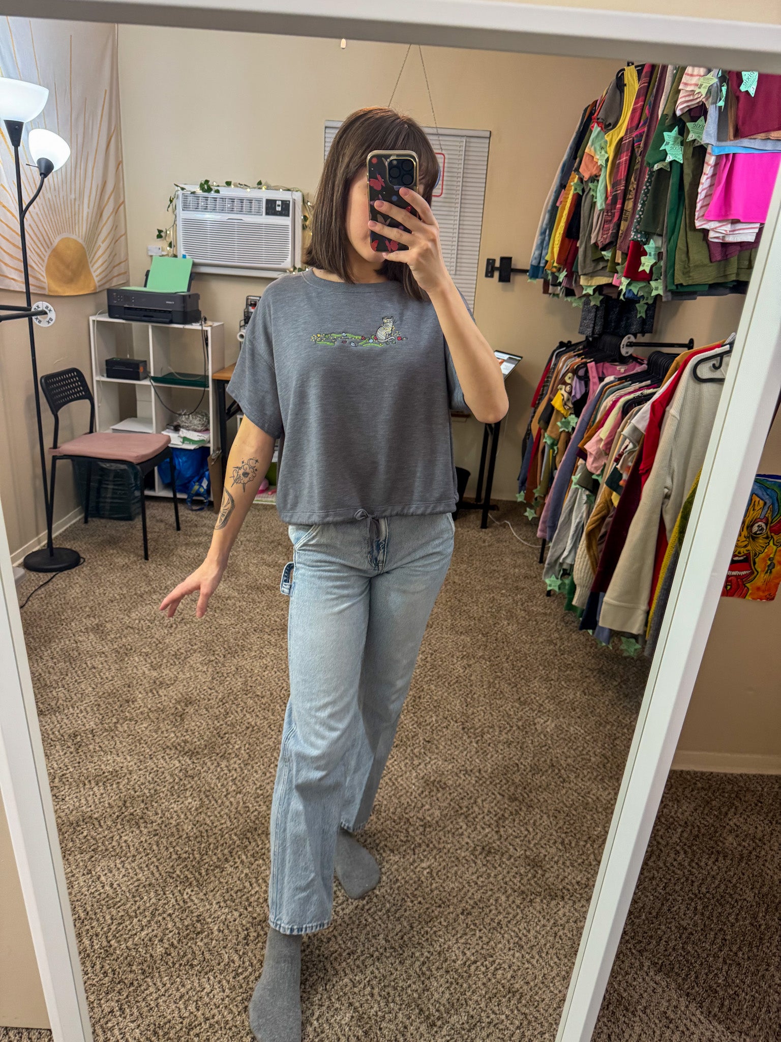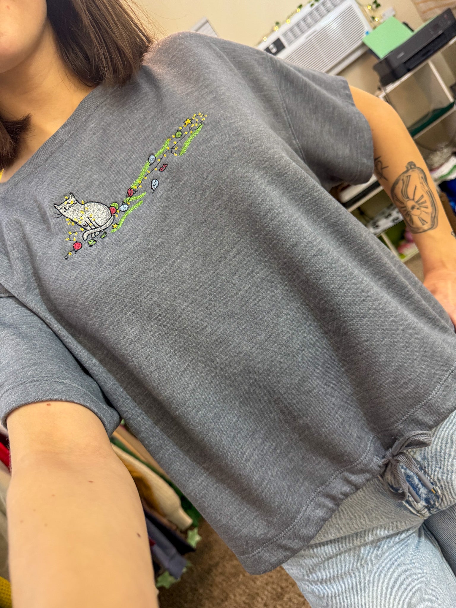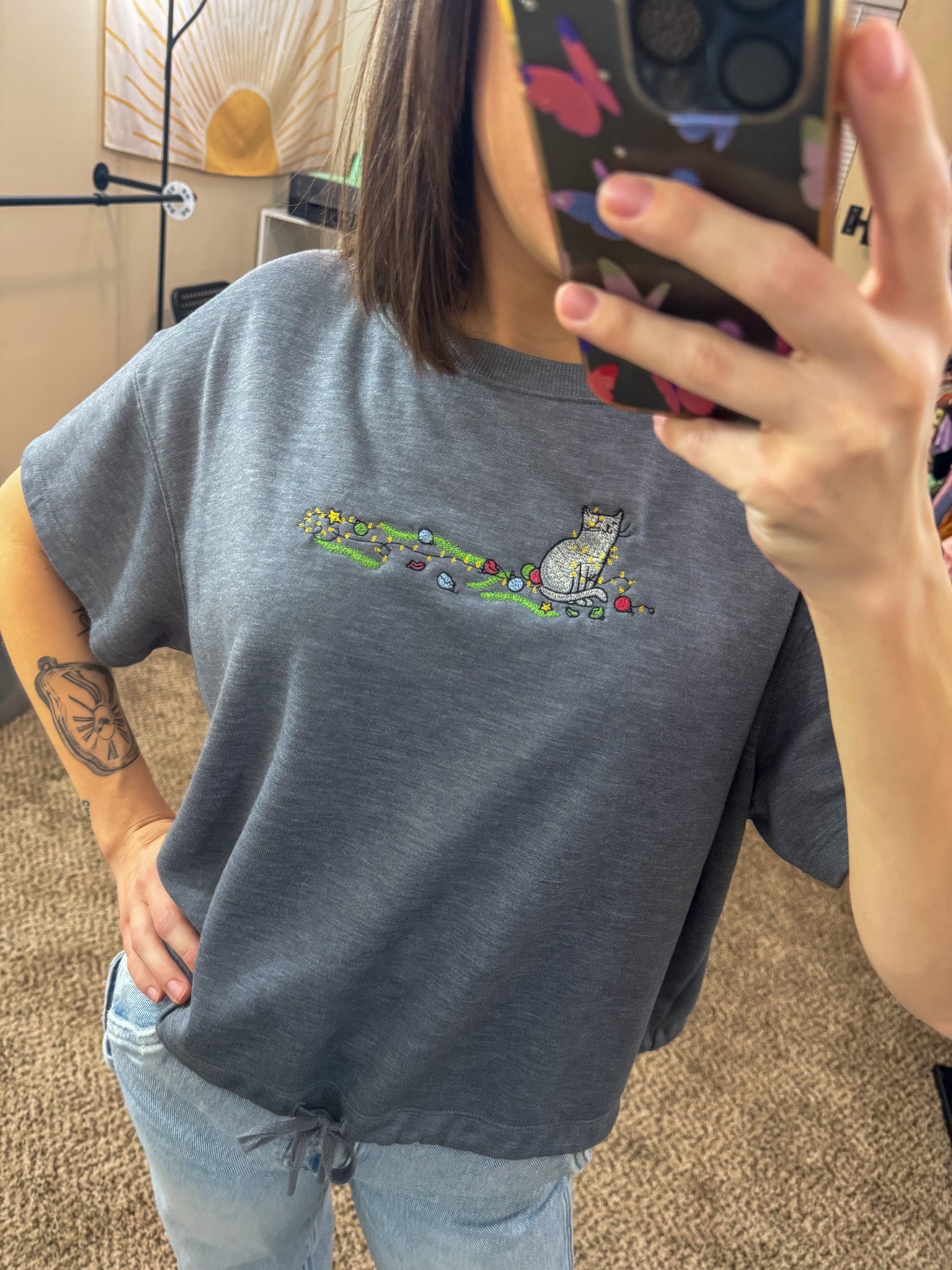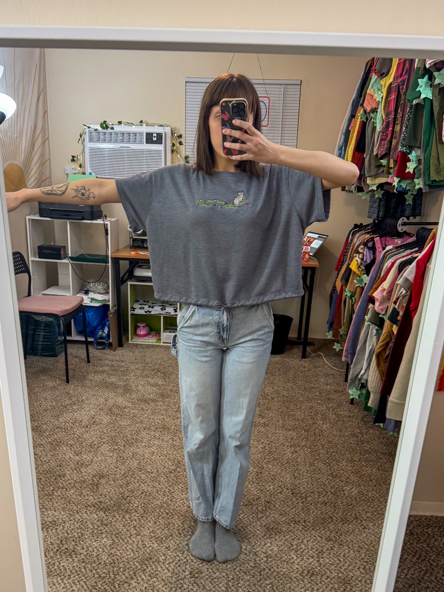 Get your paws on our Naughty Kitty Cinched Cropped Tee! This cute top is embroidered by us and made from a discarded, secondhand garment, making it a sustainable and slow fashion choice. Plus, you'll be supporting our small biz when you rock this quirky piece!