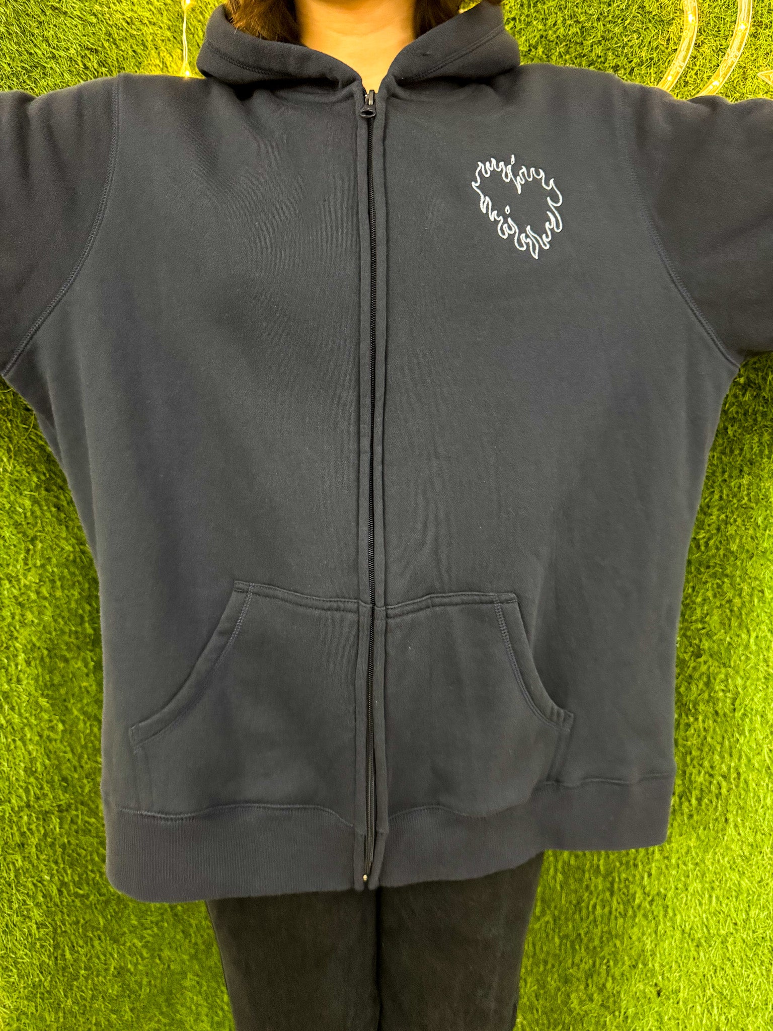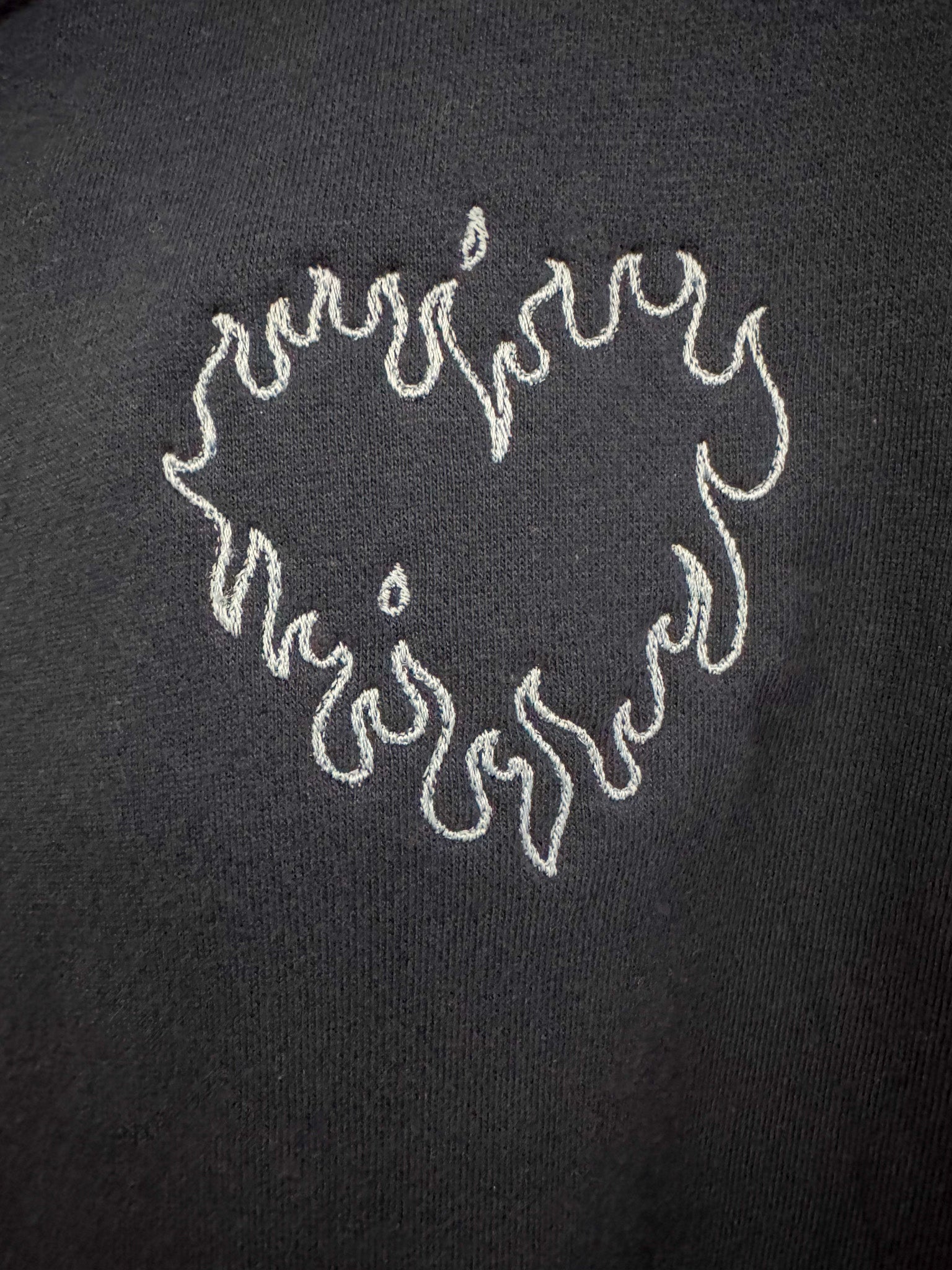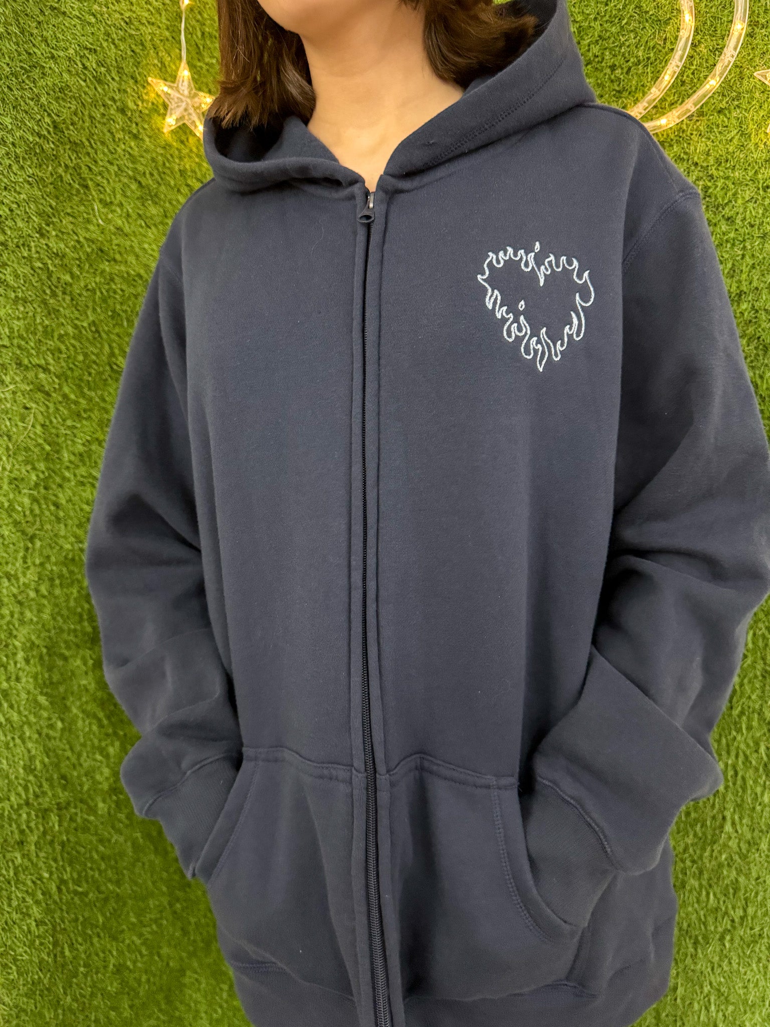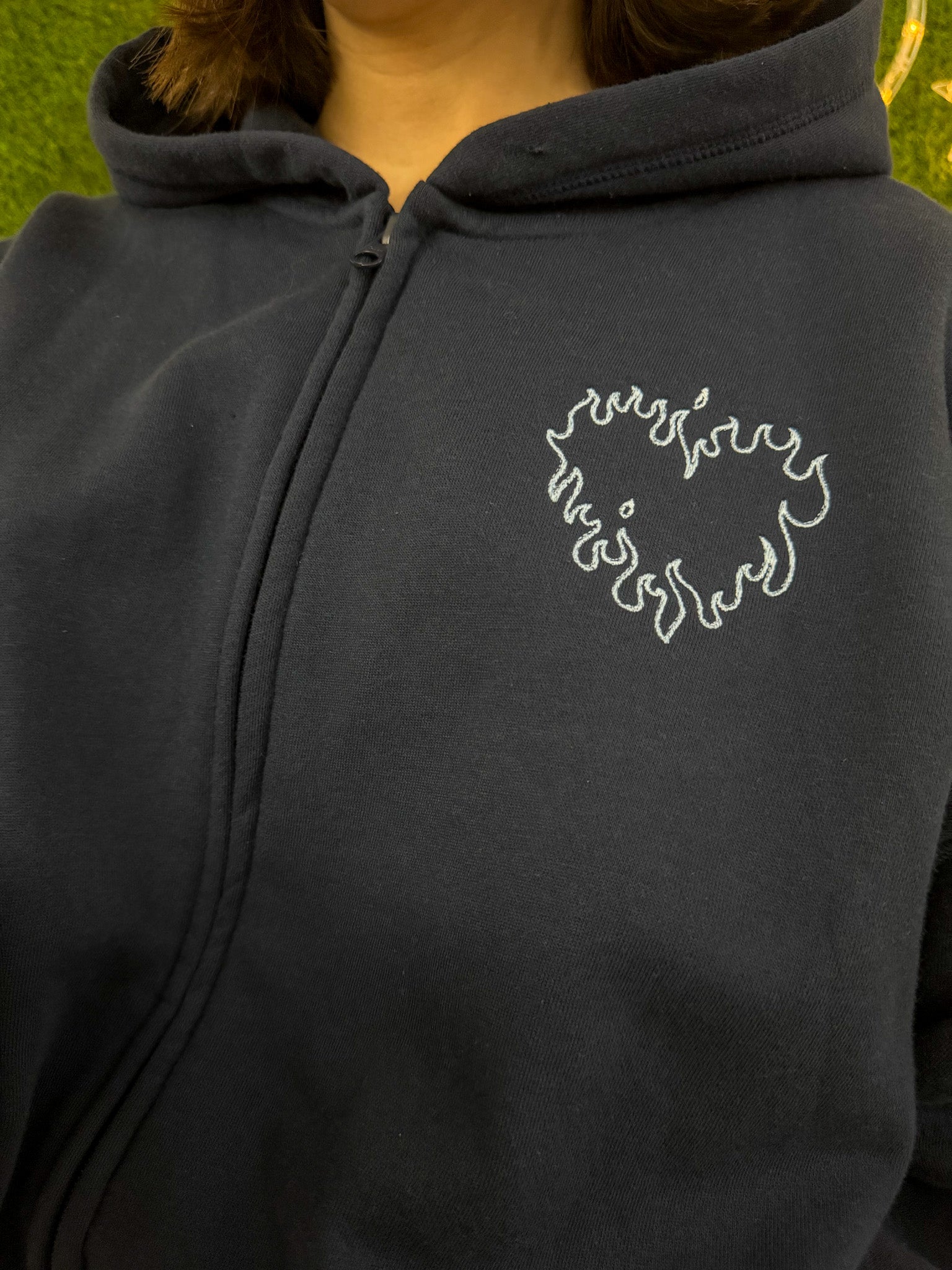 Introducing our Navy Flame Heart Zip Up Hoodie, with an embroidered design. Show your support for small businesses while staying stylish and eco-friendly with this upcycled, secondhand garment. Made with sustainable methods, this is the perfect addition to your slow fashion wardrobe!