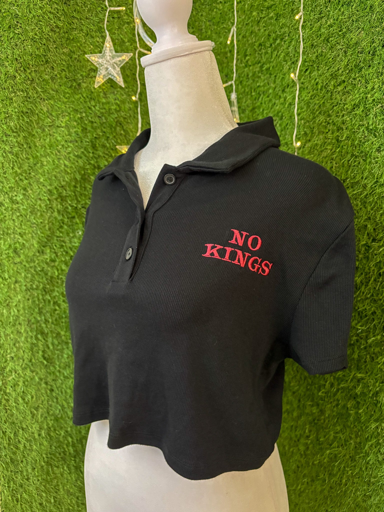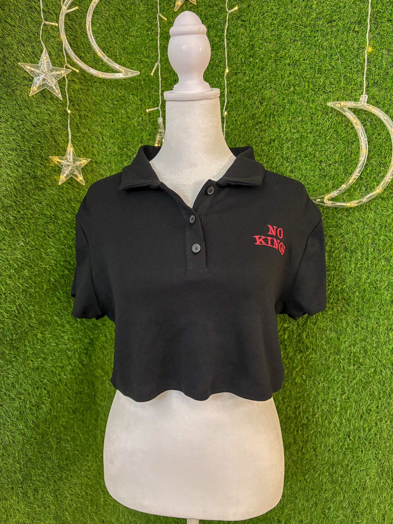 The No Kings Cropped Polo Tee is a unique, embroidered piece upcycled from a secondhand garment. Embracing sustainable and slow fashion principles, this tee offers an eco-friendly choice that reduces waste while delivering timeless style. Perfect for those who value conscious consumption without compromising on quality or design!