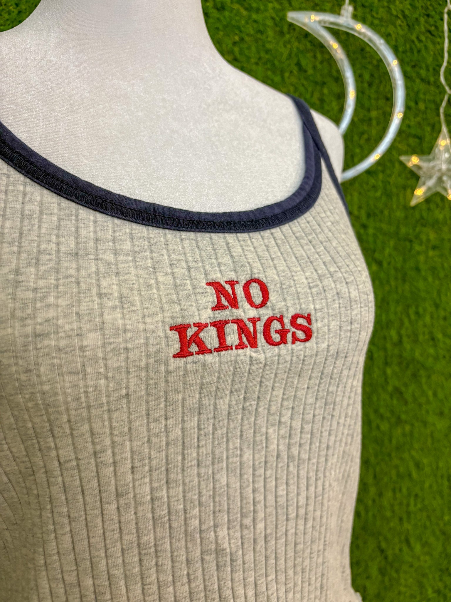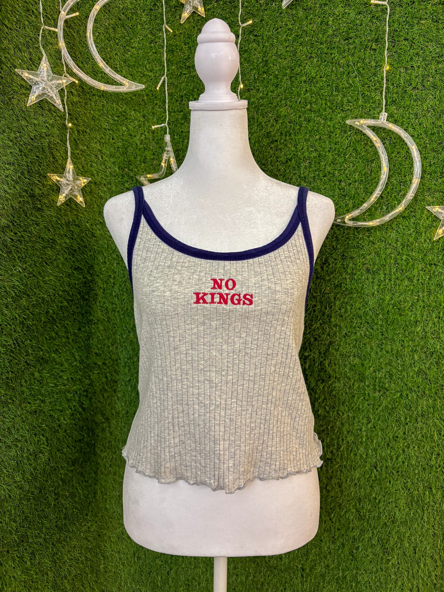 This No Kings Grey Ribbed Tank is an embroidered, upcycled piece made from a secondhand garment. Embracing slow fashion, it offers a sustainable and stylish addition to your wardrobe!
