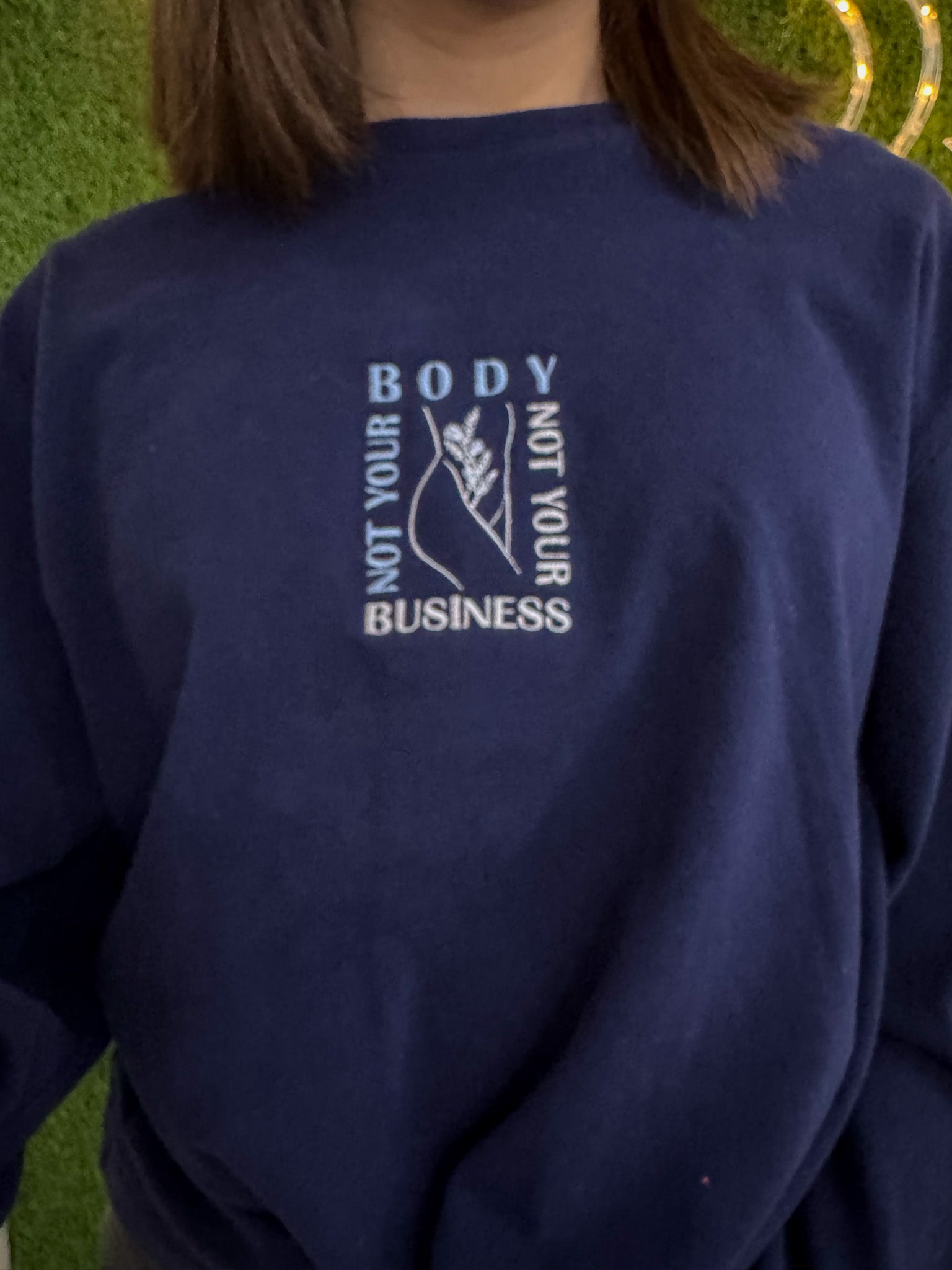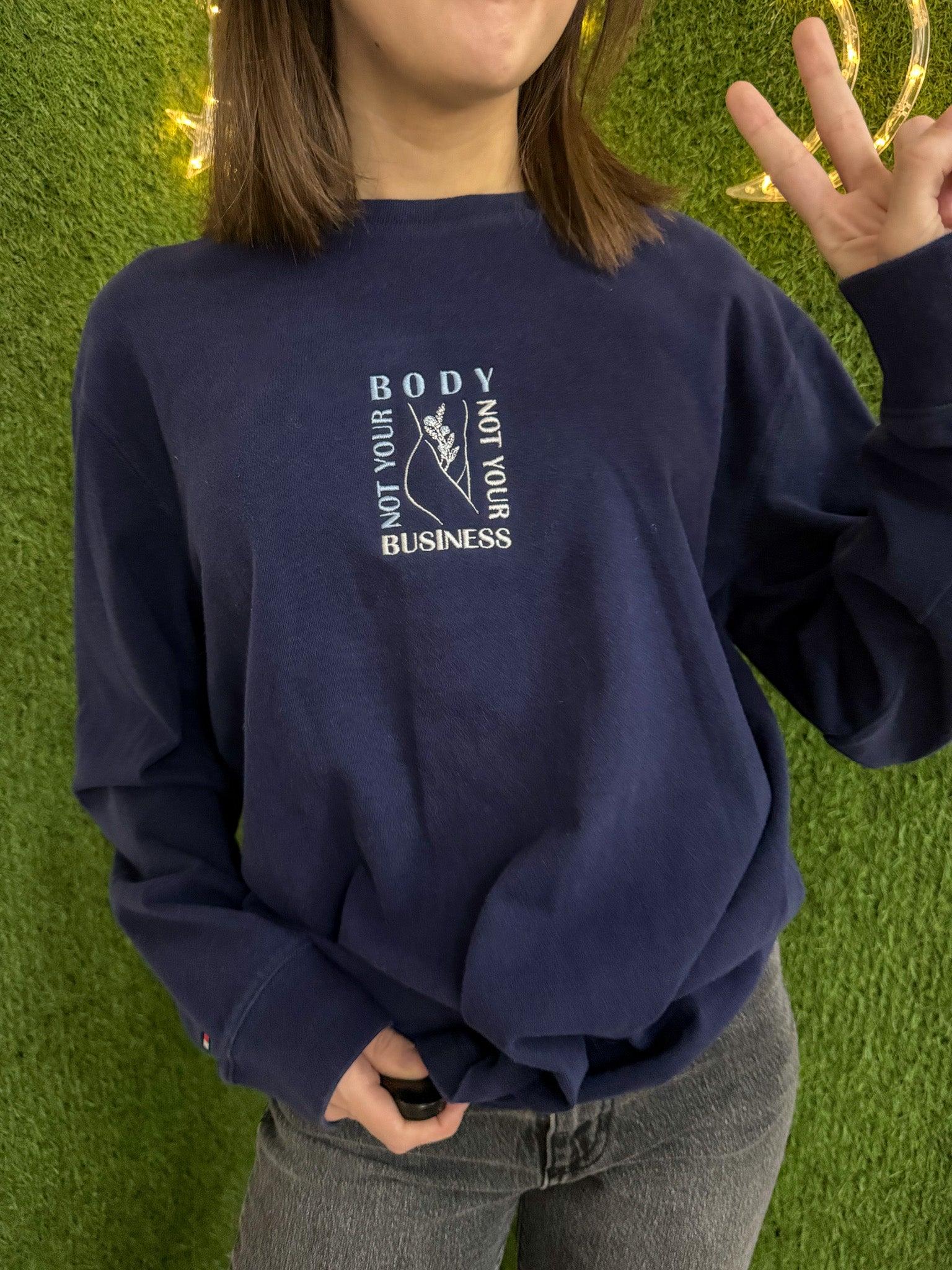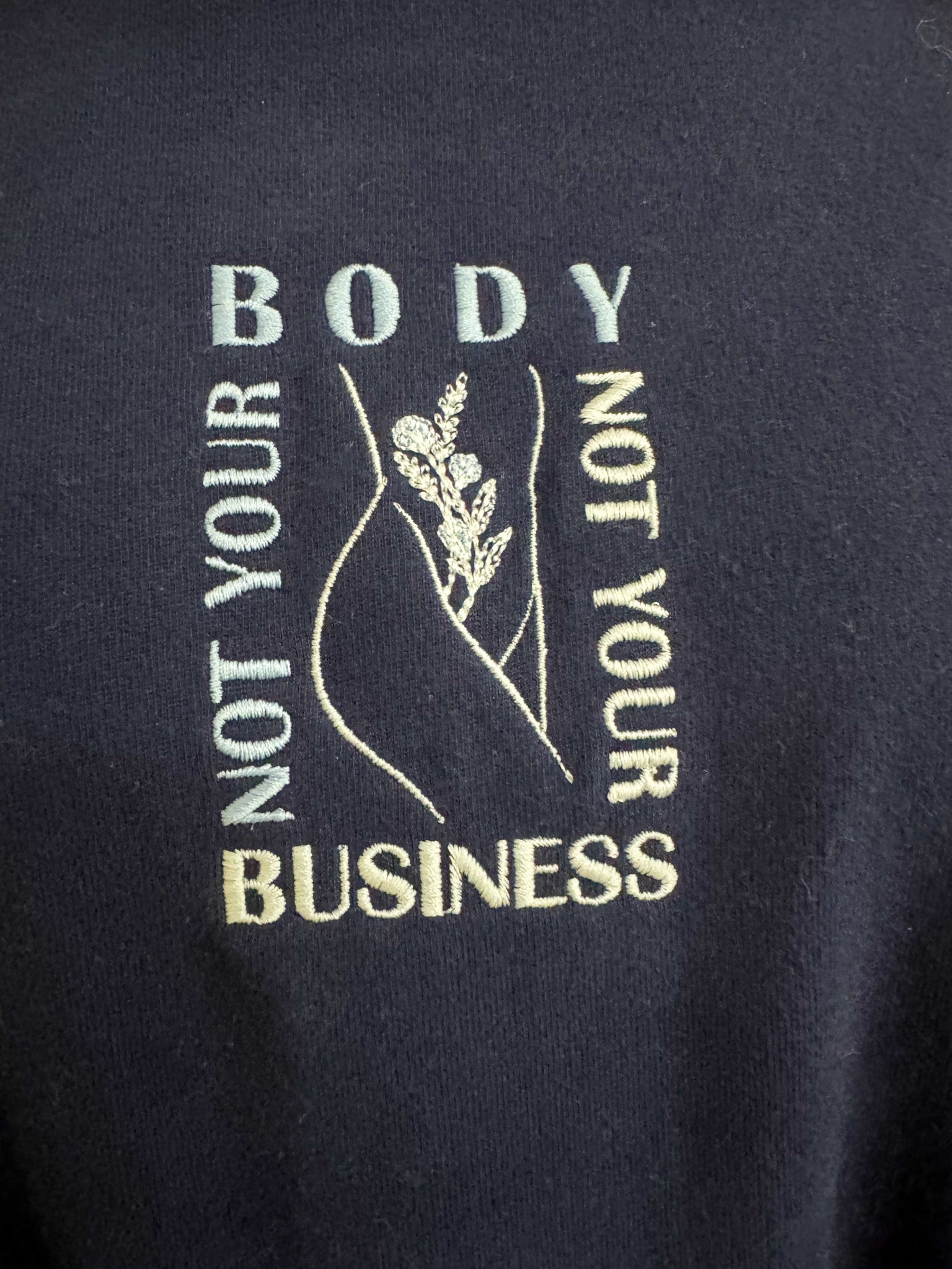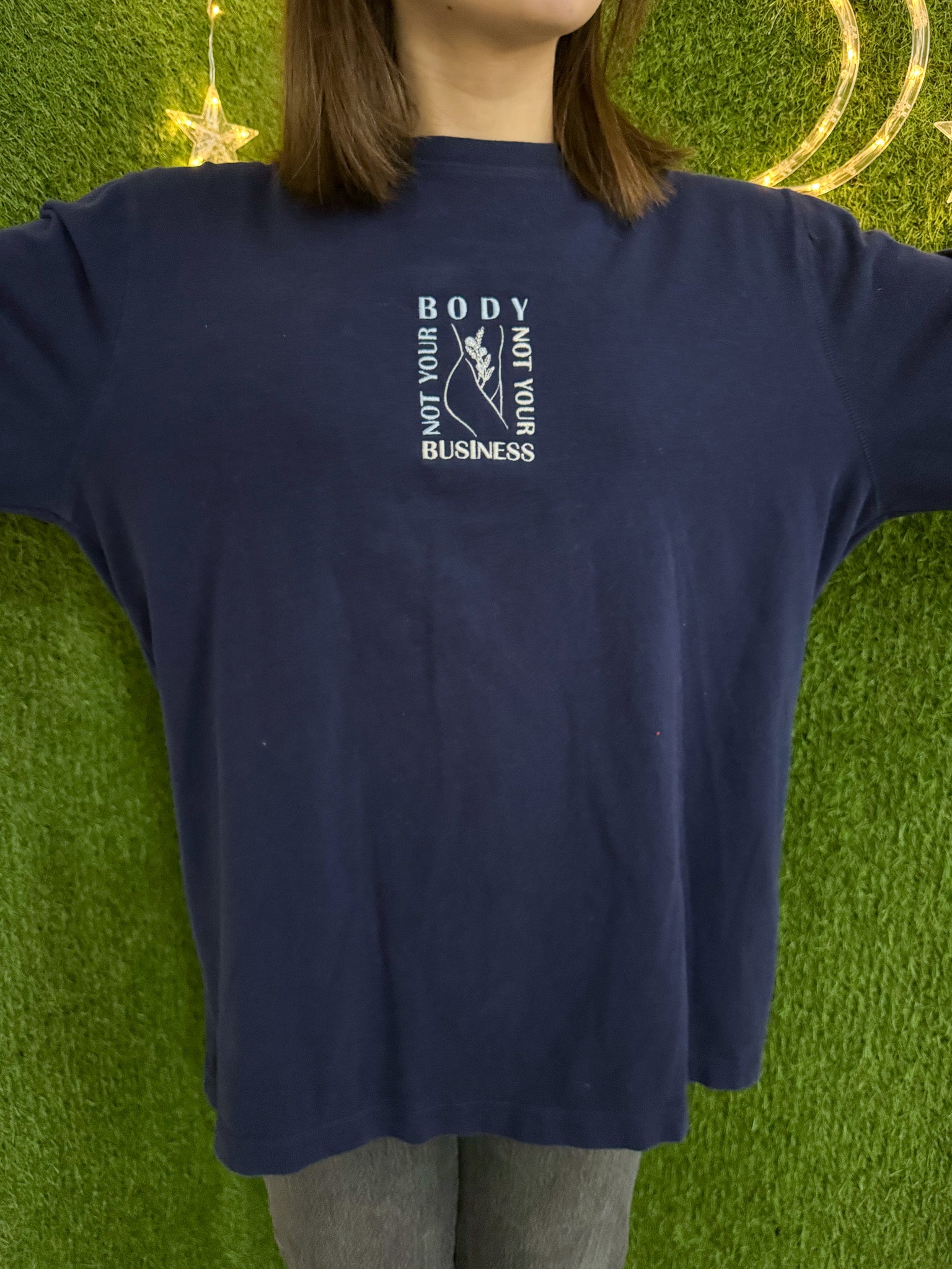 Support sustainable and slow fashion with our Not Your Body, Not Your Business Navy Long Sleeve. This upcycled and secondhand garment features delicate embroidery, making a fashionable statement while also supporting small businesses!