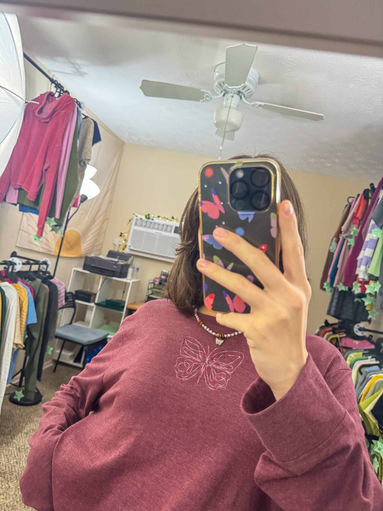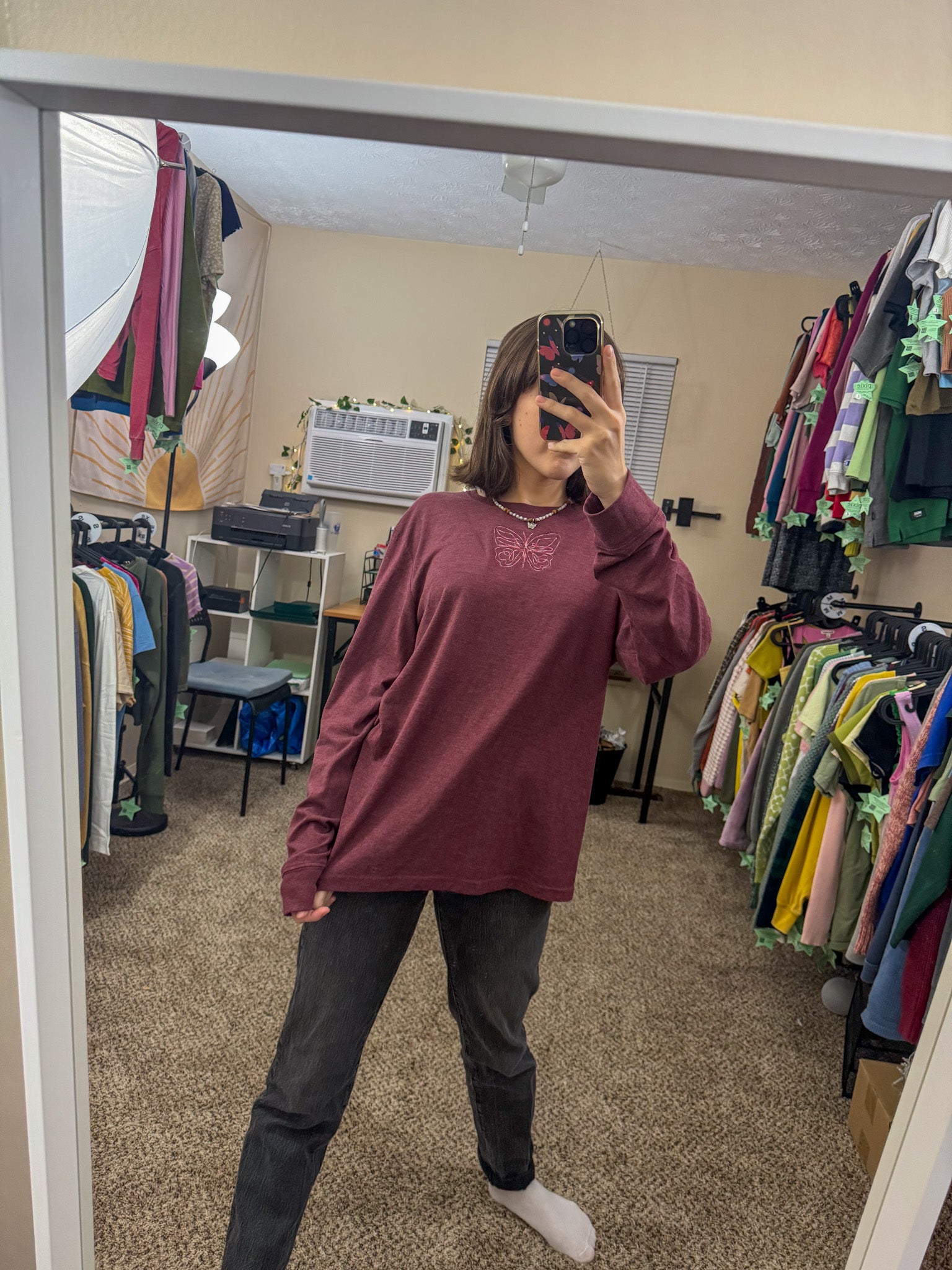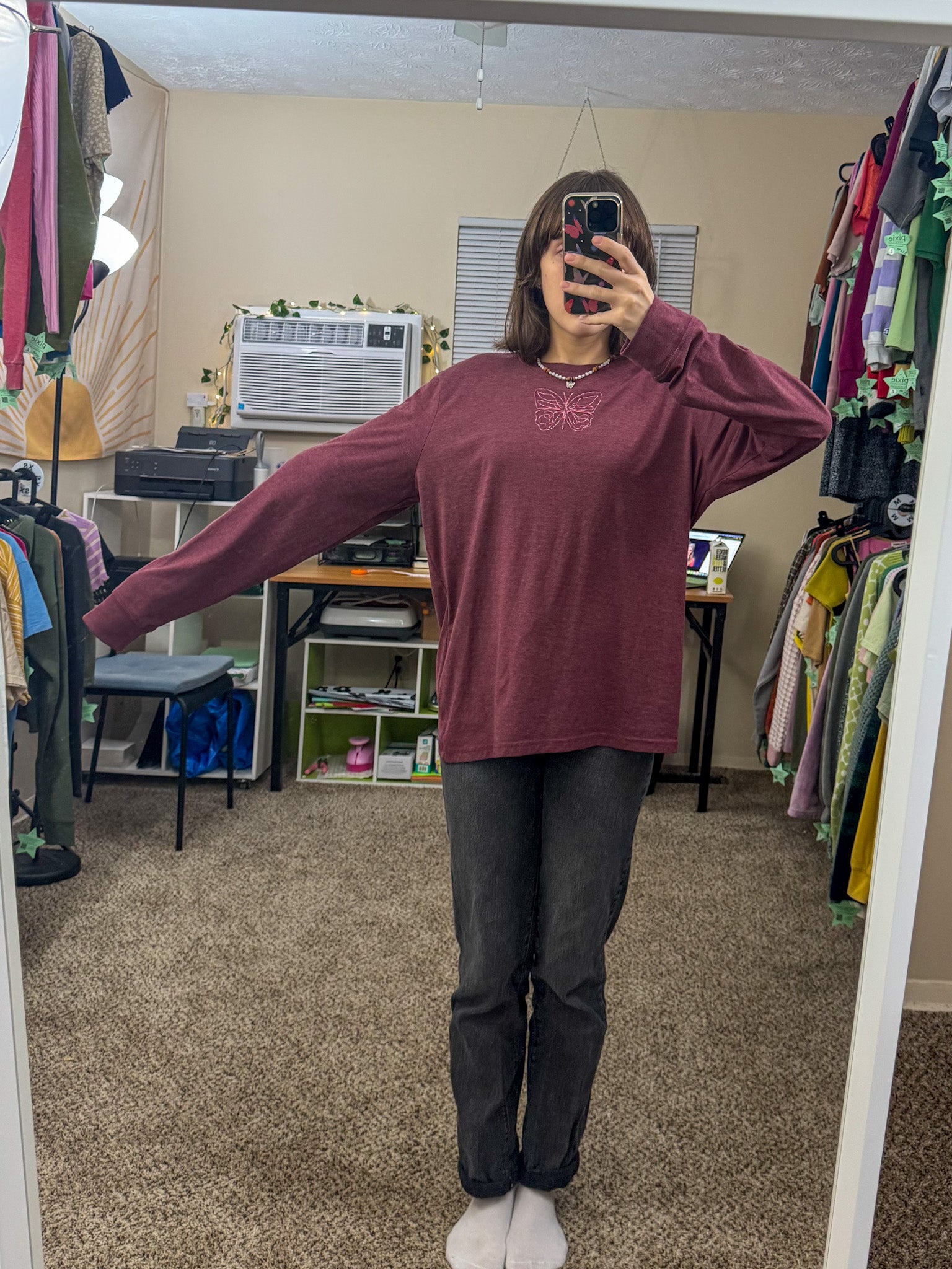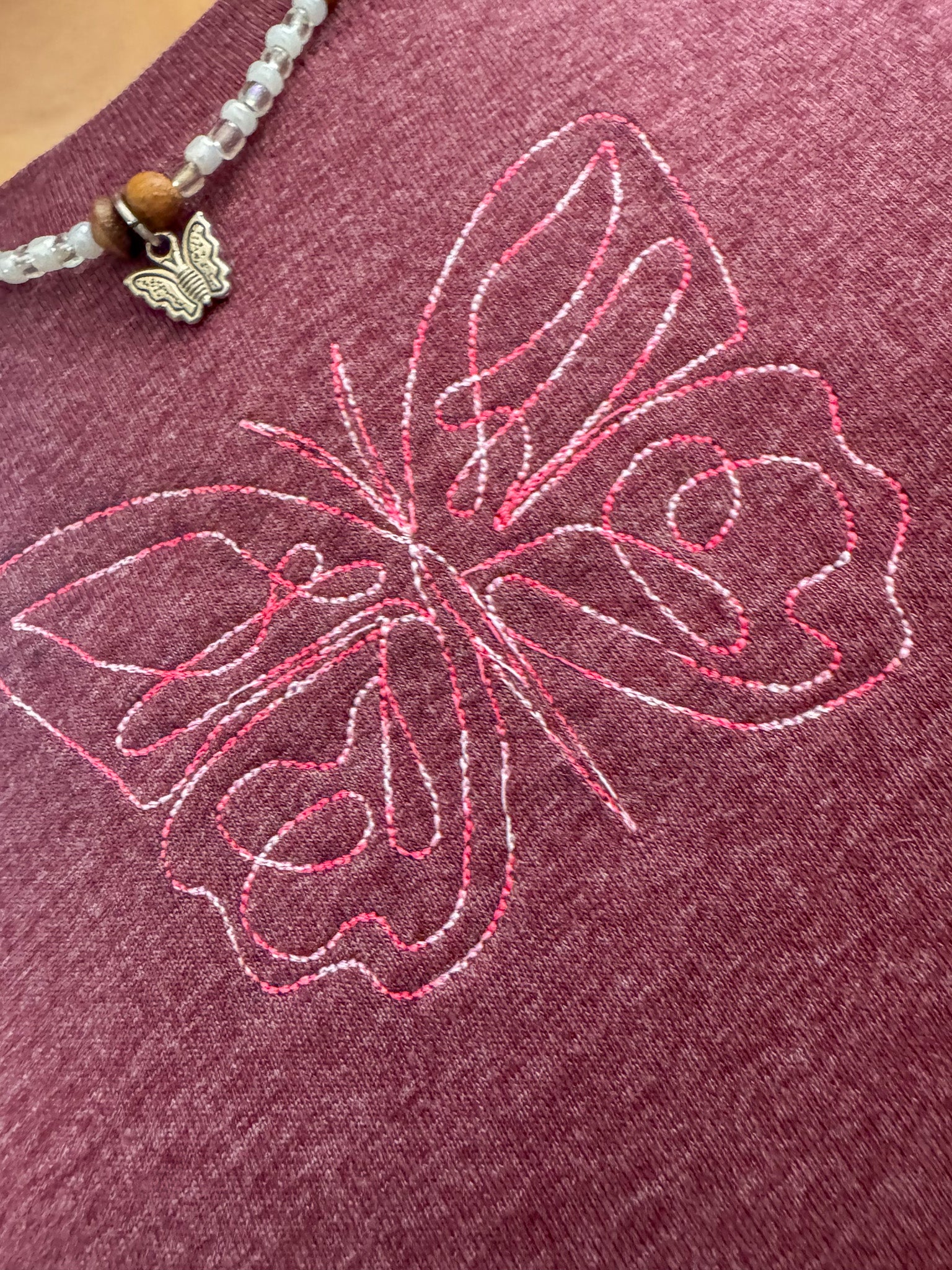 Be the life of any party with our One Line Butterfly Long Sleeve! Unique and playful, this top is embroidered by us, making it one-of-a-kind. Not only will you look good, but you'll also be supporting our small business and sustainable fashion by wearing an upcycled, secondhand garment. Slow fashion never looked so good!