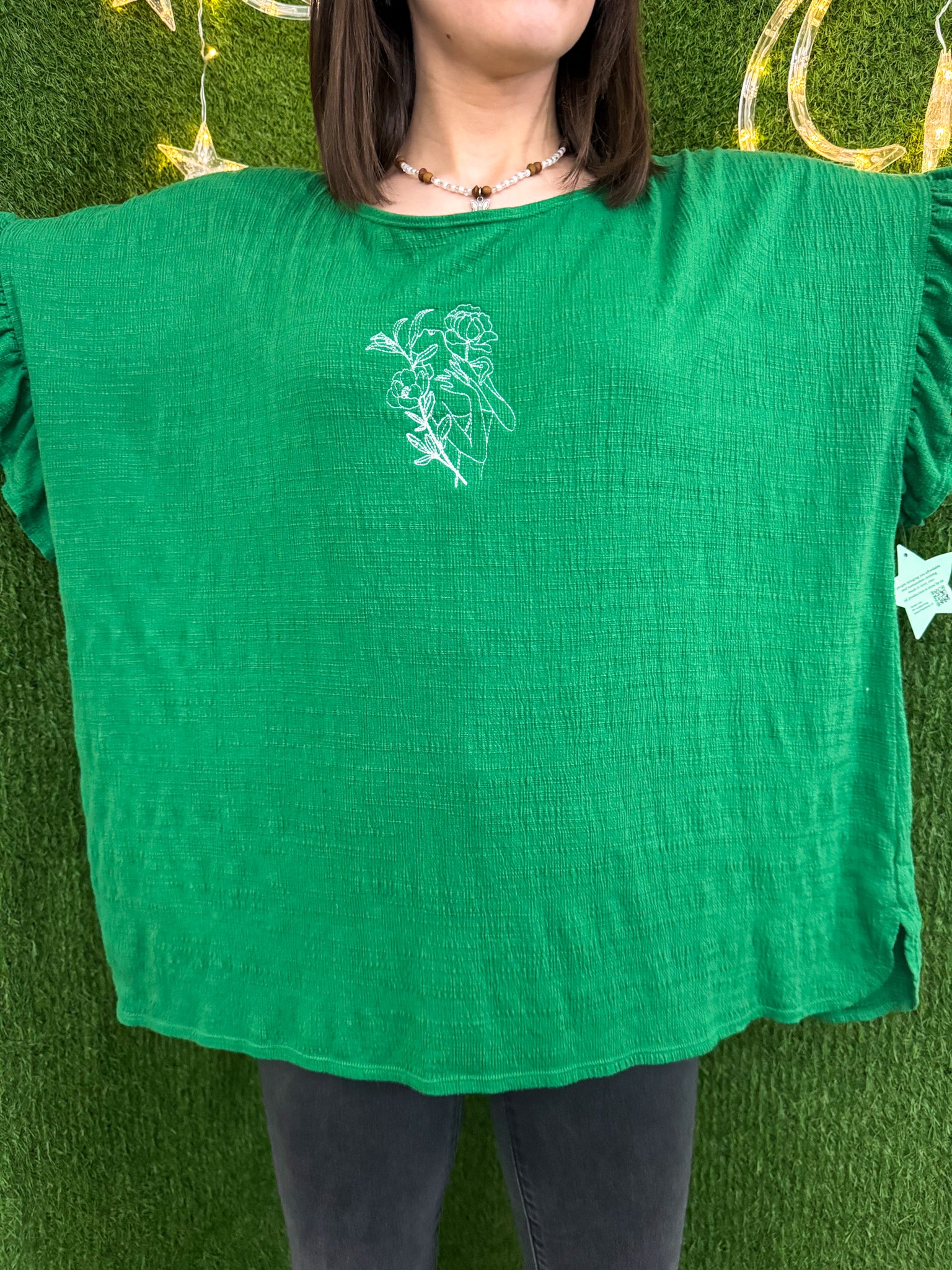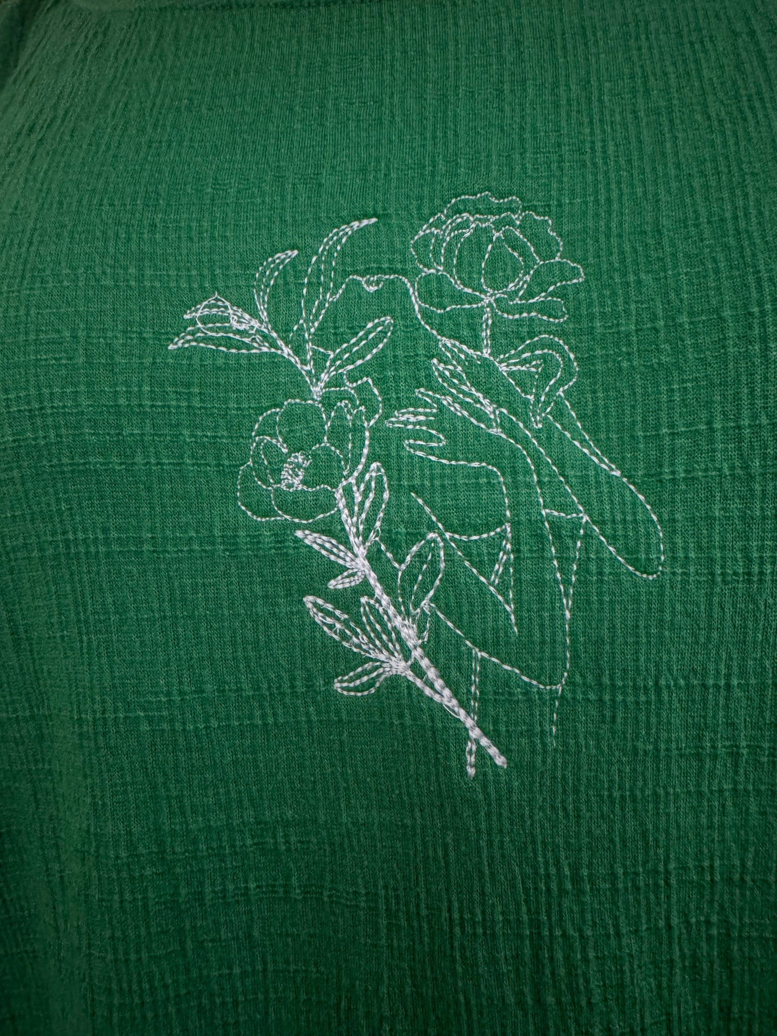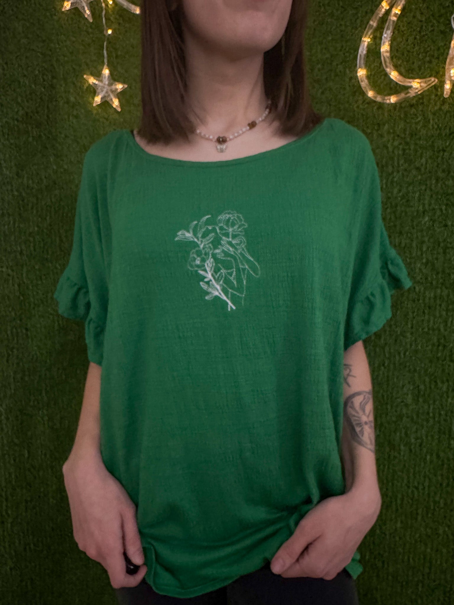 Rock your sustainable style with our One Line Woman Green Ruffled Sleeve Tee! This upcycled, secondhand garment features delicate embroidery and supports our small biz. Embrace slow fashion and make a statement!