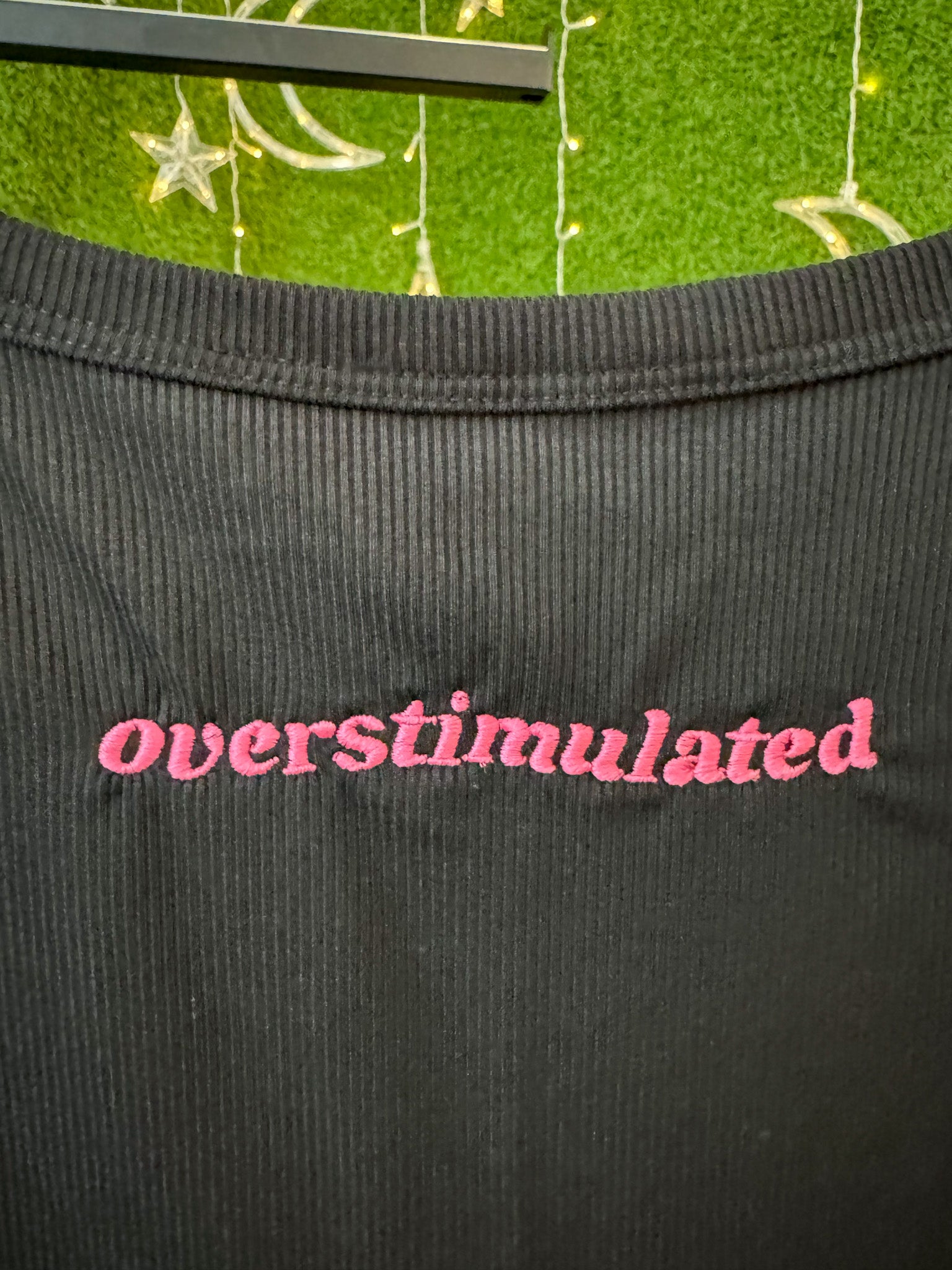 Embrace conscious style with our Overstimulated Black Tank. This unique piece features custom embroidery on a carefully selected secondhand garment, giving new life to existing materials. By choosing this upcycled tank, you're supporting sustainable slow fashion practices and our small business commitment to reducing textile waste. This item represents thoughtful creation over mass production!
