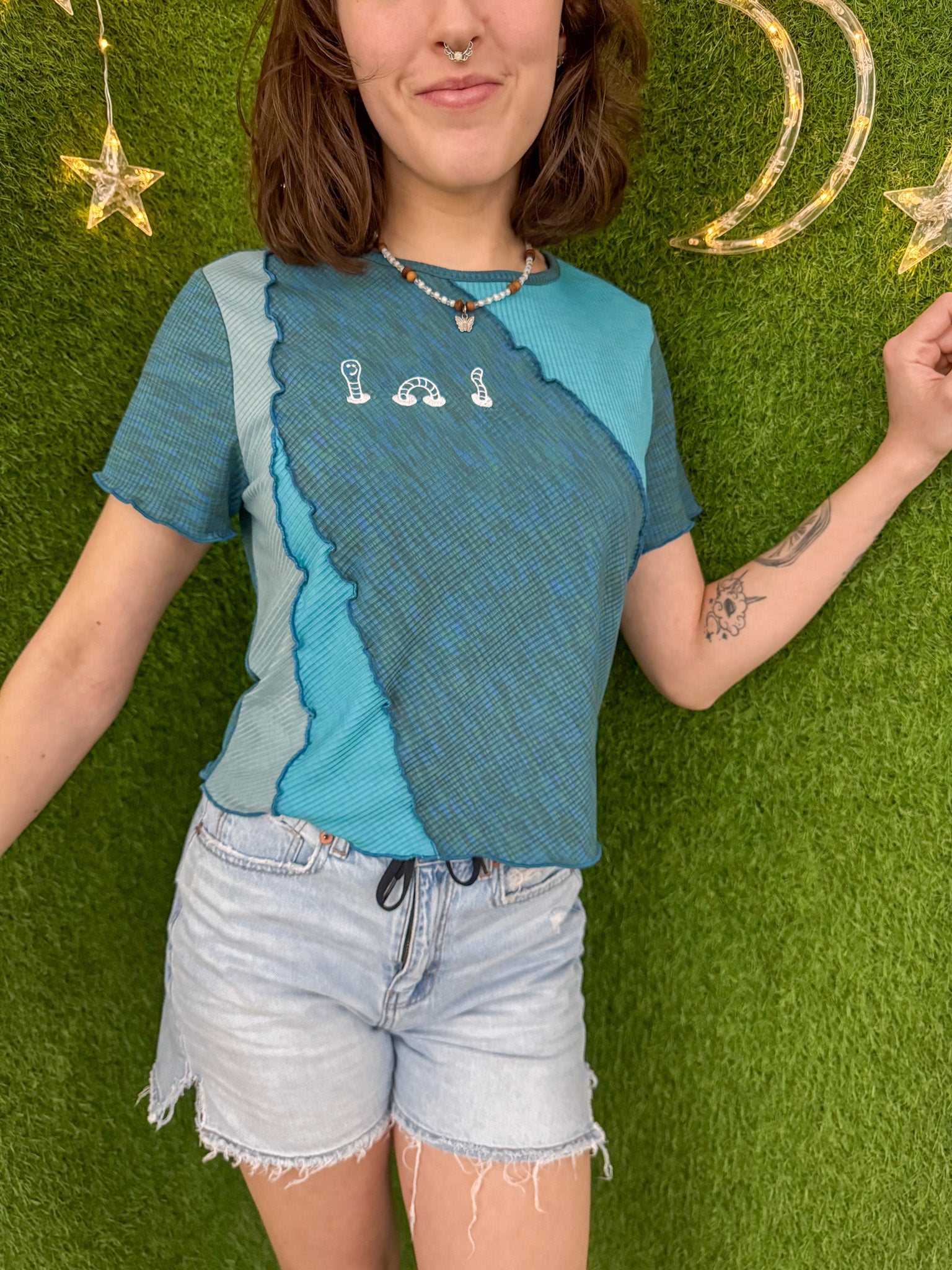 Support sustainable fashion with our Patchwork Worm Blue Baby Tee. This embroidered, upcycled, and slow fashion piece was made with a secondhand garment to reduce waste and supports our small business!