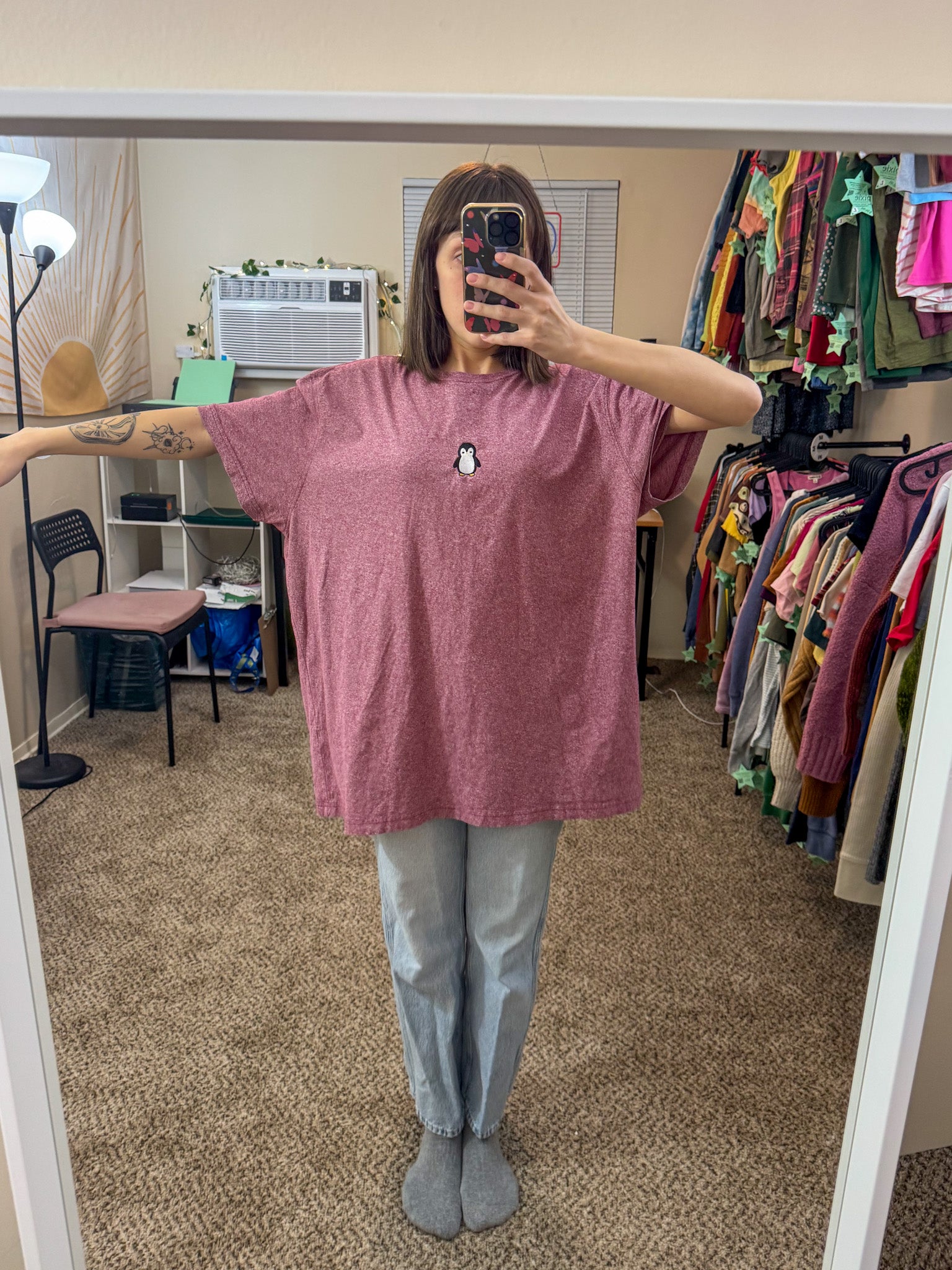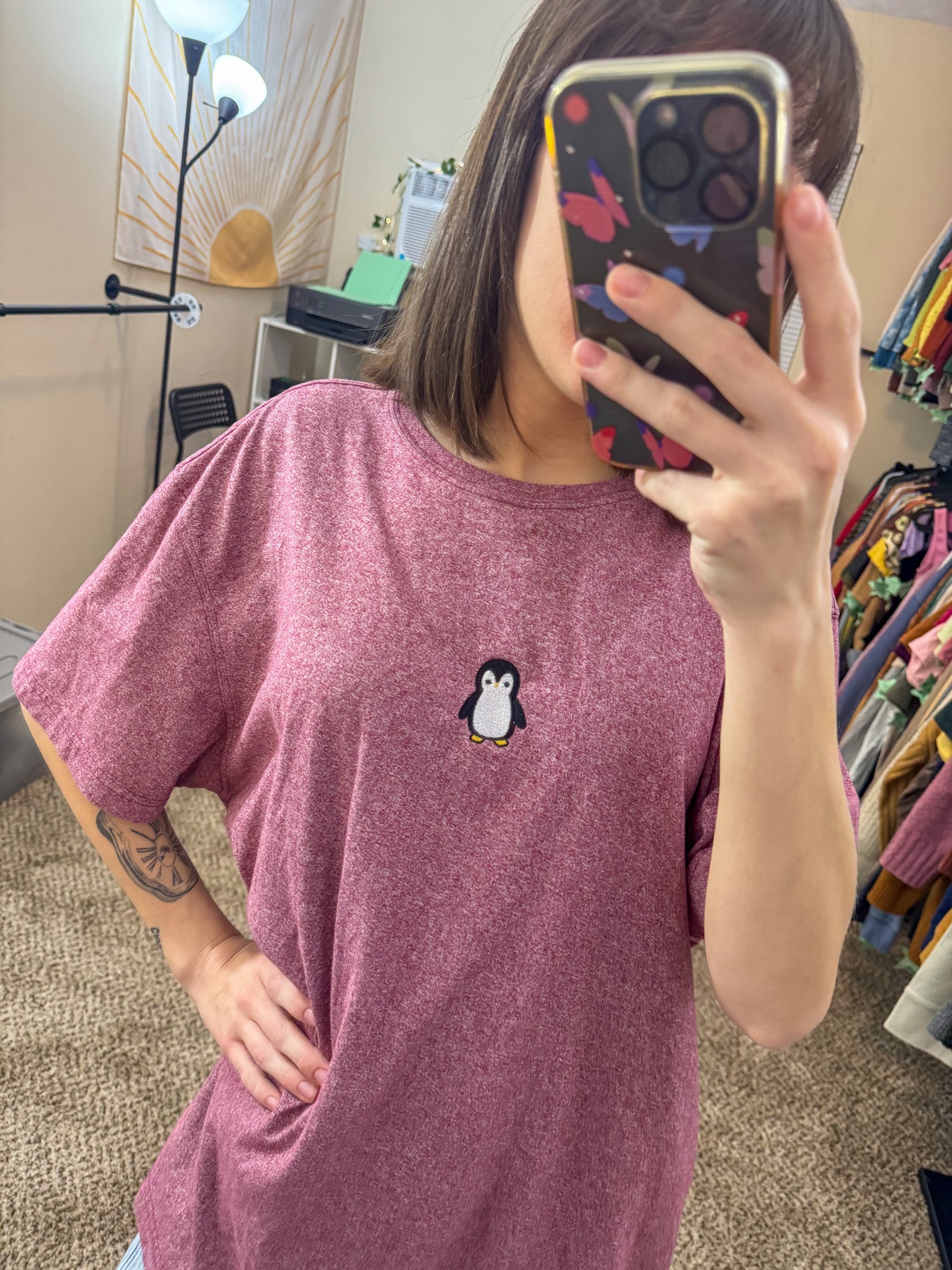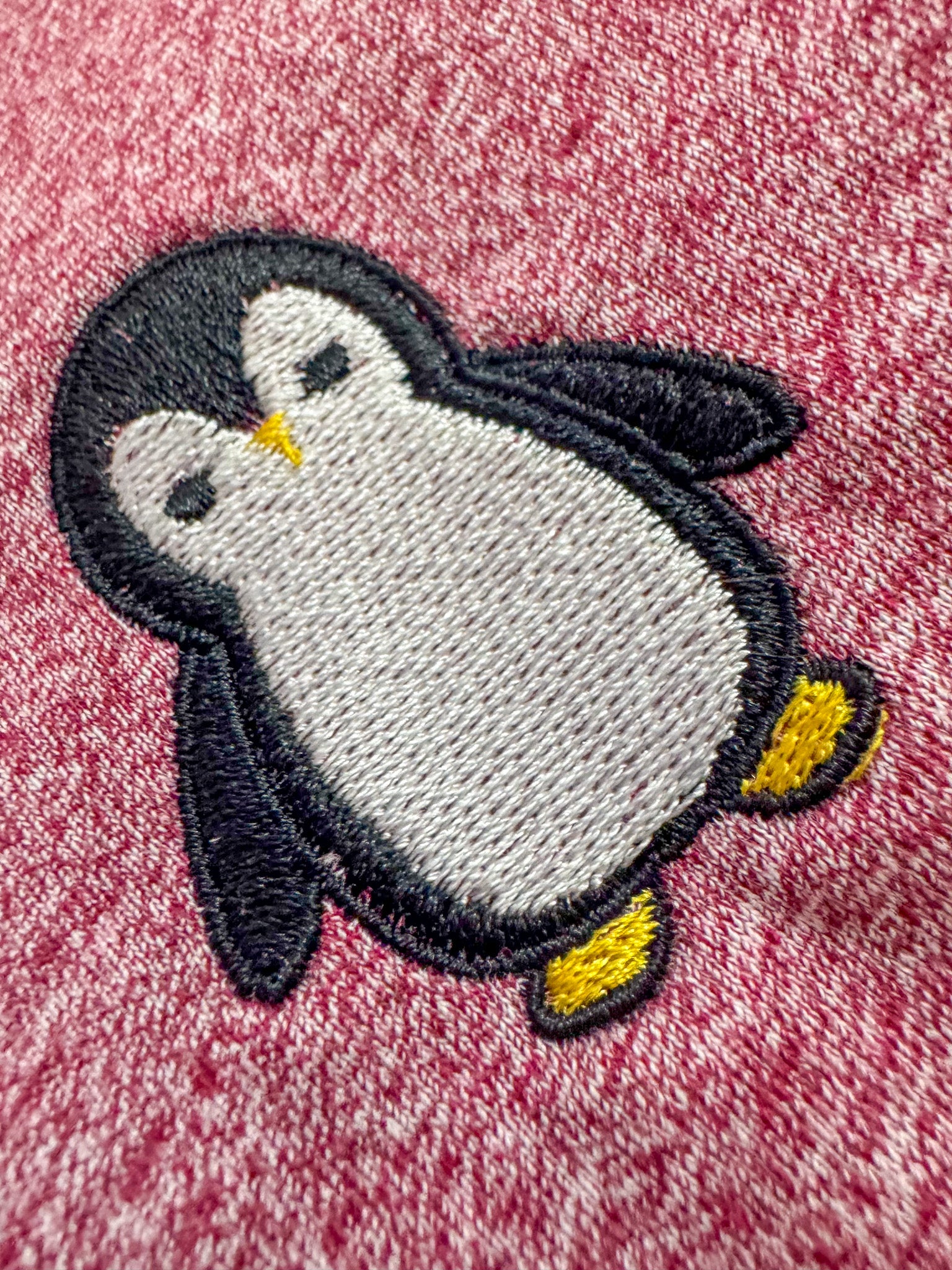 Rock a unique look with our Penguin Maroon T-Shirt! Embroidered and upcycled by us, this discarded secondhand garment is both sustainable and slow fashion. Support our small biz in style!
