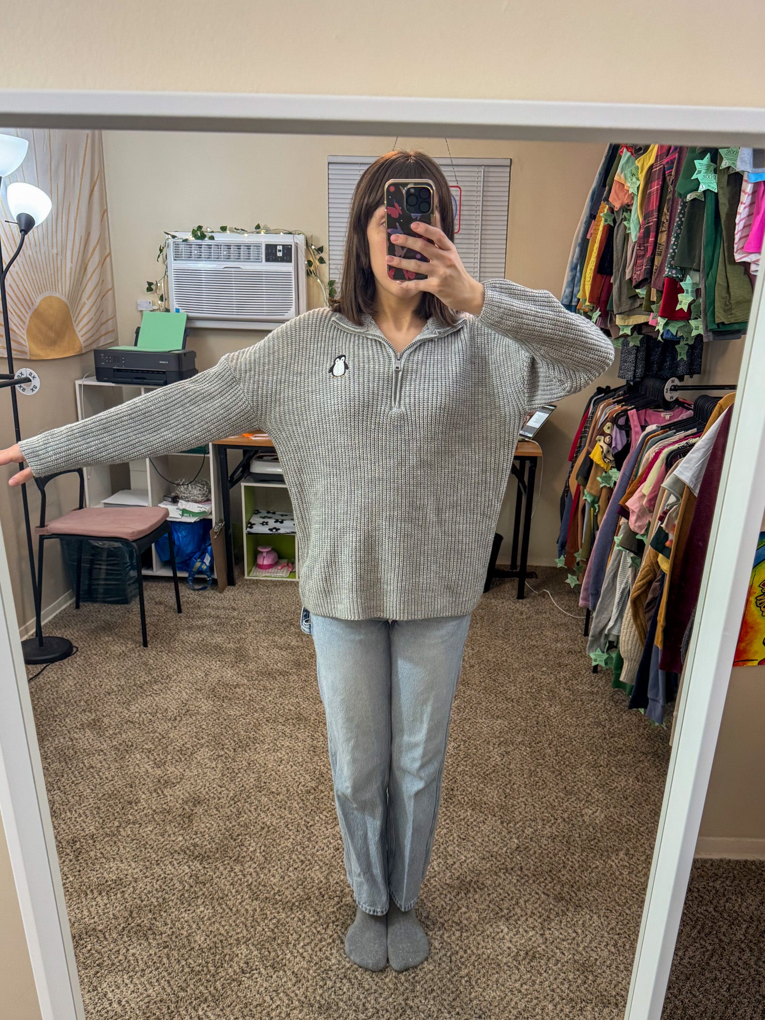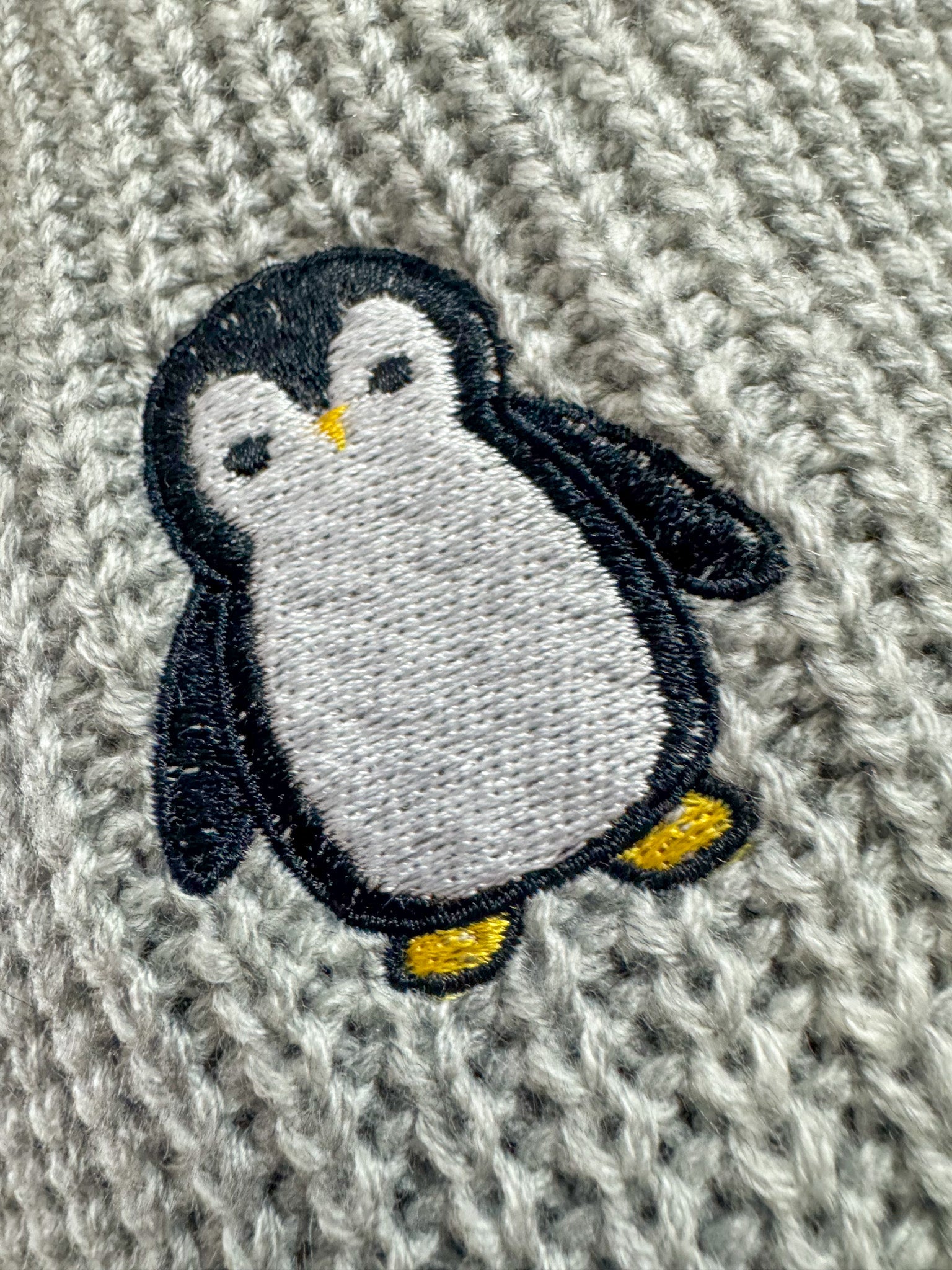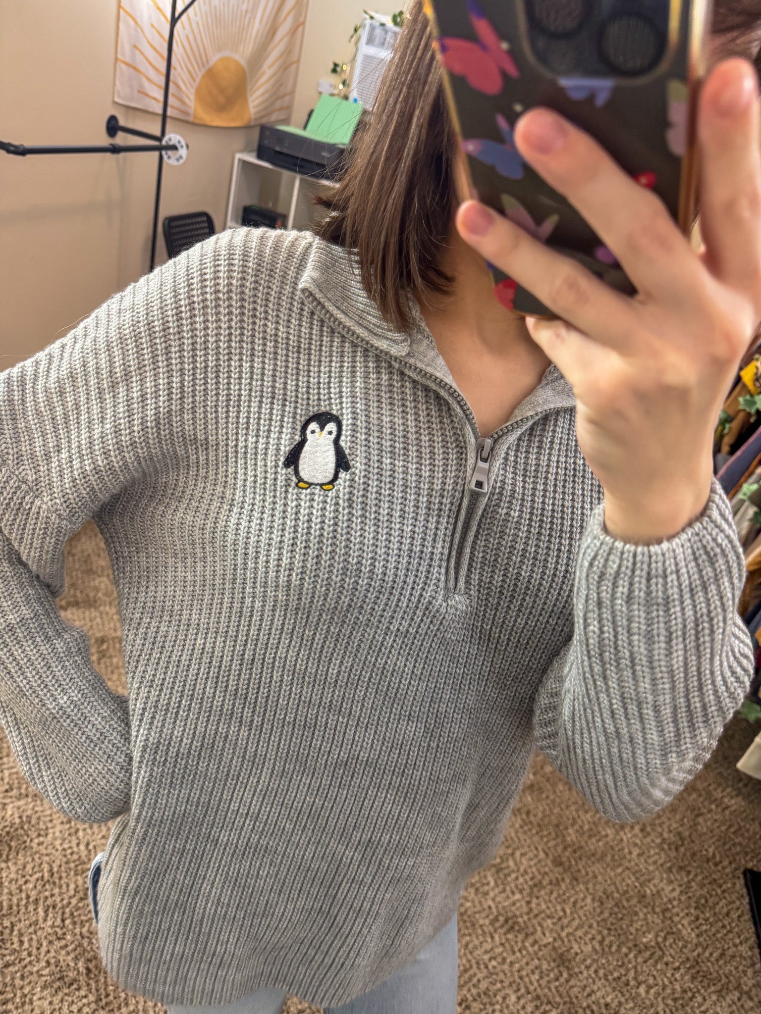 This playful penguin quarter zip sweater is not only embroidered by us, but also supports our small biz. As an added bonus, it's upcycled and made from discarded secondhand garments, making it a sustainable and trendy choice for slow fashion lovers.