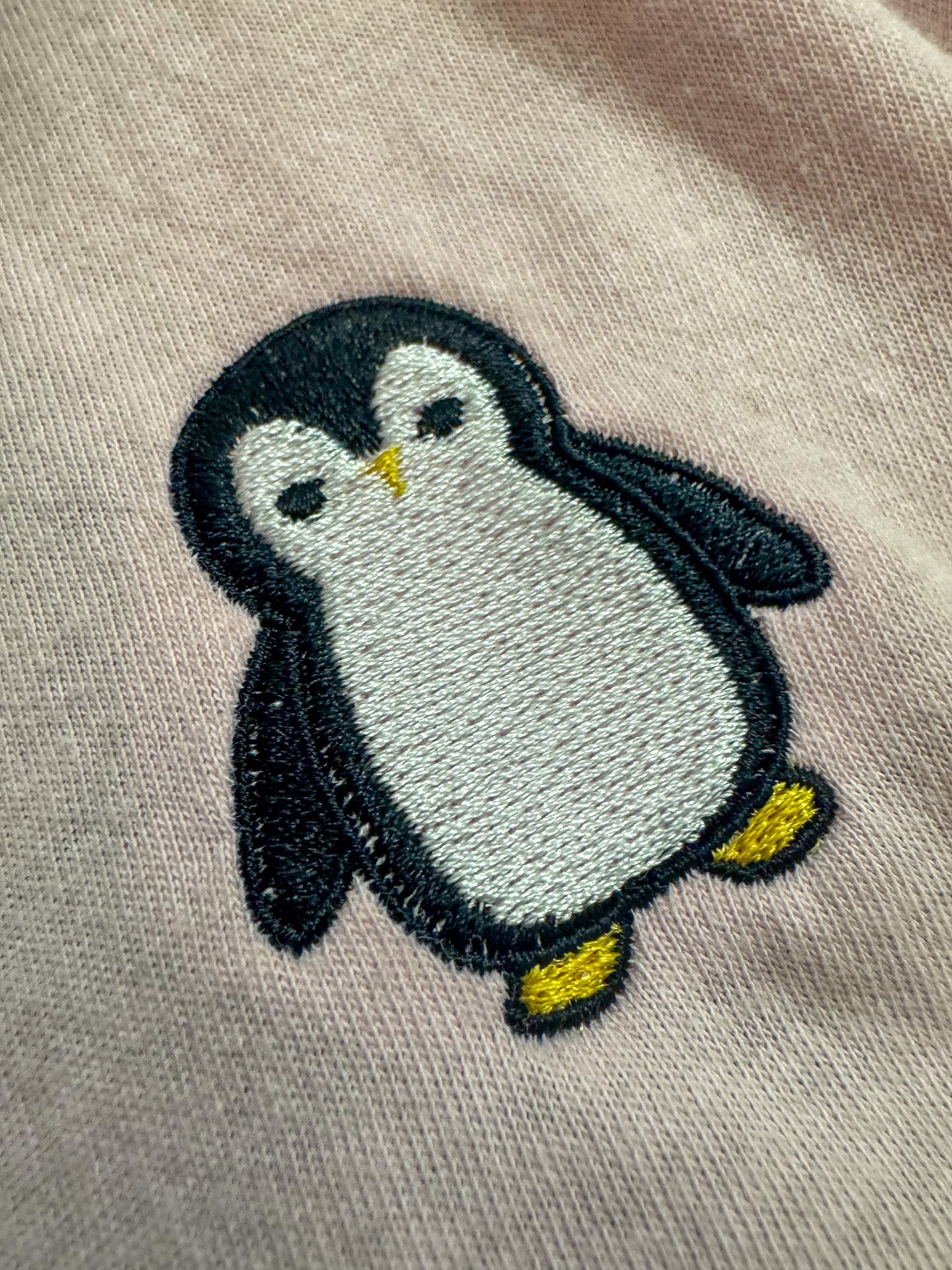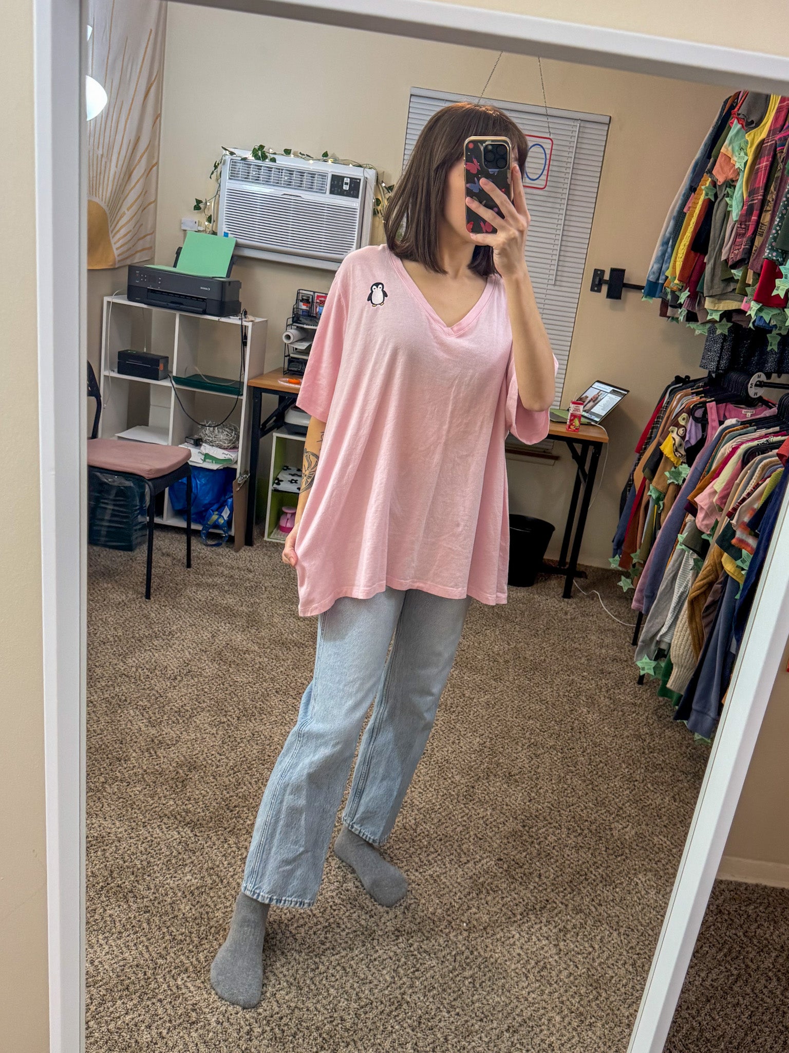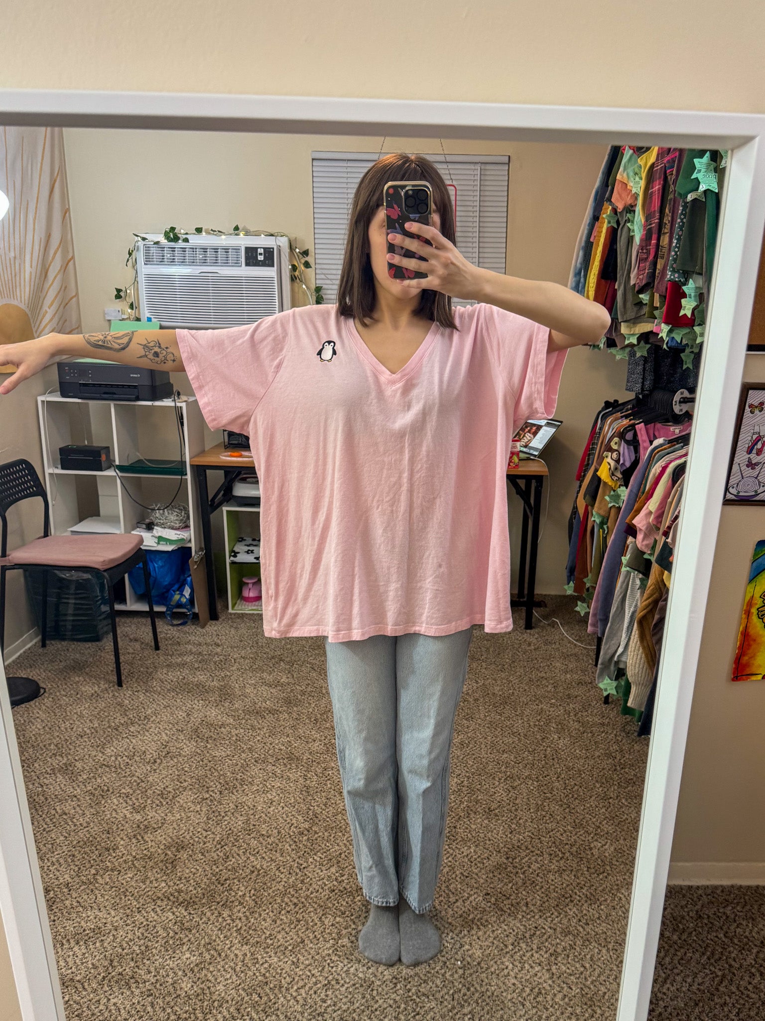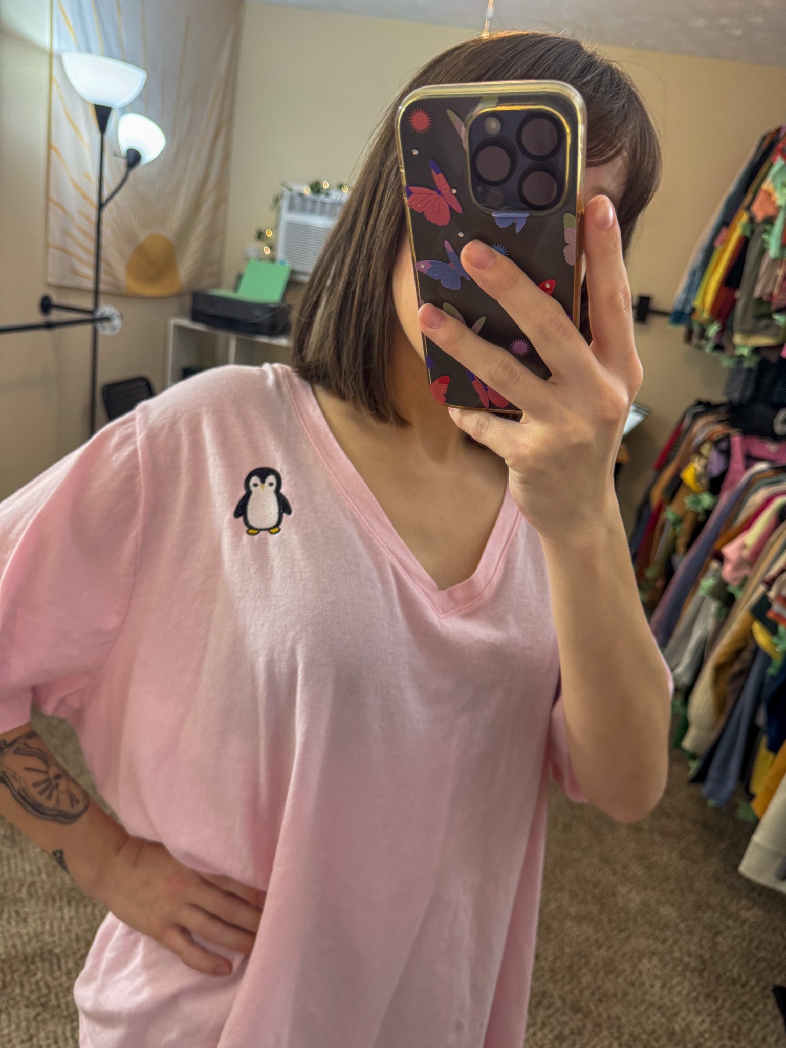 Join the flock in our Penguin V-Neck Pink T-Shirt, lovingly embroidered and upcycled by us. Support sustainability and slow fashion with this discarded secondhand garment, proudly representing our small biz!