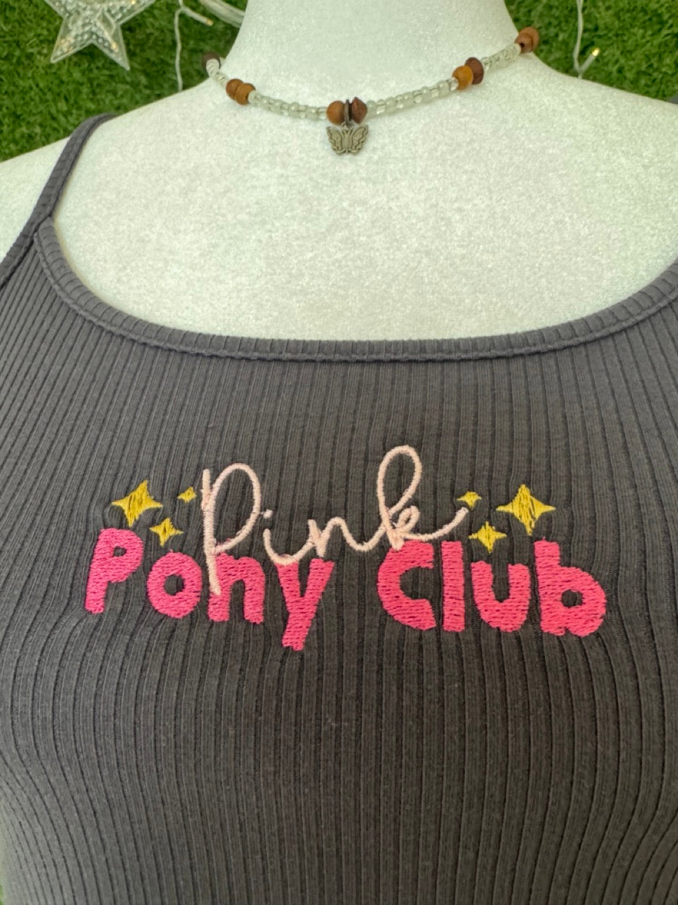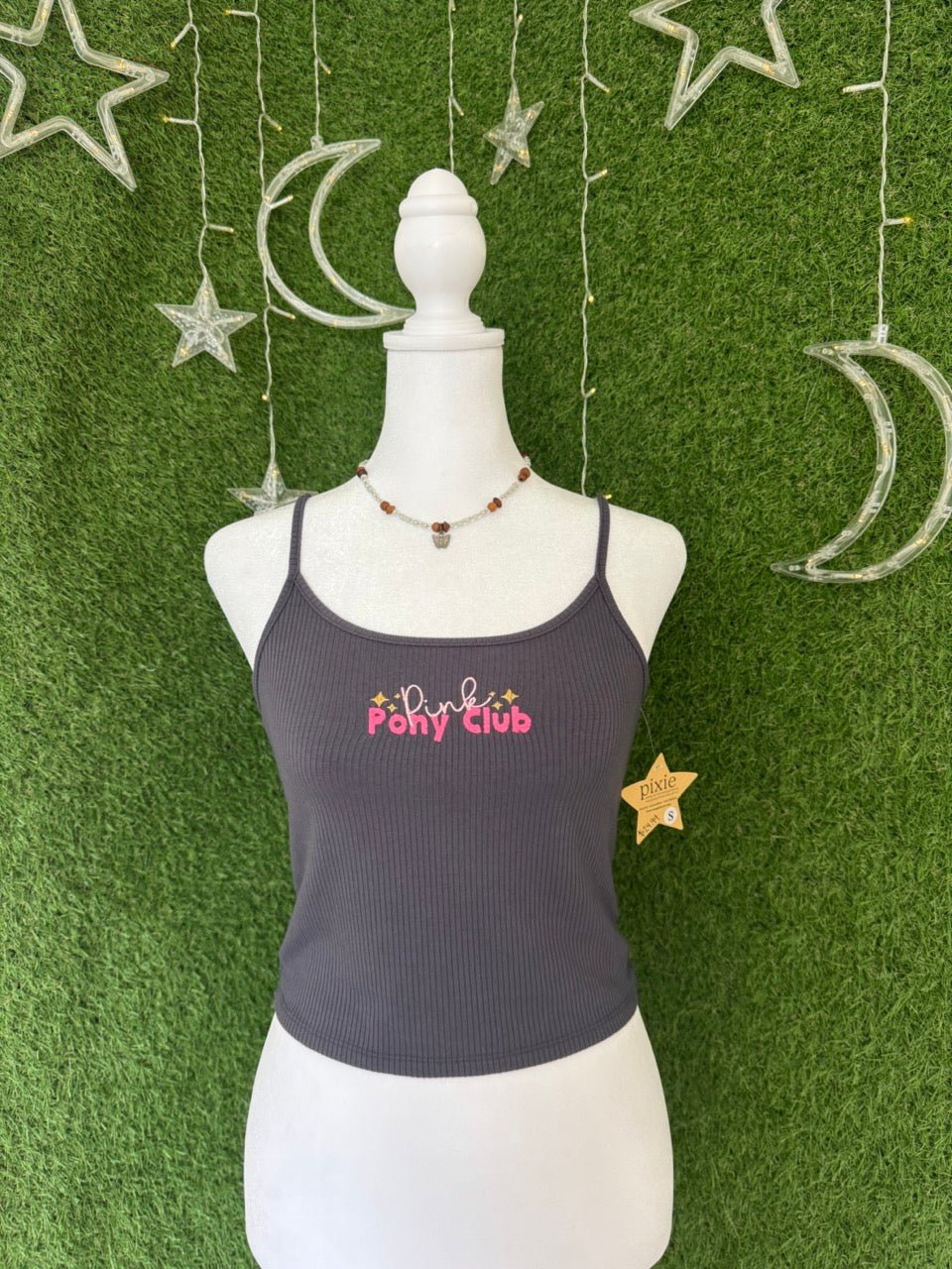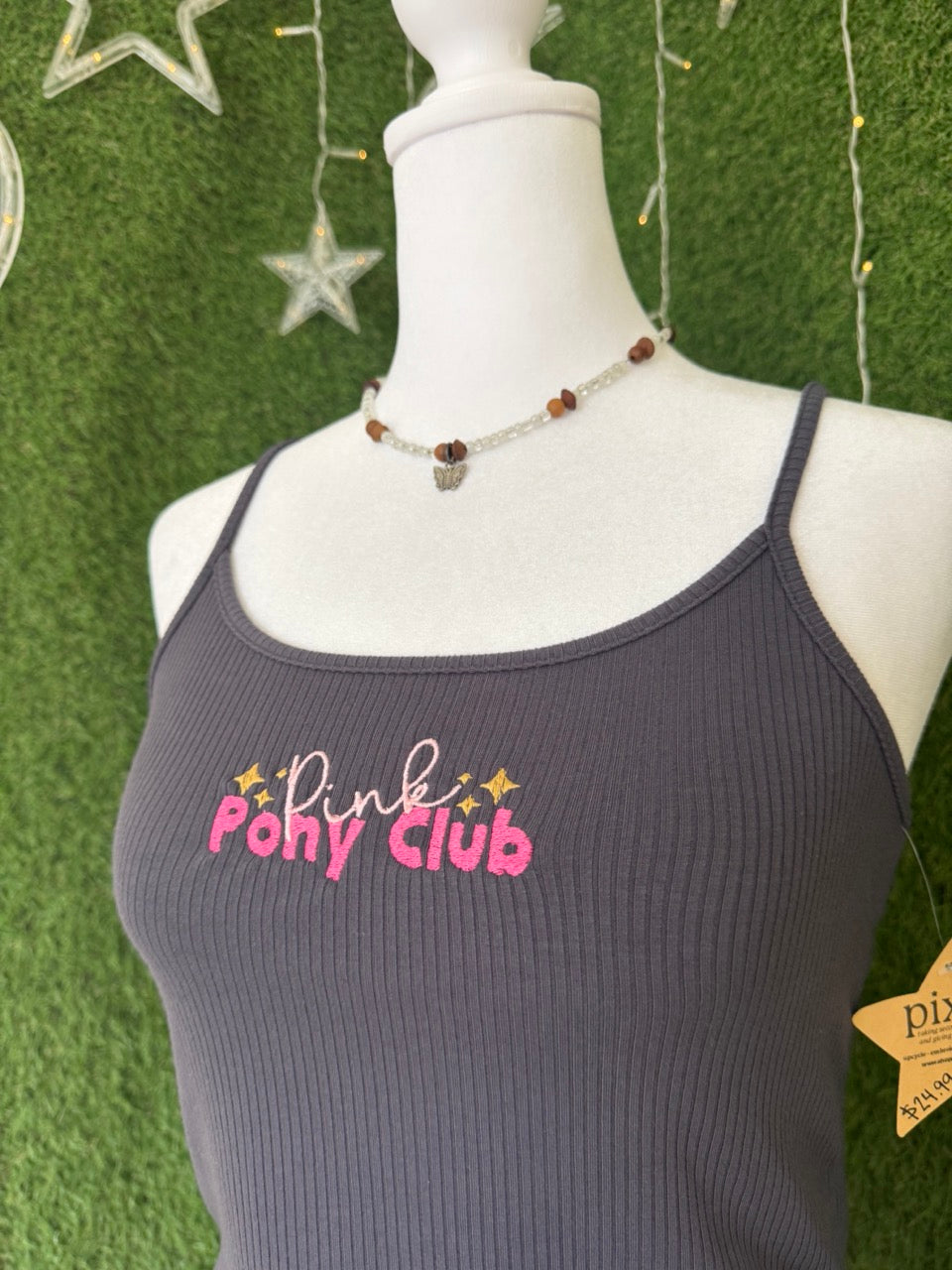 Make a statement with this Pink Pony Club Cropped Grey Tank, crafted from a lovingly upcycled secondhand garment. Embracing slow fashion, this piece features unique embroidered details that add a charming, personal touch. Perfect for those who love sustainable style with a playful twist!