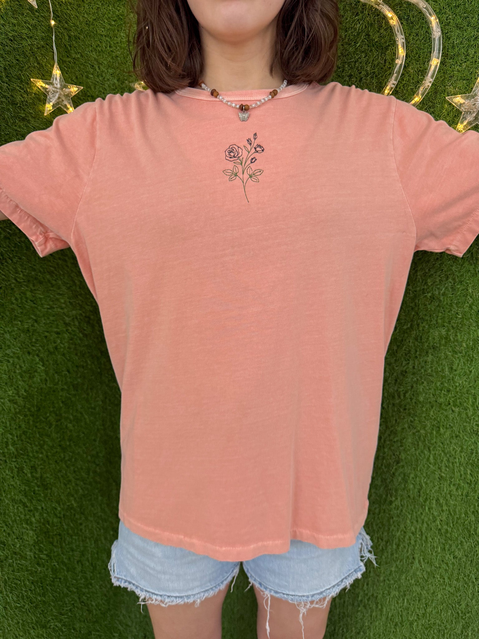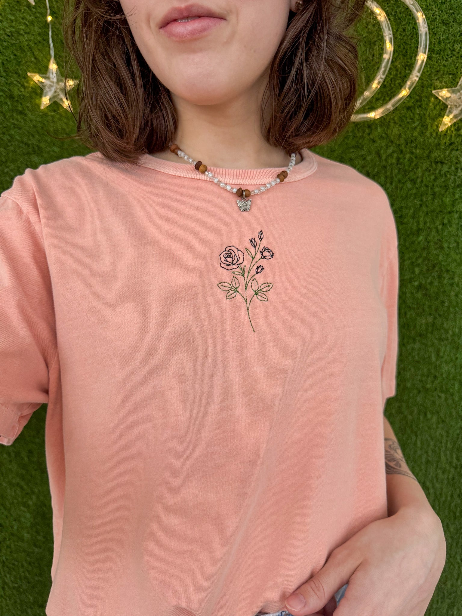 Support our small biz with this Pink Rose T-Shirt. Upcycled from a secondhand garment, this top embodies sustainable, slow fashion. Complete with delicate embroidery, it's a conscious choice for your wardrobe!