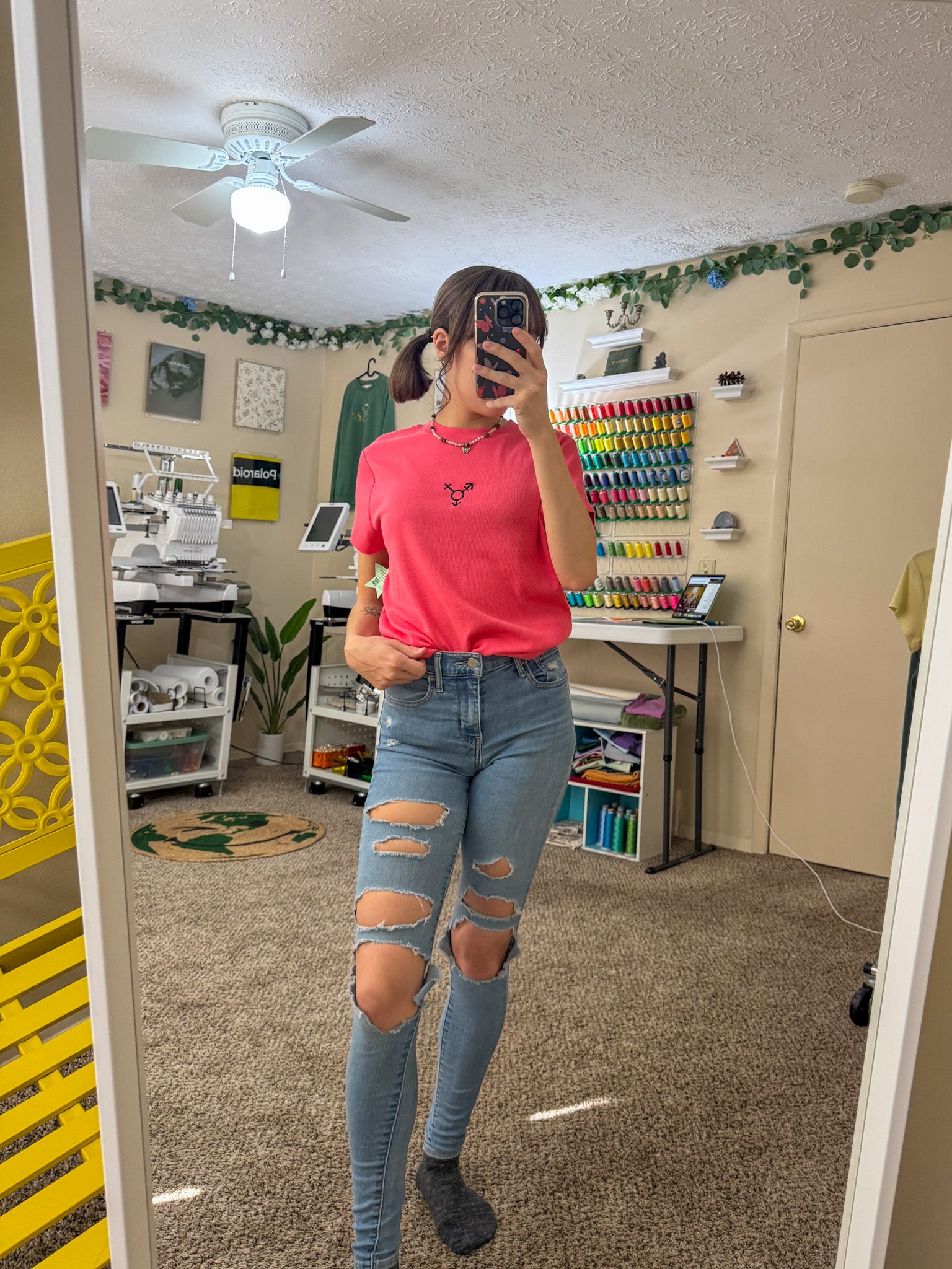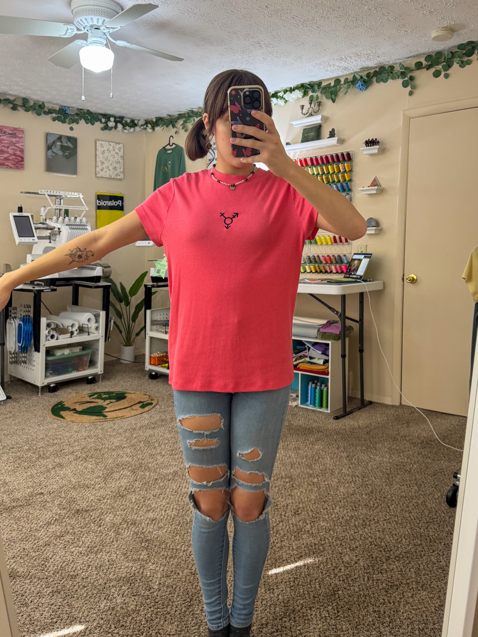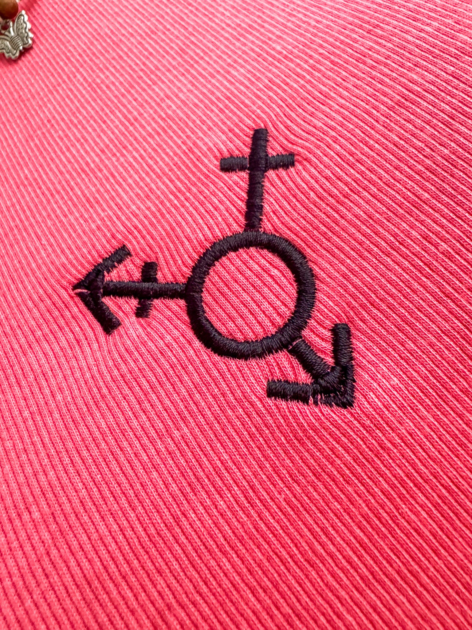 Looking for a unique addition to your wardrobe? Look no further than our Pink Transgender T-Shirt! Each shirt is lovingly embroidered by us, supporting our small biz and promoting sustainable, slow fashion. Plus, made from upcycled, discarded secondhand garments, you can feel good about your fashion choices.