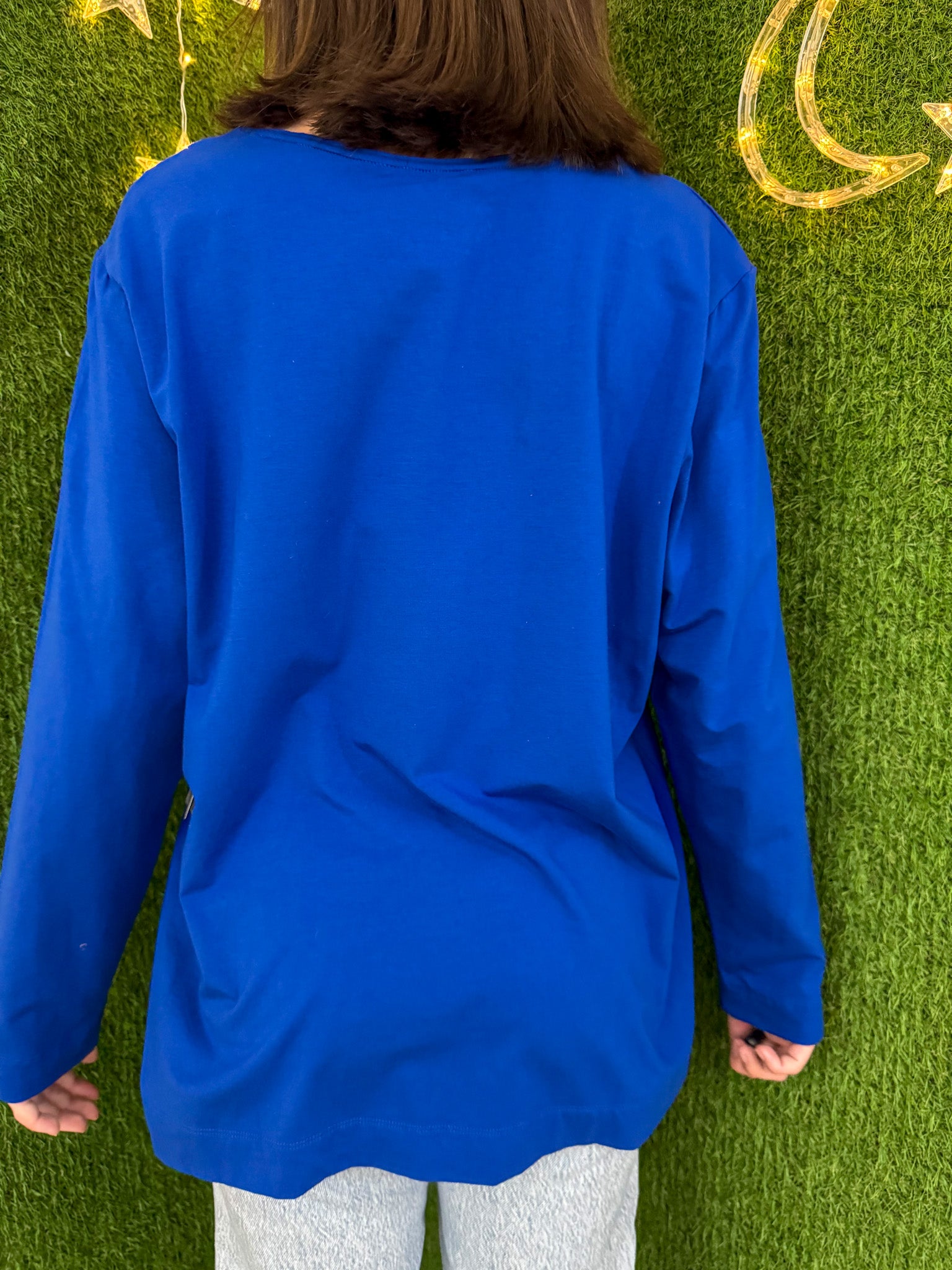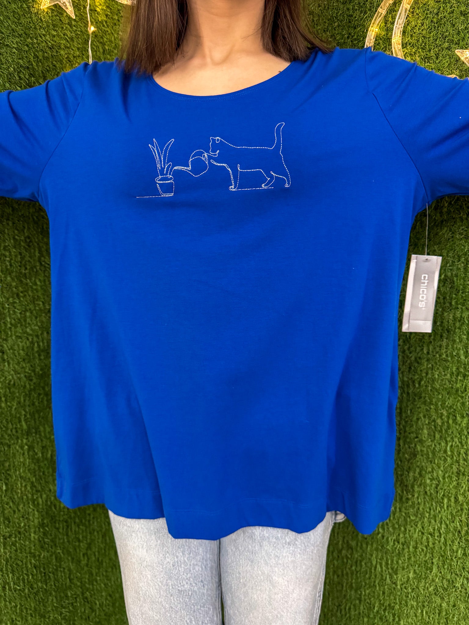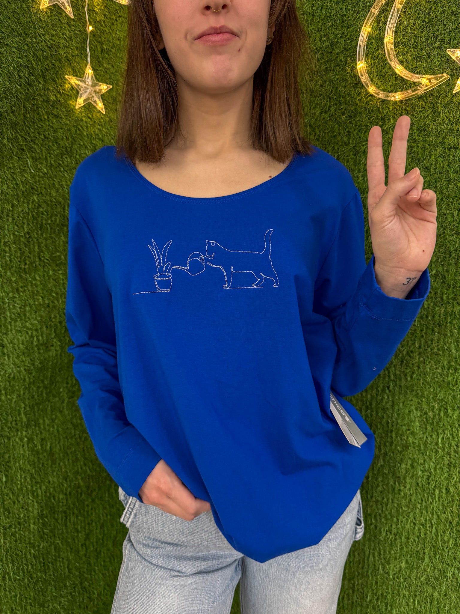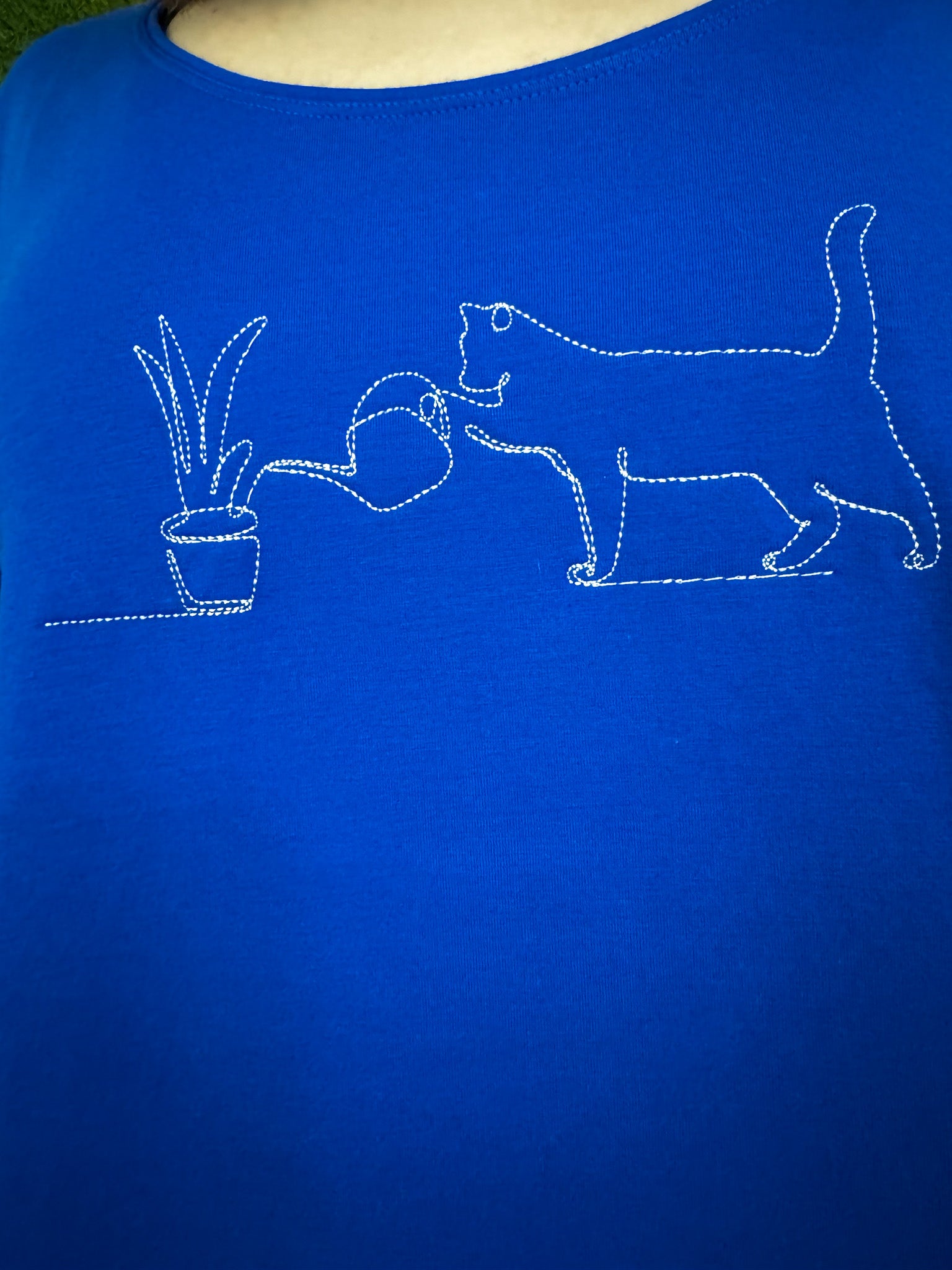 Add some quirky flair to your wardrobe with this one-of-a-kind Plant Cat Blue Long Sleeve! Featuring unique embroidery and made with upcycled materials, this sustainable and sustainable piece supports our small biz and promotes slow fashion<3