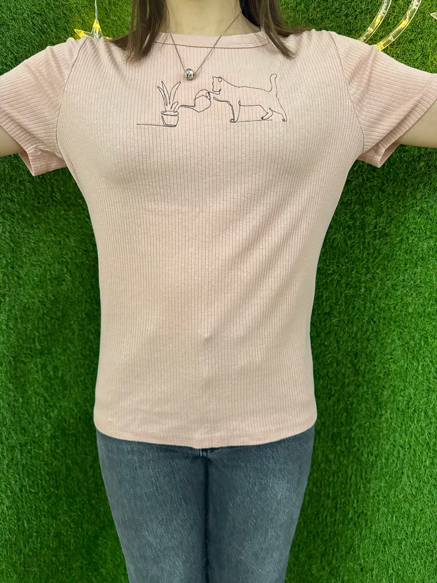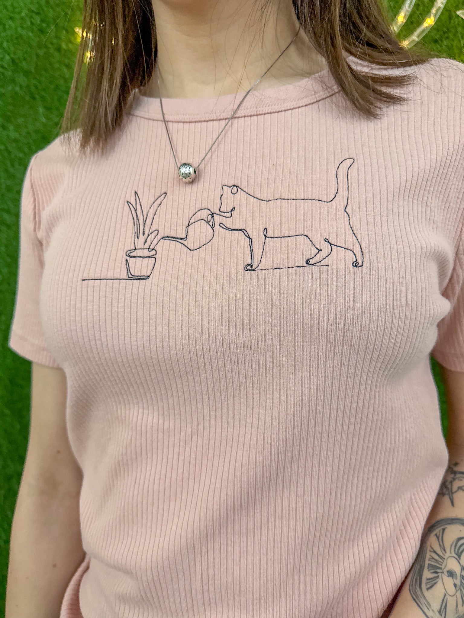 Upgrade your wardrobe with our Plant Cat Pink Ribbed T-Shirt. This embroidered shirt not only shows your support for small businesses, but it is also upcycled, making it a sustainable and slow fashion choice. Feel good and look good in this secondhand garment!!
