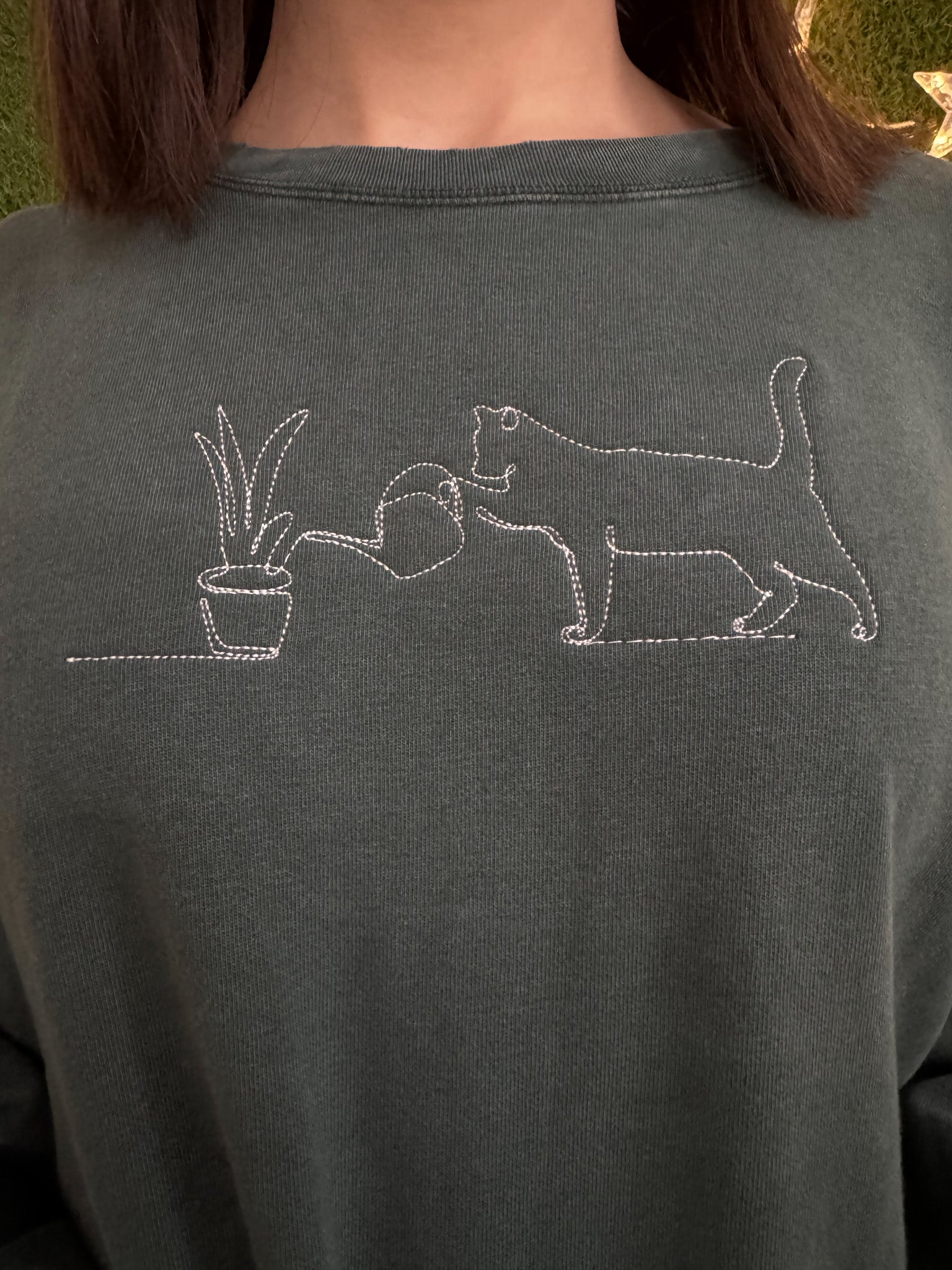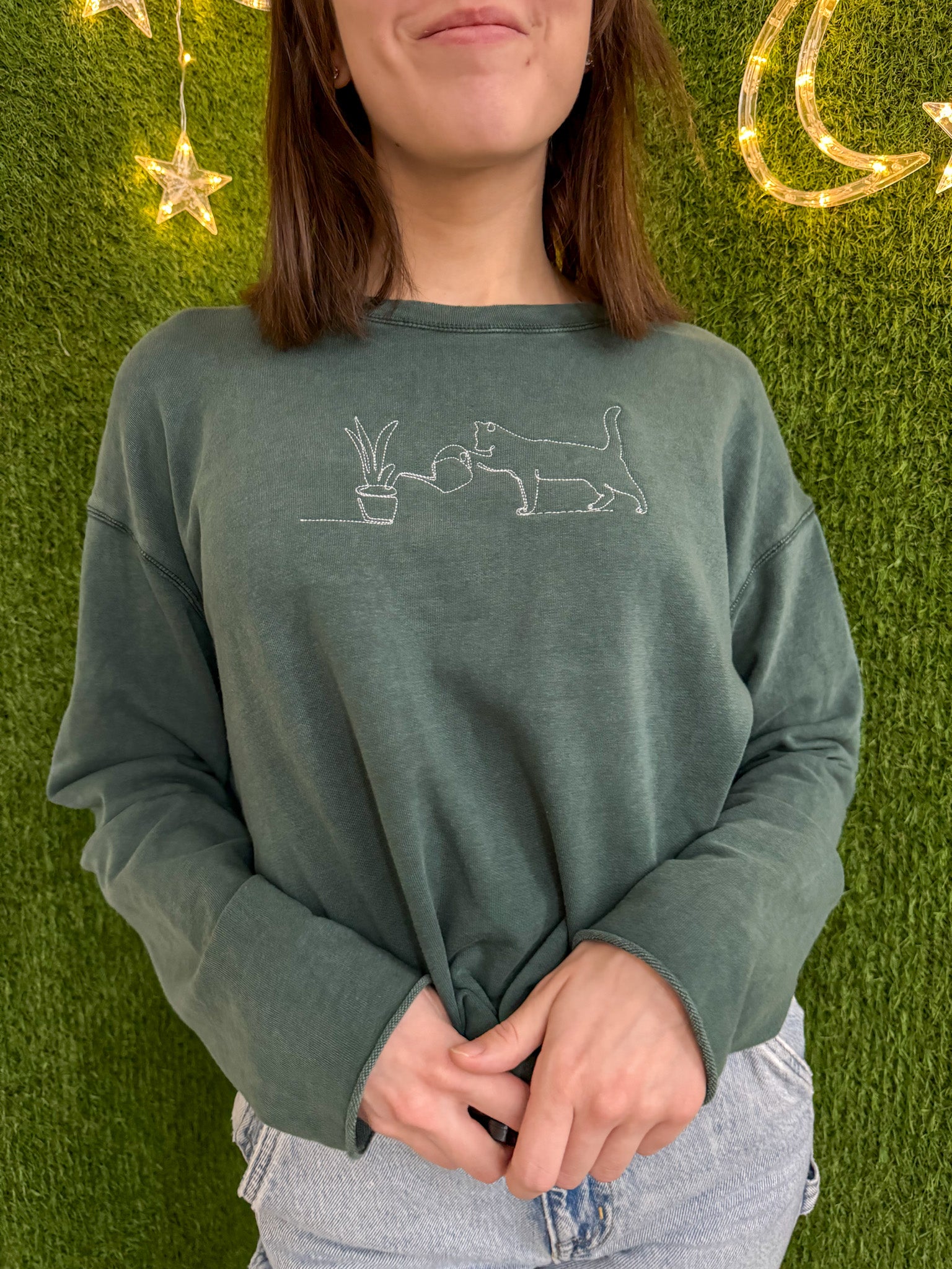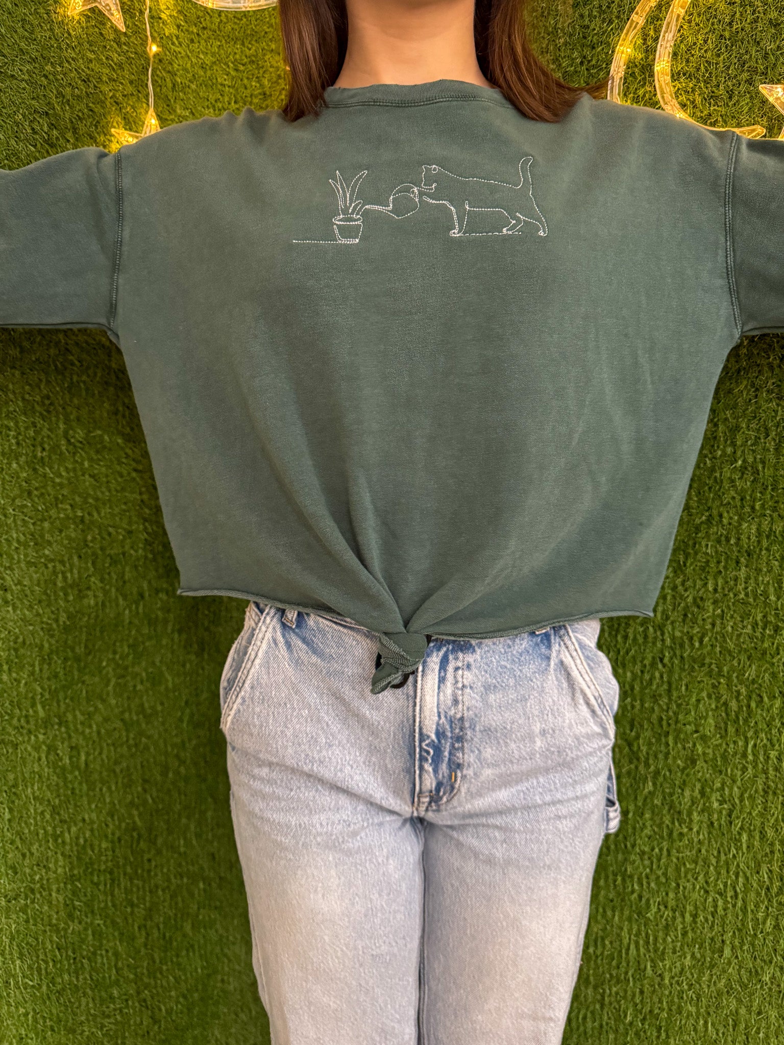 Get ready to purr-sonalize your style with our Plant Cat Tie Front Long Sleeve! Made from upcycled materials, this embroidered top is not only sustainable but also supports our small biz and slow fashion movement. It's the perfect addition to your wardrobe that's both fashionable and conscious<3