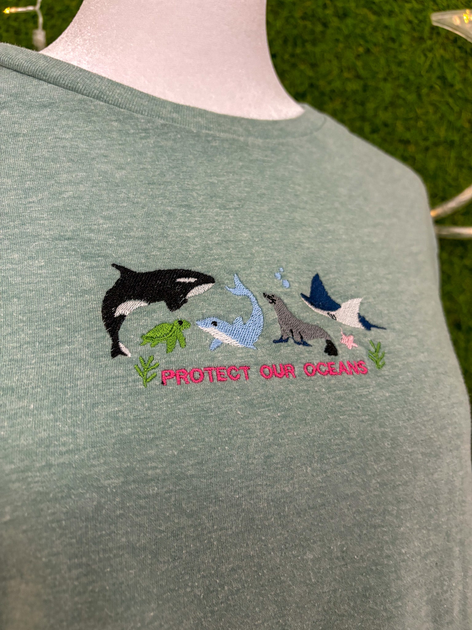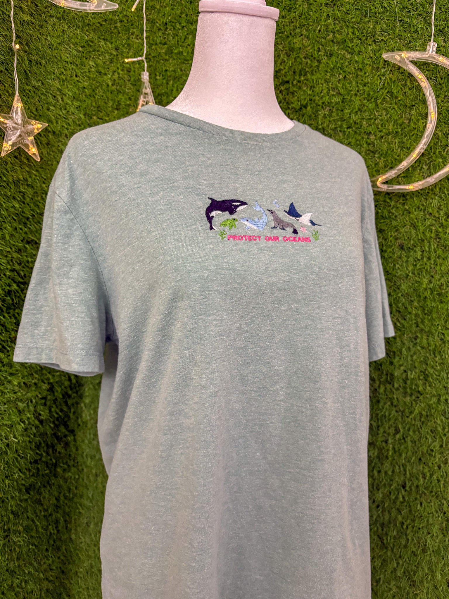 This embroidered green shirt is crafted from upcycled, secondhand materials, supporting sustainable slow fashion and small businesses while promoting ocean conservation!!