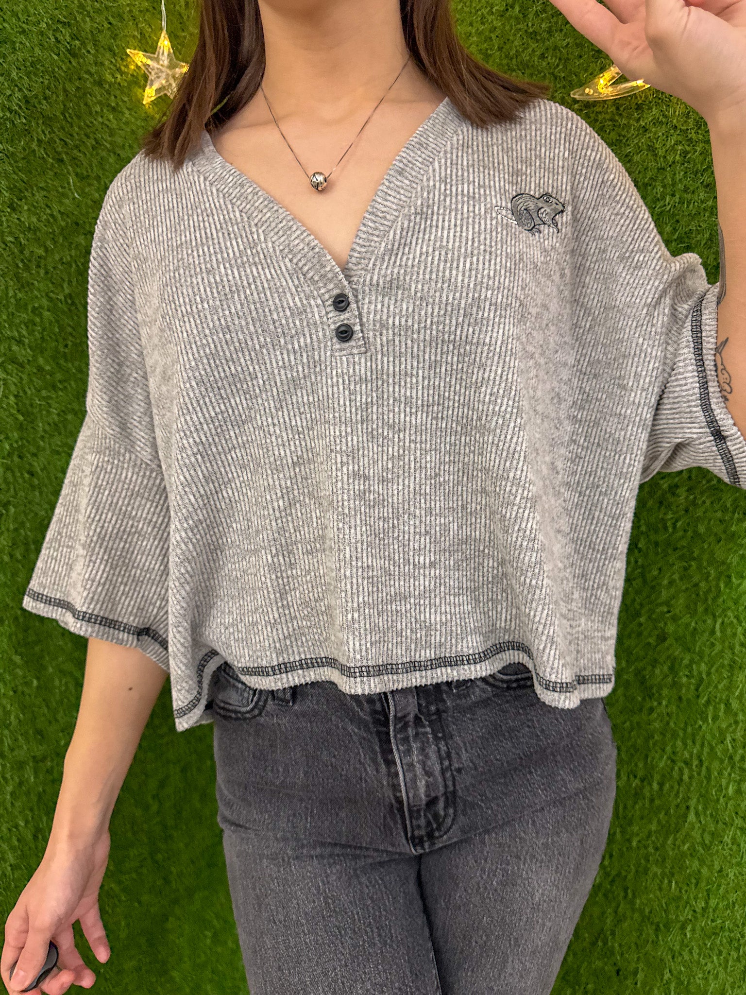 Show your love and support for small businesses while staying stylish in our Rat V-Neck Tee Cropped. This unique and sustainable piece is made from an upcycled secondhand garment and features beautiful embroidery. Embrace slow fashion with this one-of-a-kind design<3