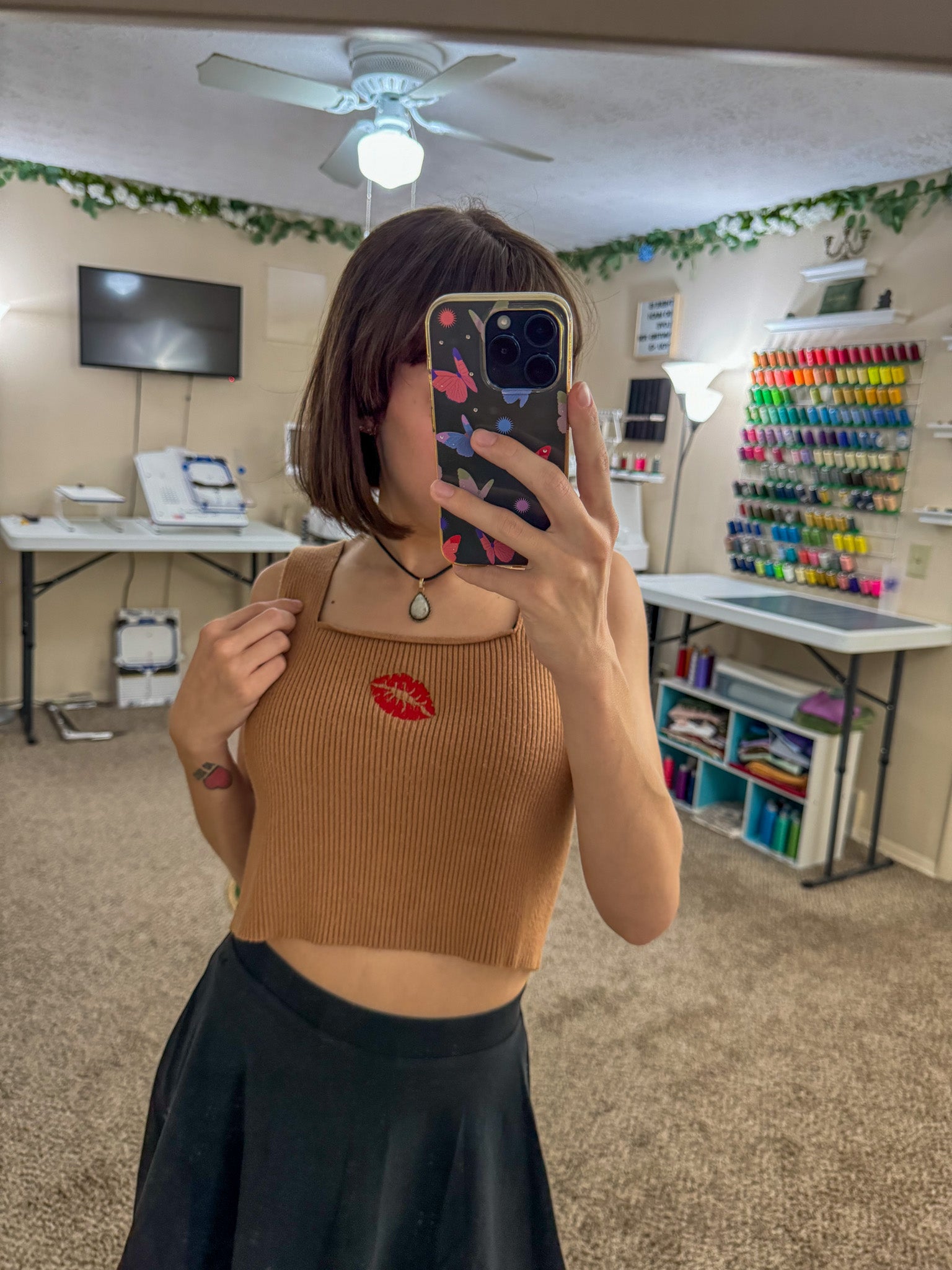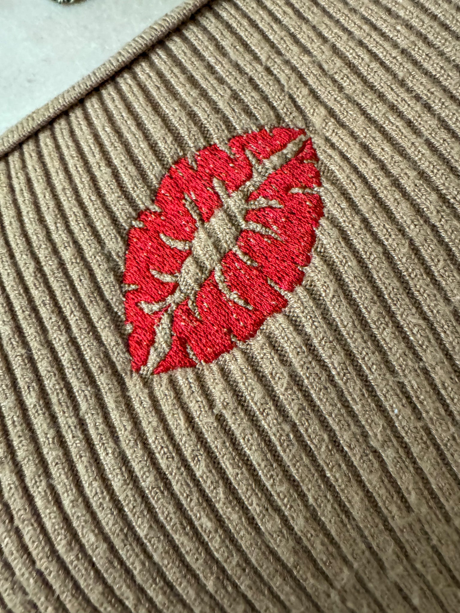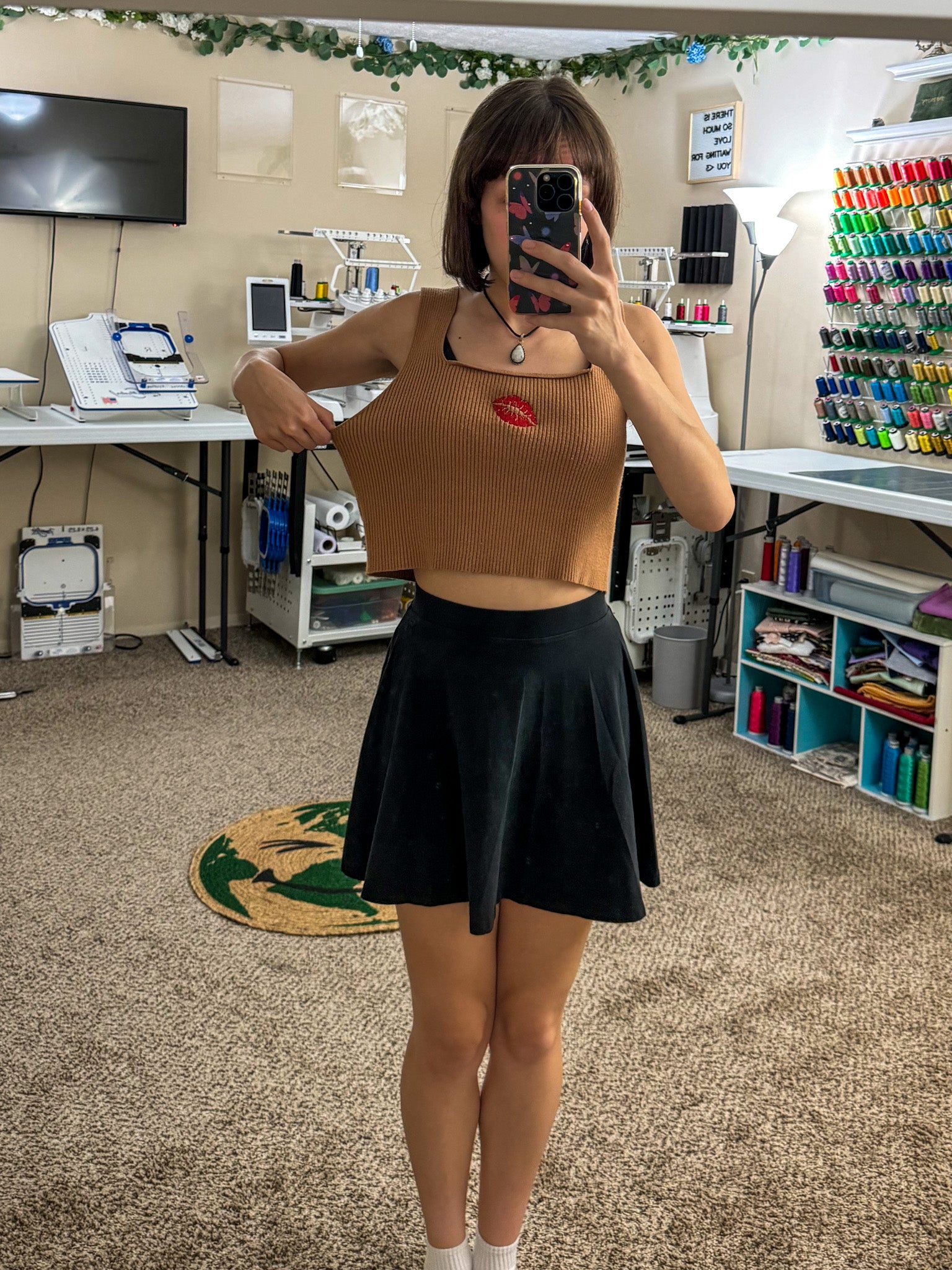 Show off your sassy side with our Red Lips Ribbed Cropped Tank! Embroidered by us to add a unique touch, this sustainable and upcycled top supports our small biz. It's slow fashion with a fun twist!