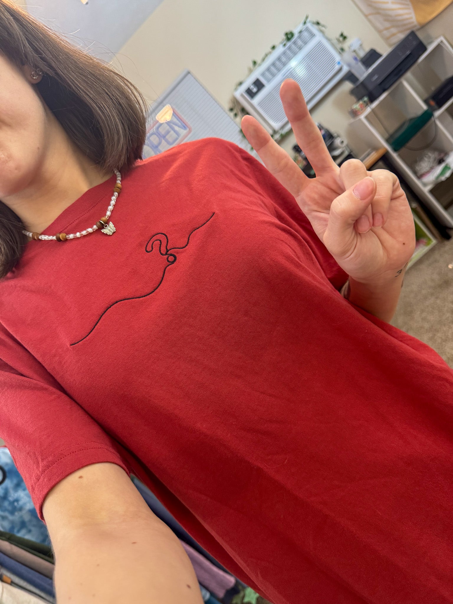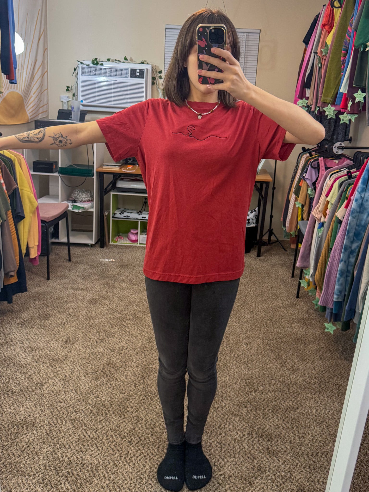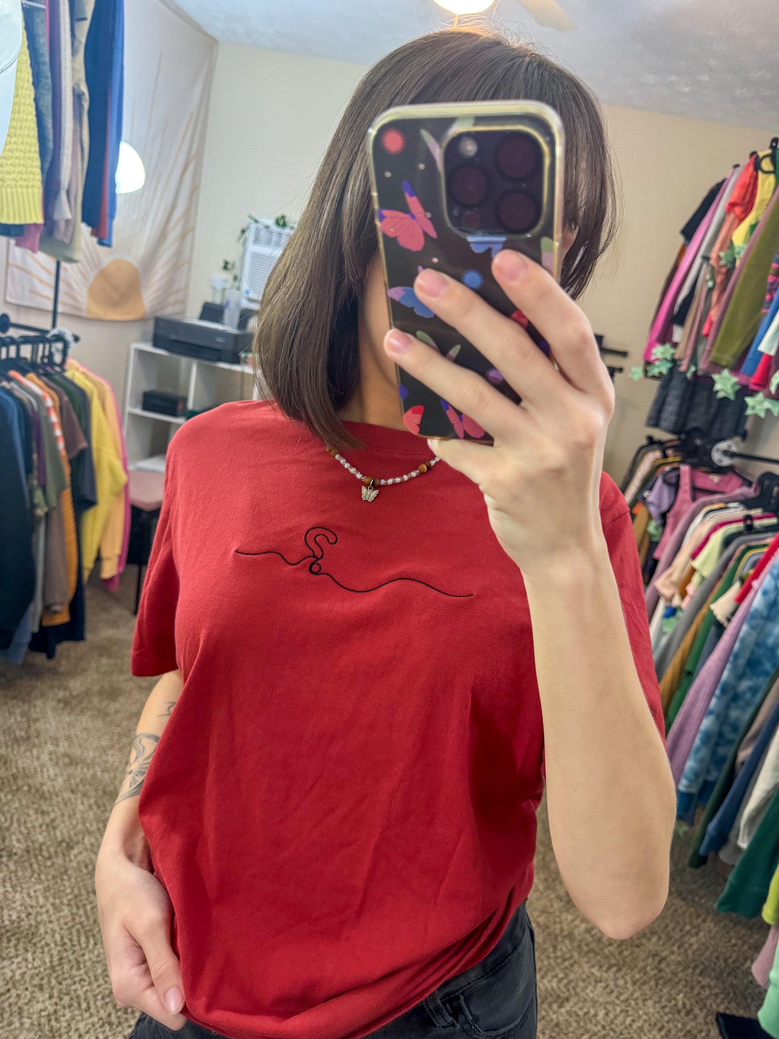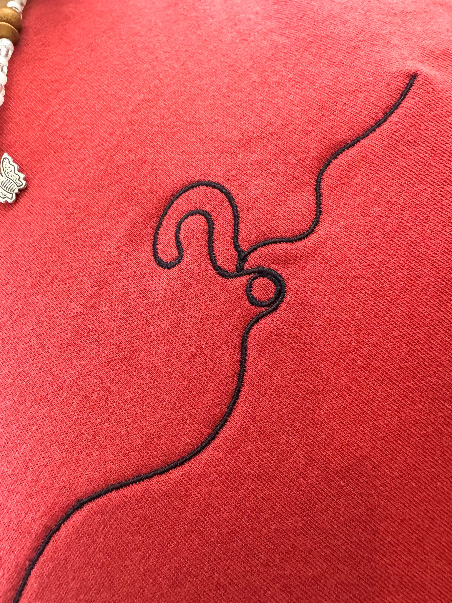 Add a pop of color and fun to your wardrobe with our Red Question Mark T-Shirt. Embroidered by us and upcycled from a discarded secondhand garment, this sustainable and slow fashion piece supports our small biz. Unquestionably quirky!