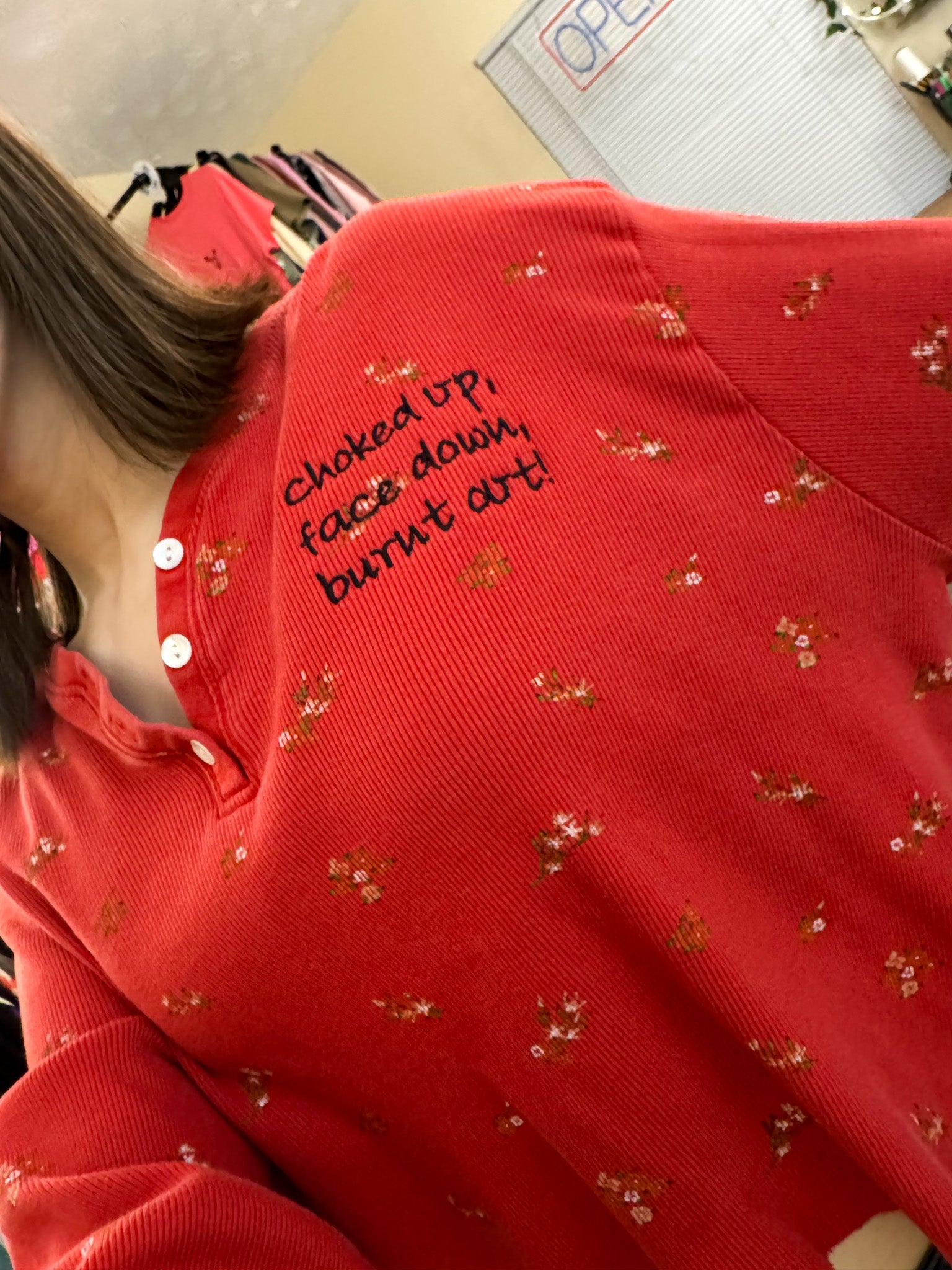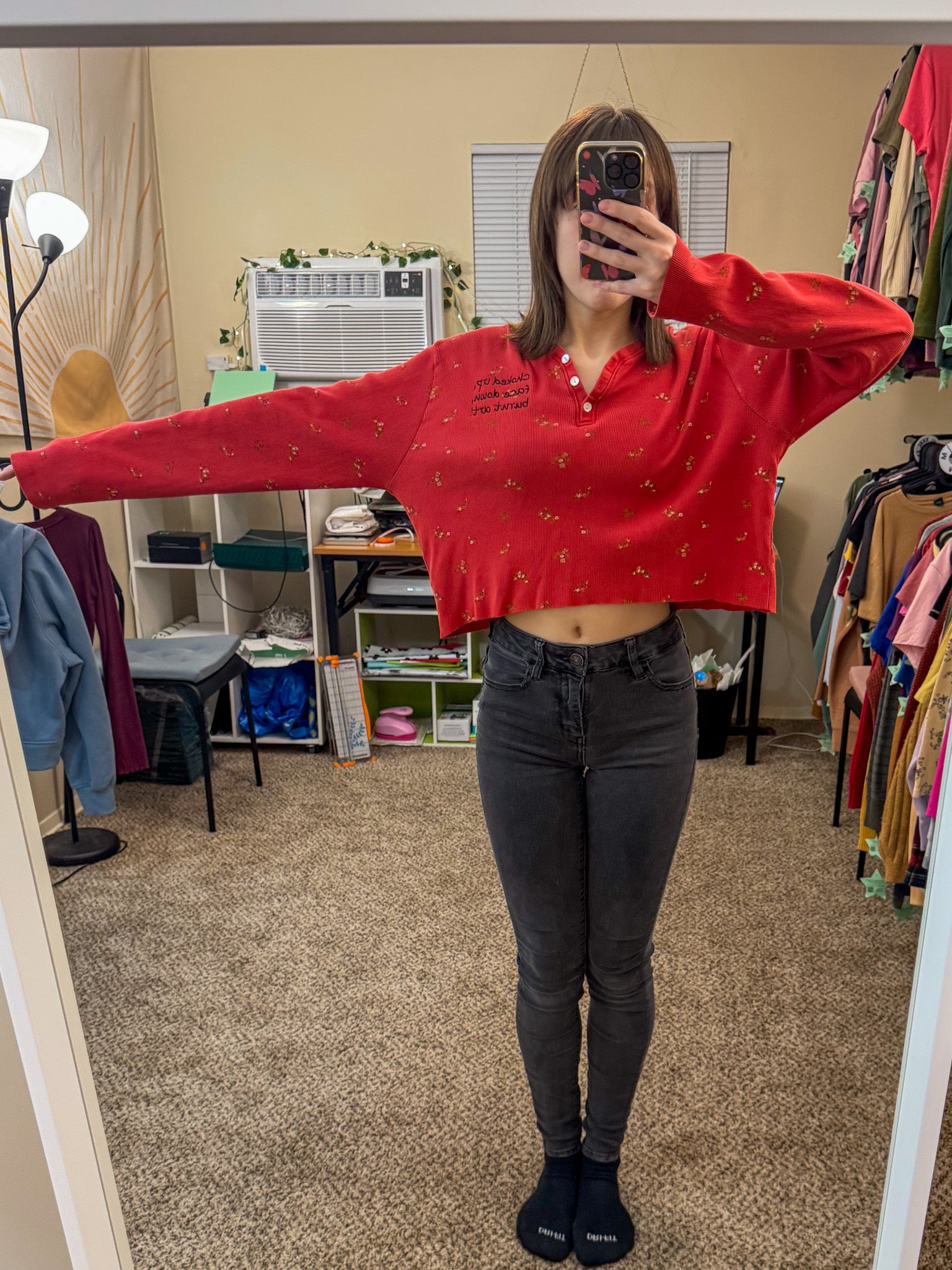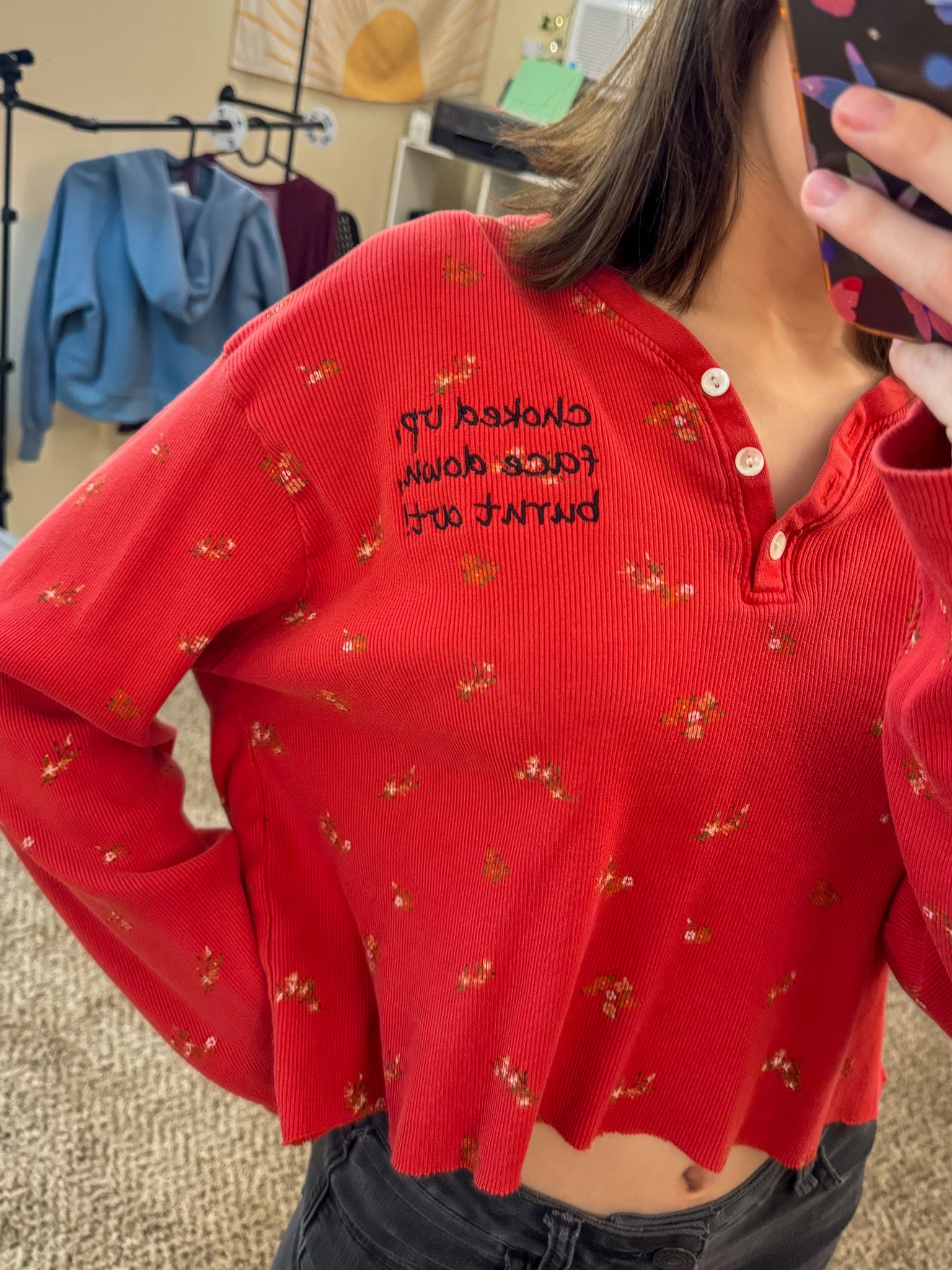 This one-of-a-kind Red Wine Supernova Floral Cropped Long Sleeve is sustainably made by upcycling a discarded secondhand garment and embroidering it ourselves. Show support for small businesses and slow fashion with this unique top!