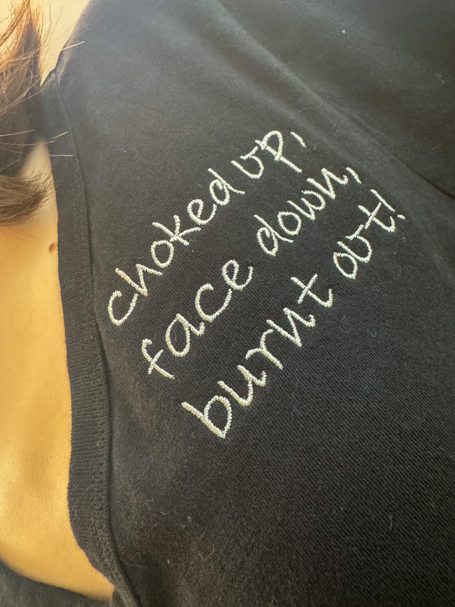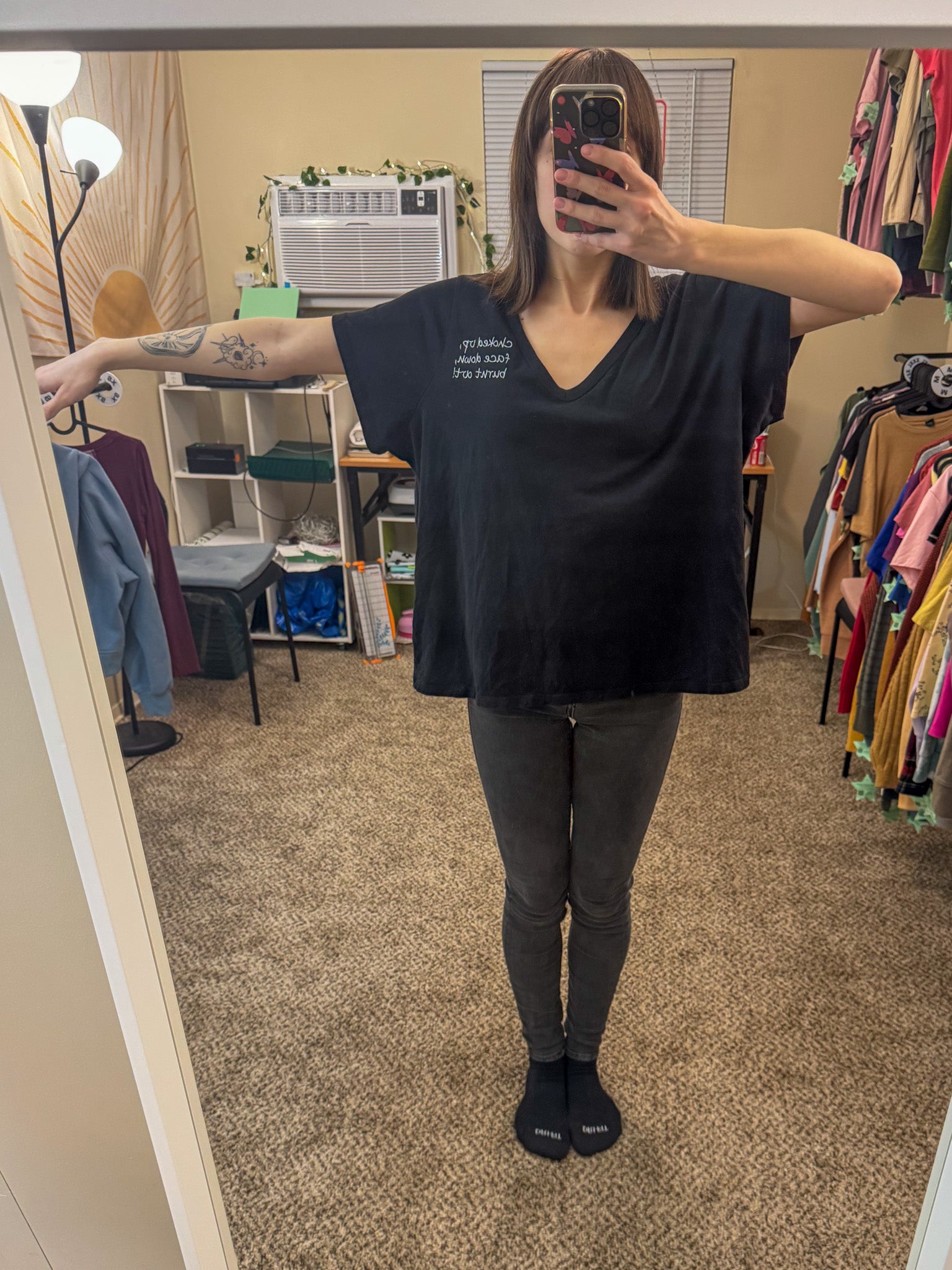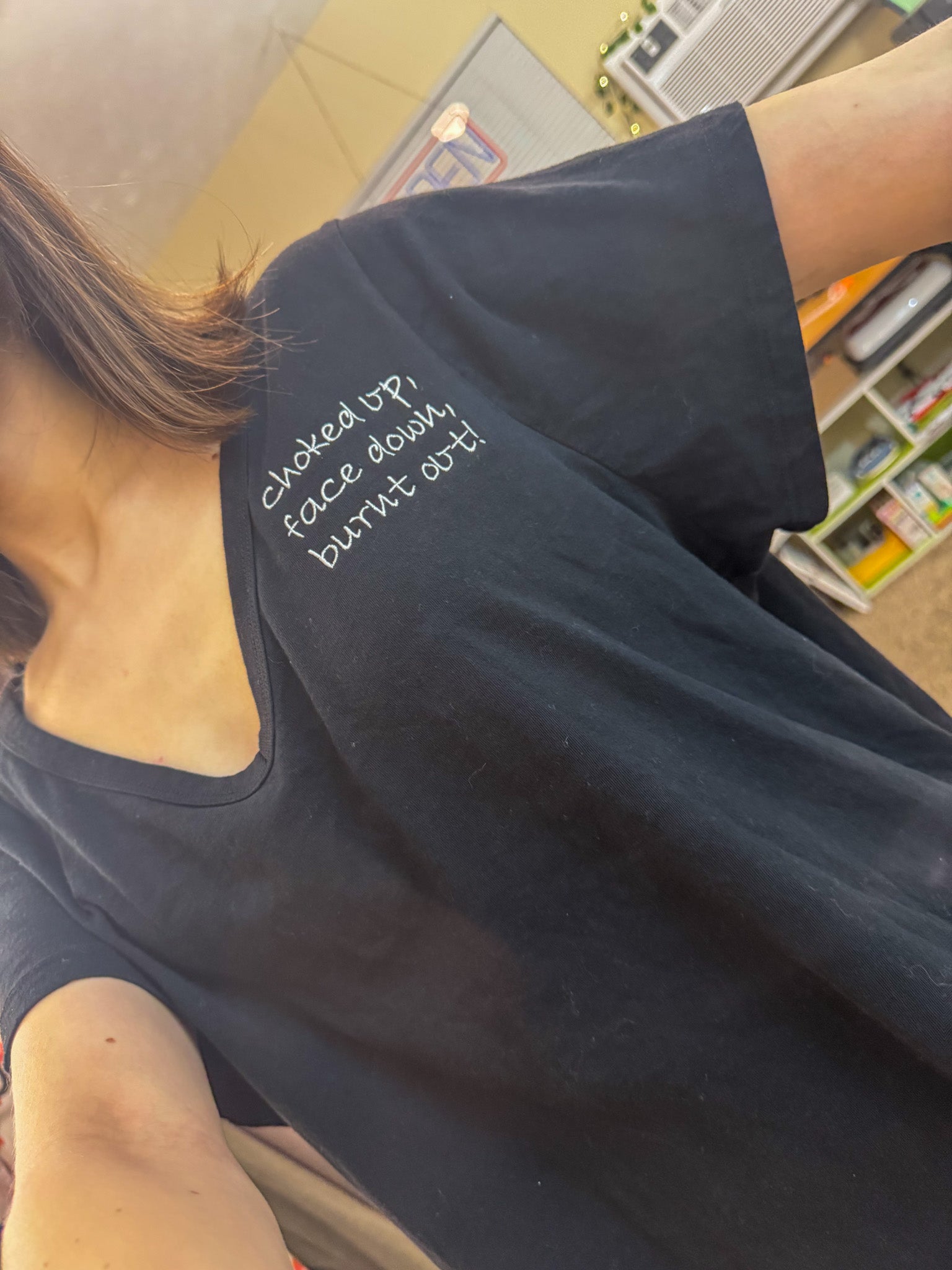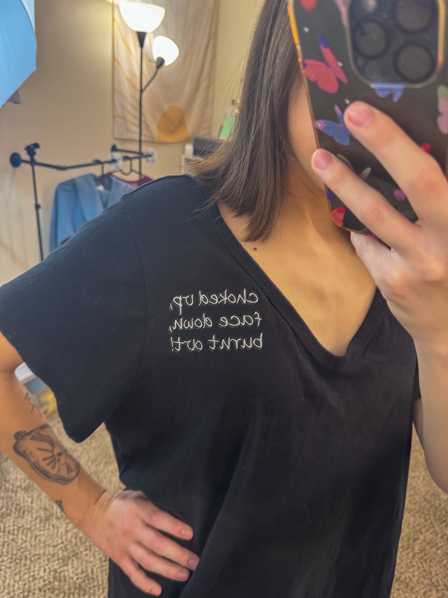 Add a cosmic twist to your wardrobe with our Red Wine Supernova V-Neck Tee! This shirt is lovingly embroidered and upcycled by our small biz, bringing new life to a discarded secondhand garment. Join the sustainable and slow fashion movement with this unique and playful piece!