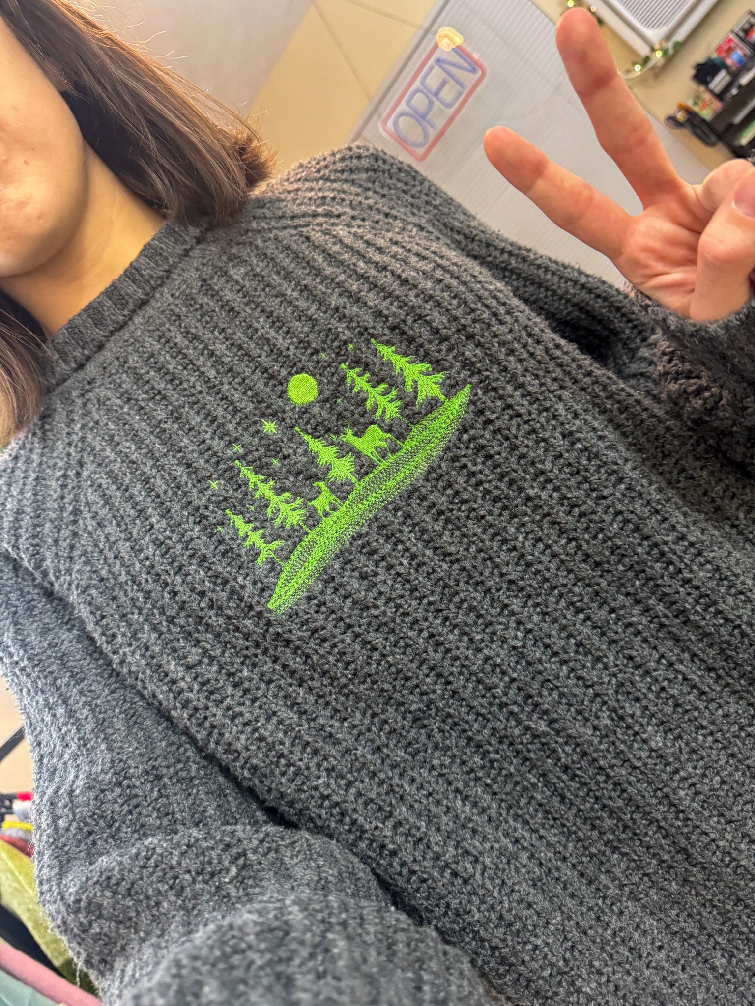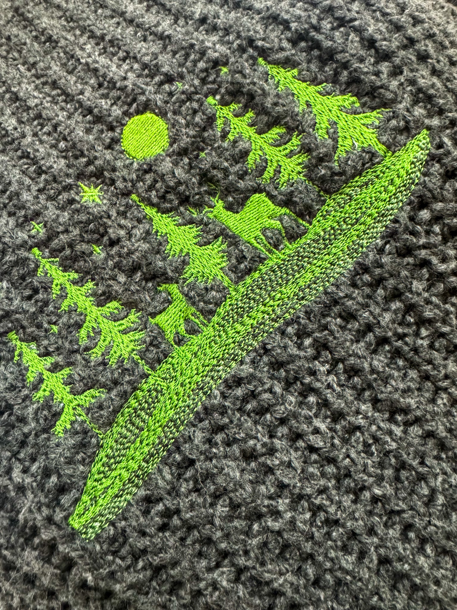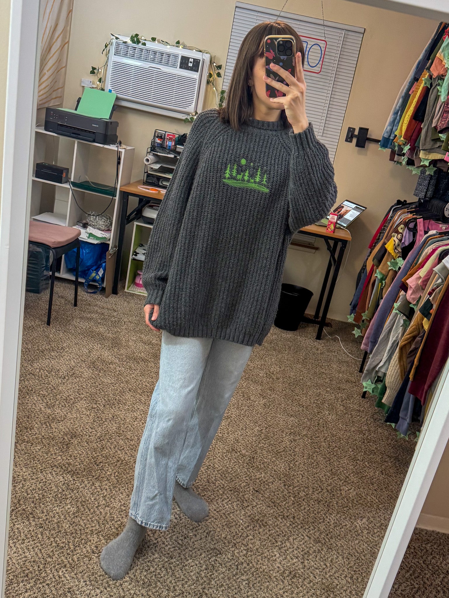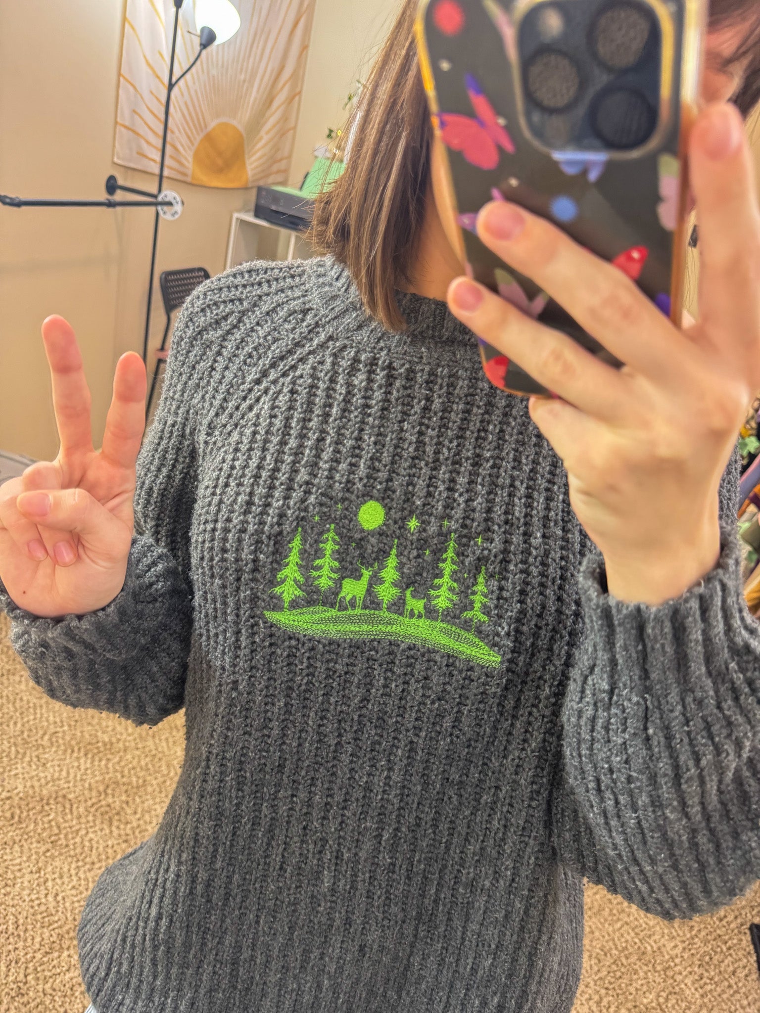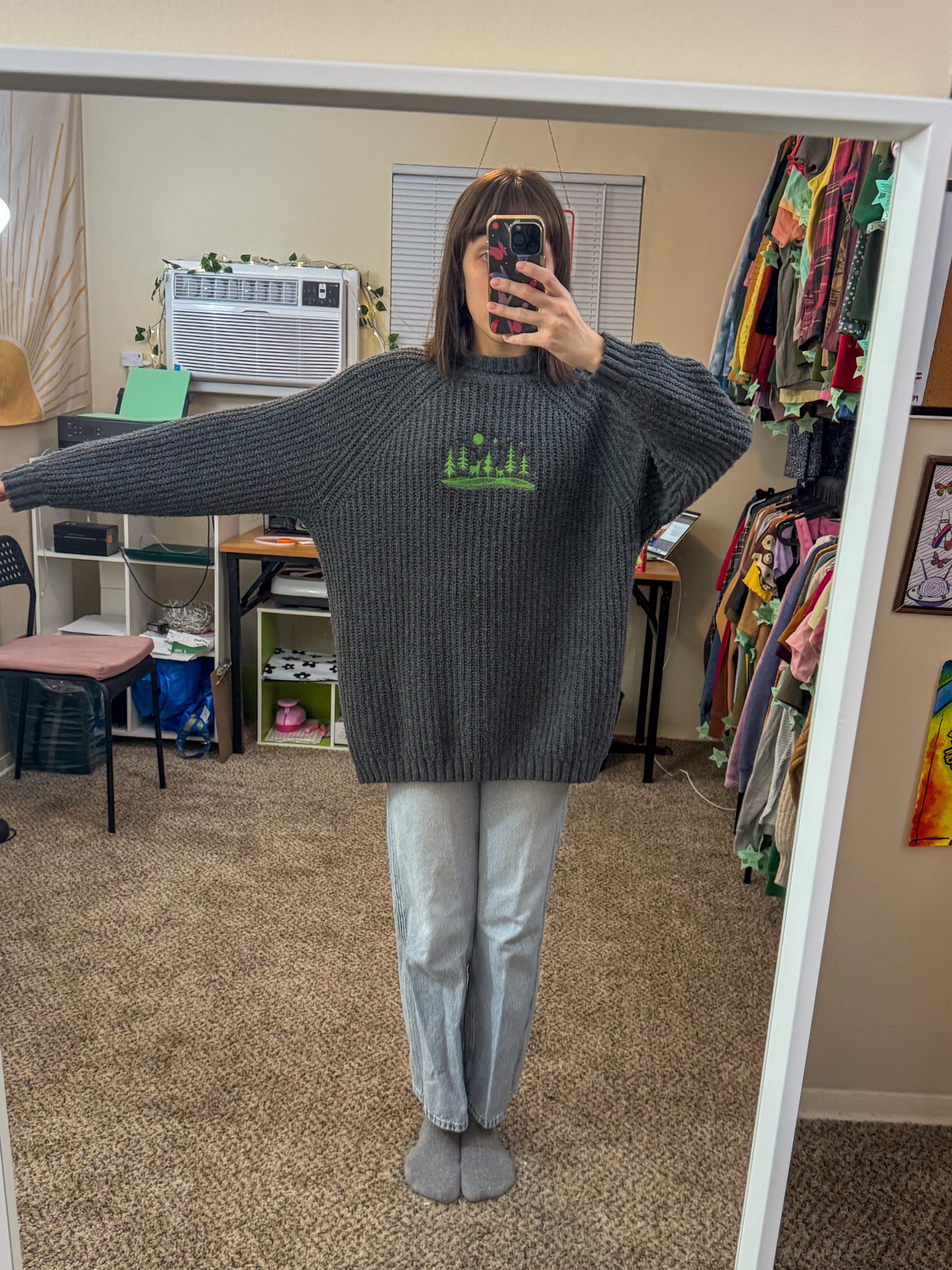 Be cozy and look cool in our Reindeer Scene Grey Sweater! Hand-embroidered by us, this sustainable and slow fashion piece supports our small biz. Upcycled from a discarded secondhand garment, you'll look good while doing good. Go on, join the herd!