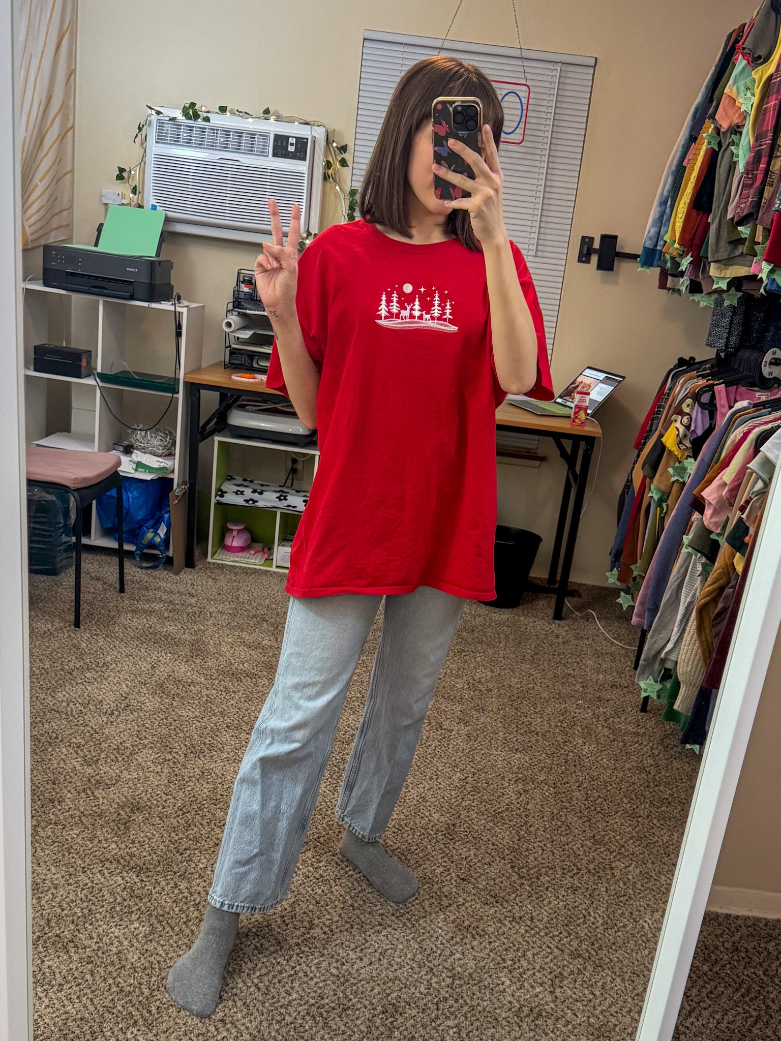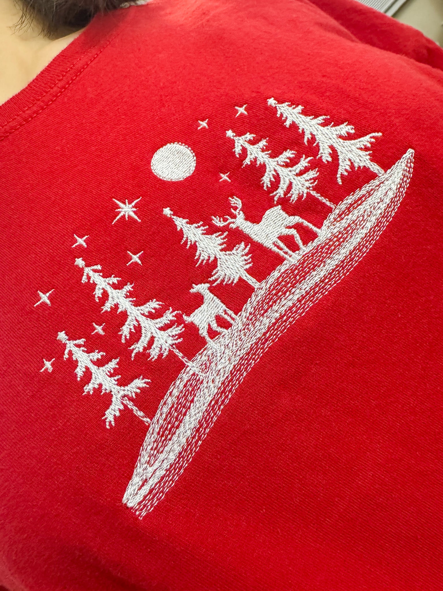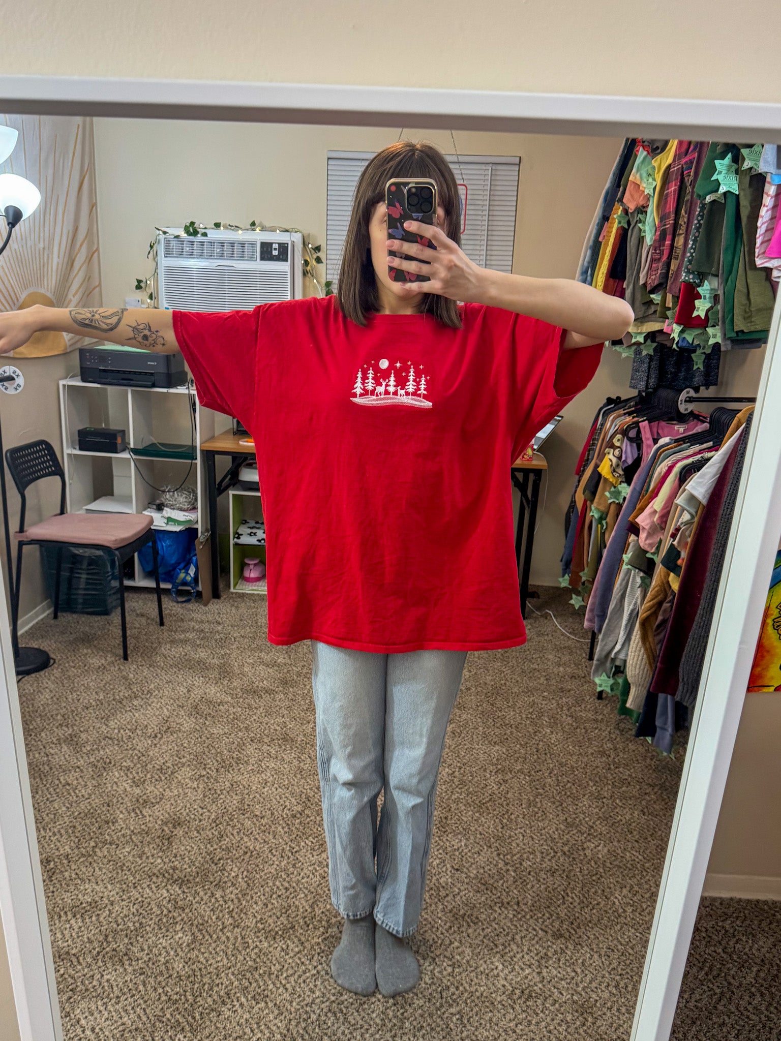 Join the sustainable fashion movement with our Reindeer Scene T-Shirt! This discarded secondhand garment has been upcycled and embroidered by us, supporting our small biz. Make a statement with slow fashion and help save the planet - one garment at a time<3