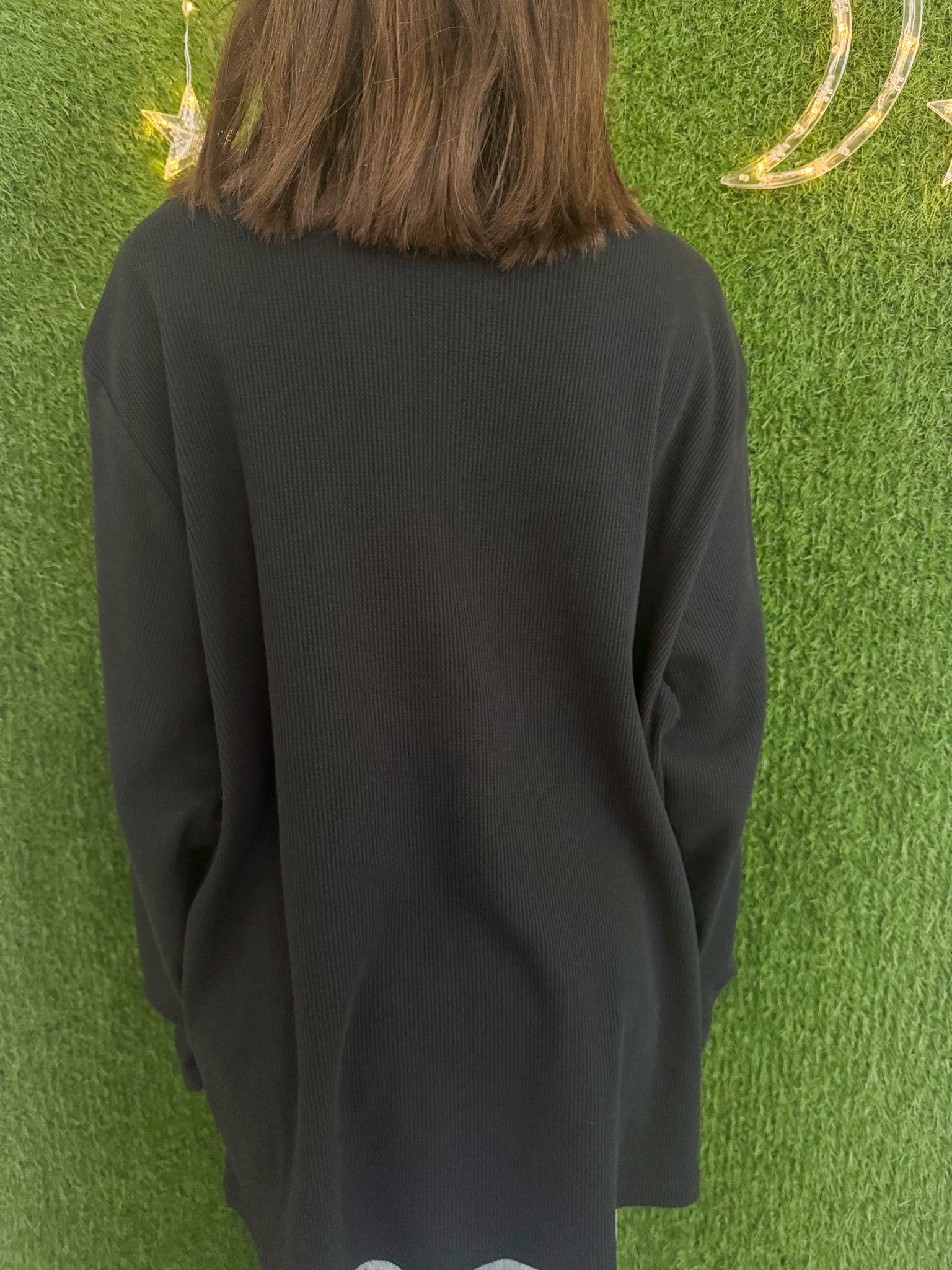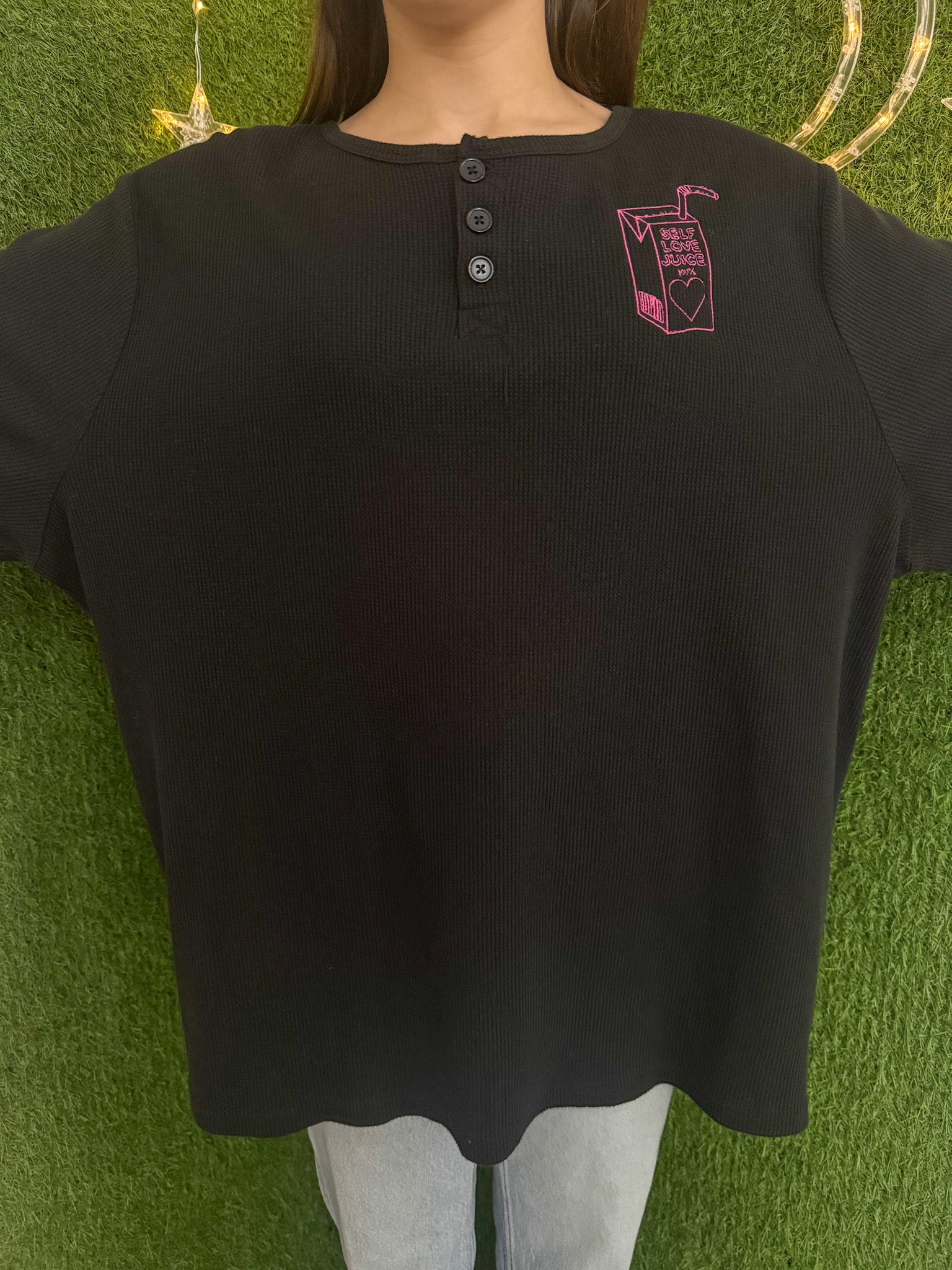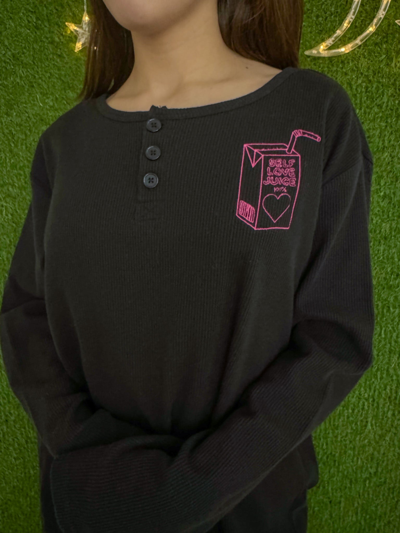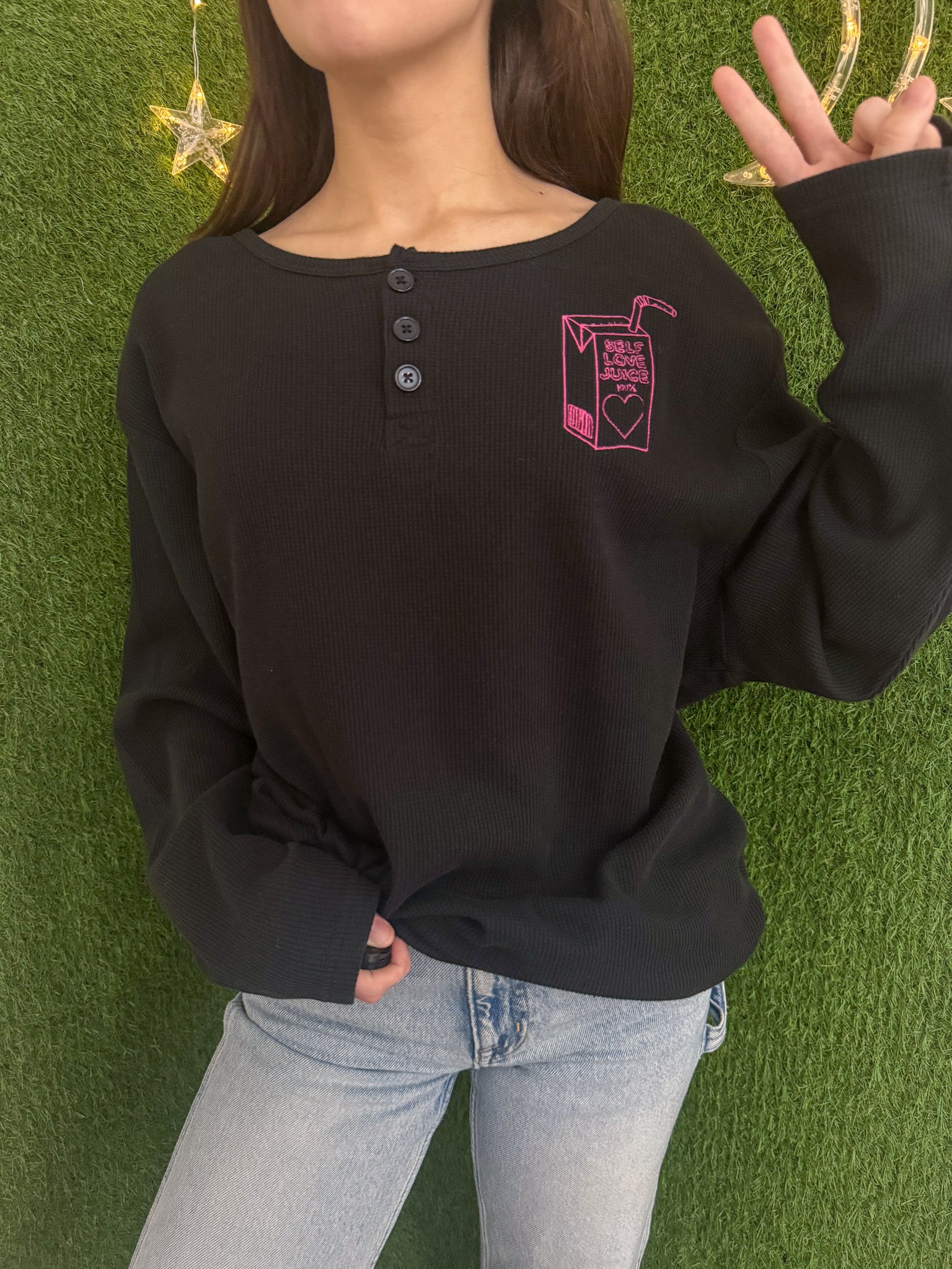 Support sustainable fashion with our Self Love Juice Black Thermal Long Sleeve. Made with upcycled, secondhand materials and embroidered for a unique touch. Show your love for the environment and small businesses with this slow fashion piece!