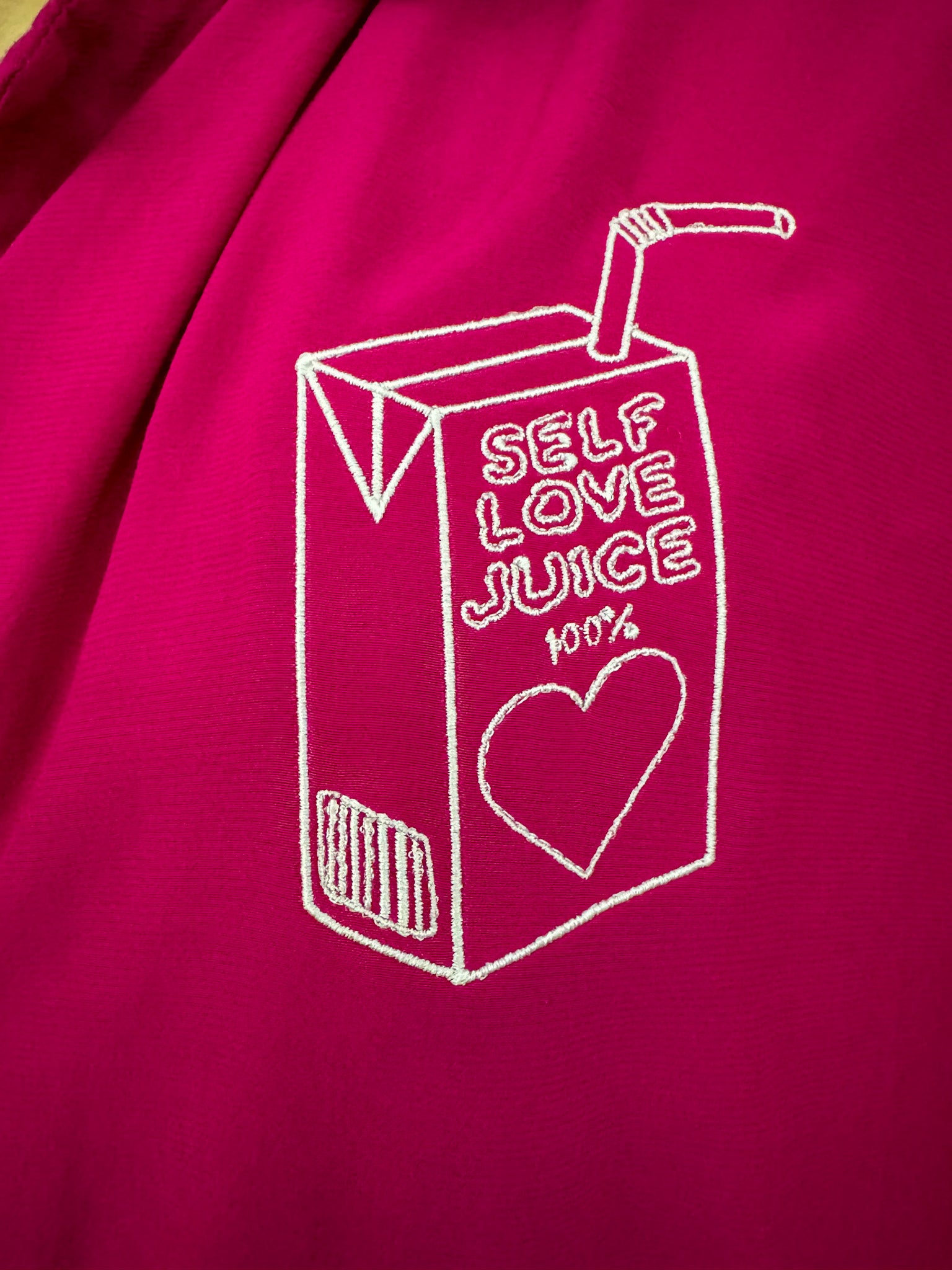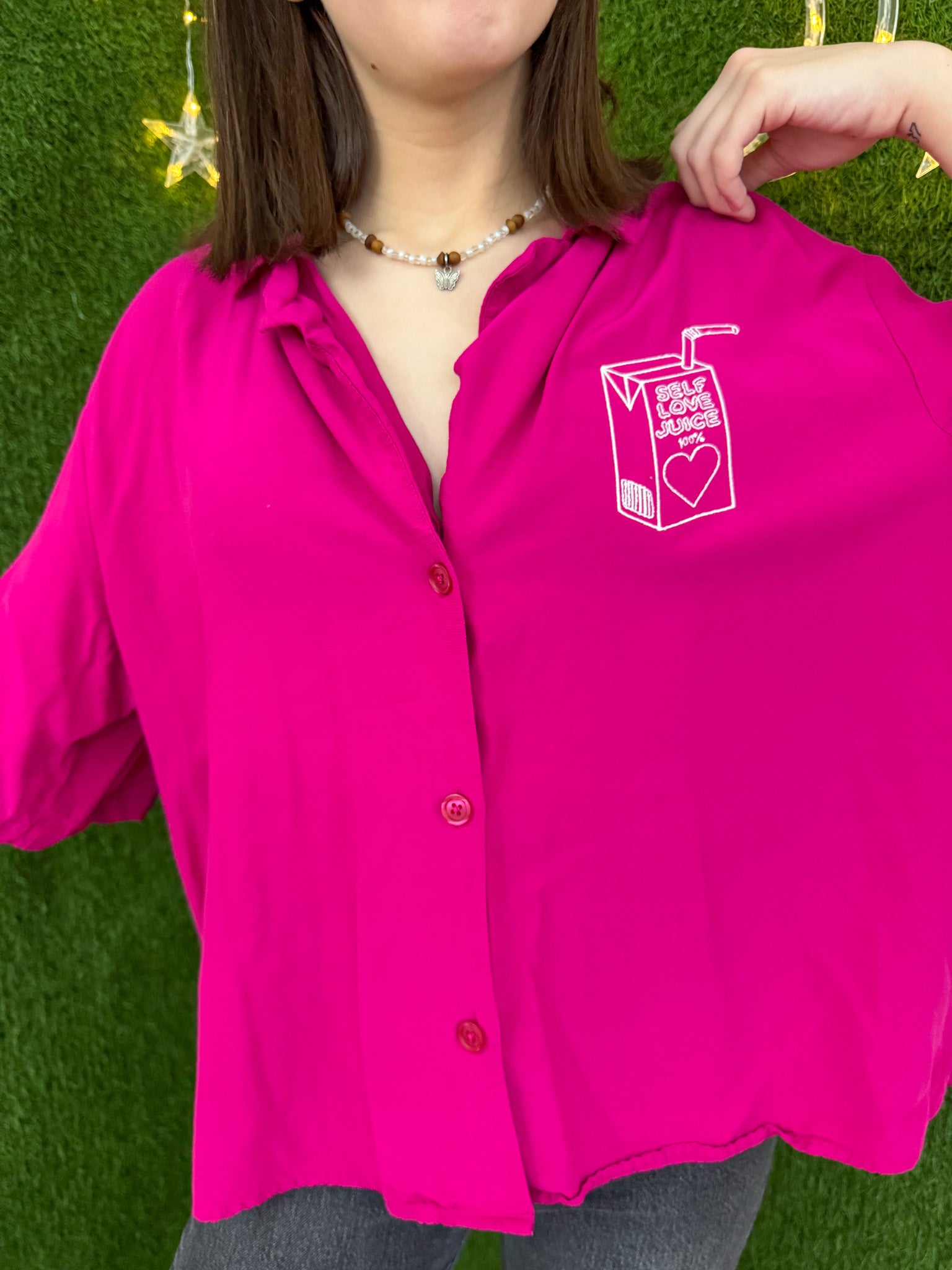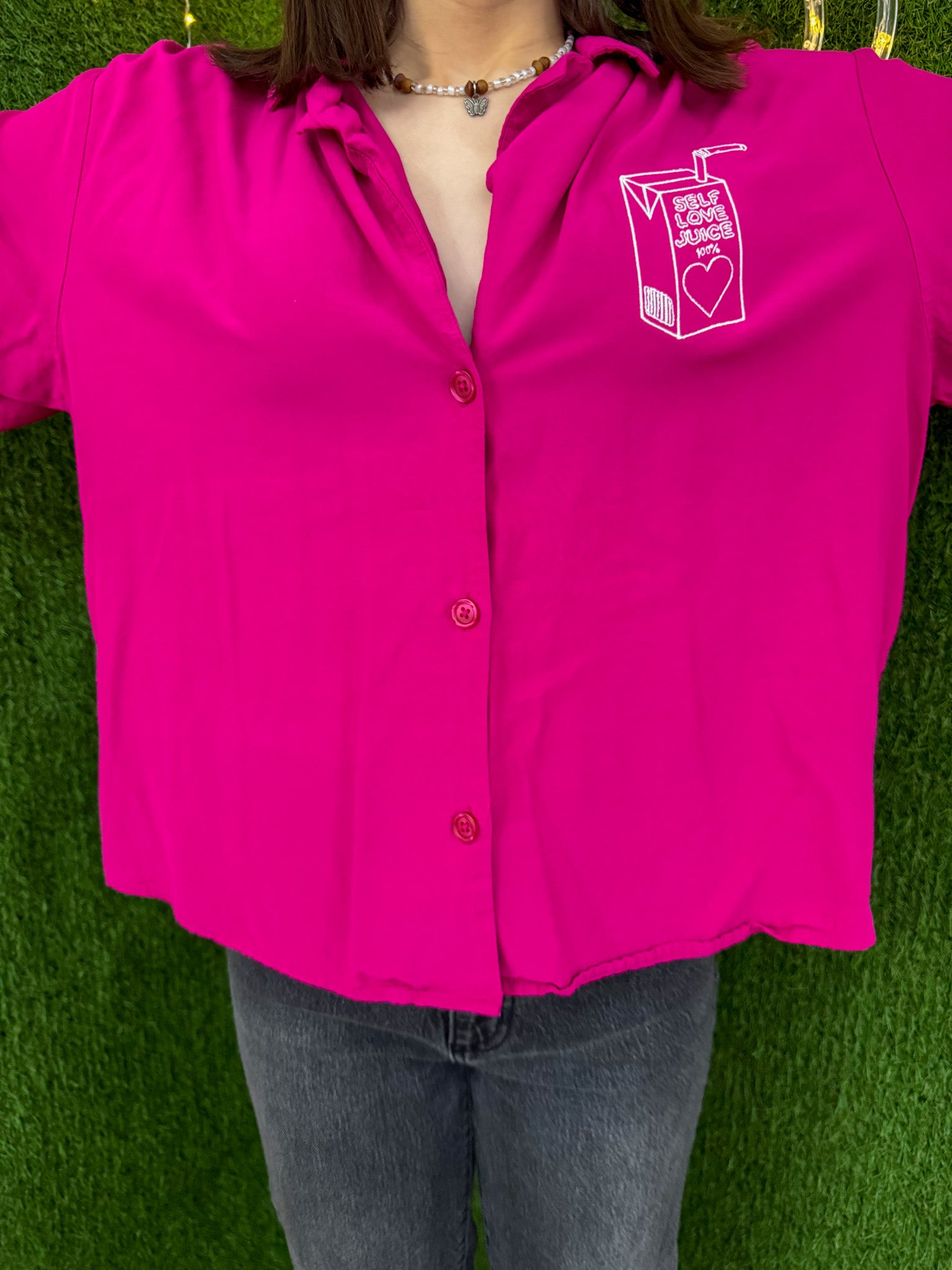 Get ready to spread love and support local with our Self Love Juice Pink Cropped Button Up Collard Shirt! This embroidered, upcycled, and sustainable beauty is the perfect addition to your wardrobe for both style and slow fashion<3