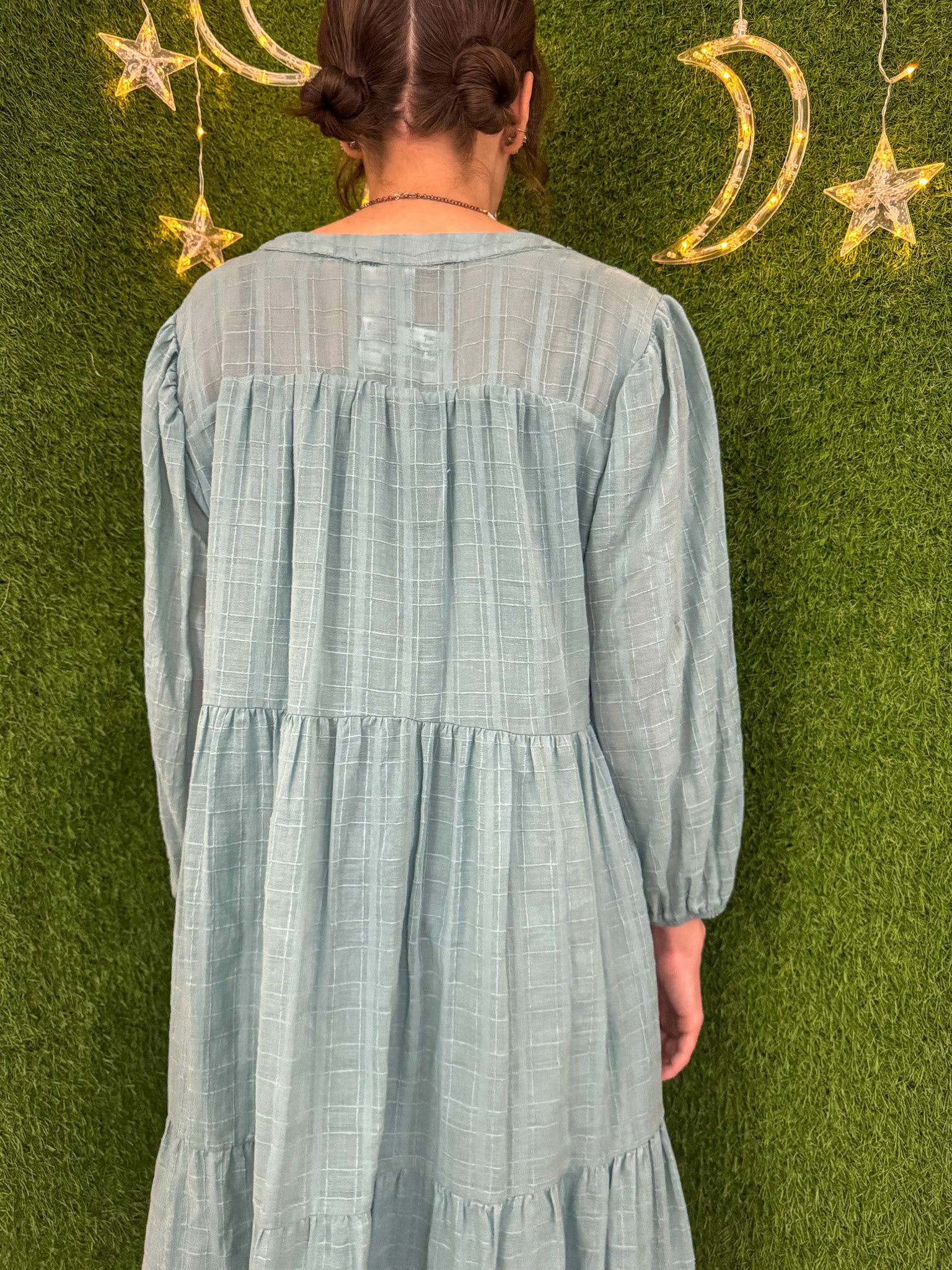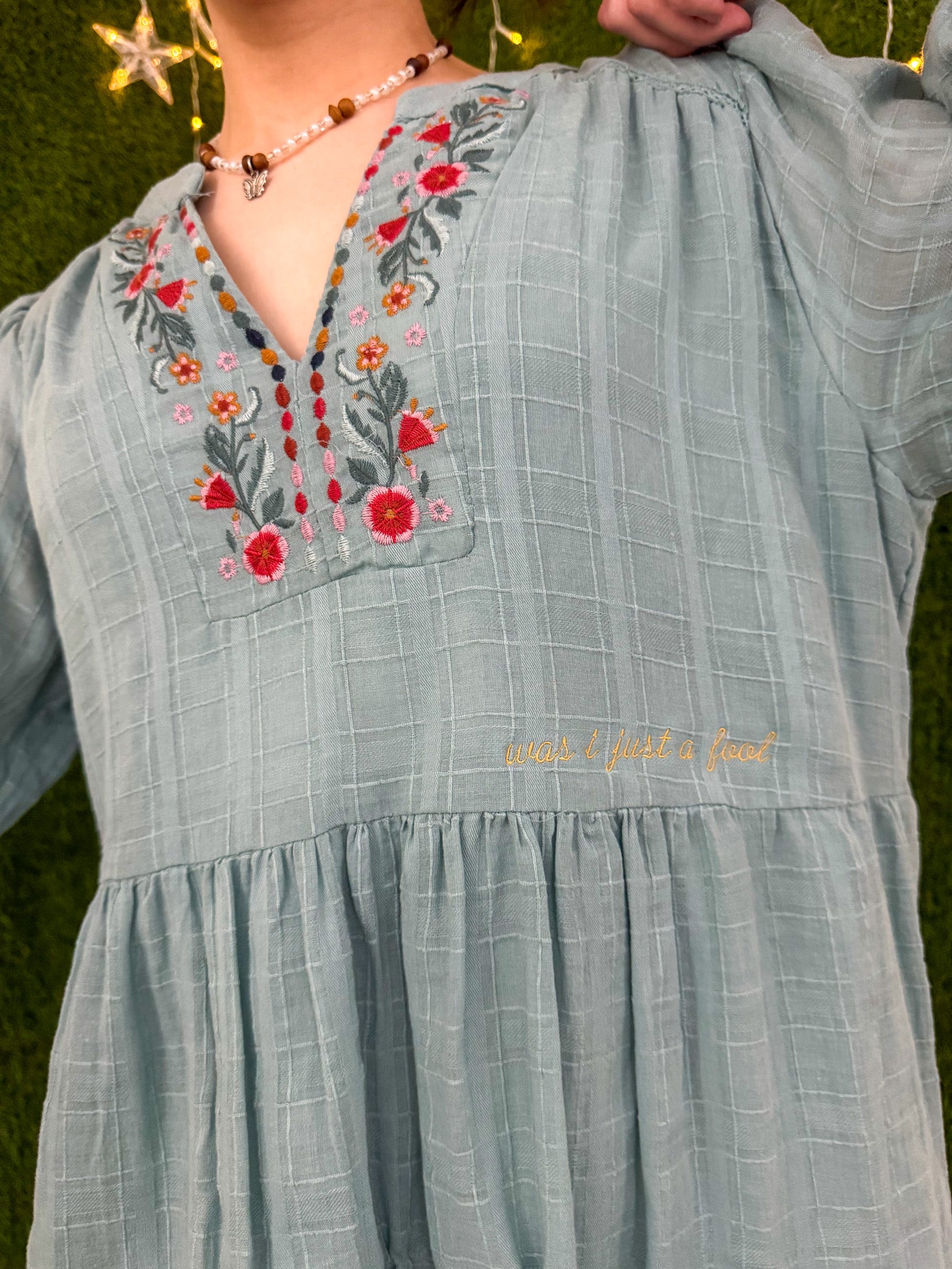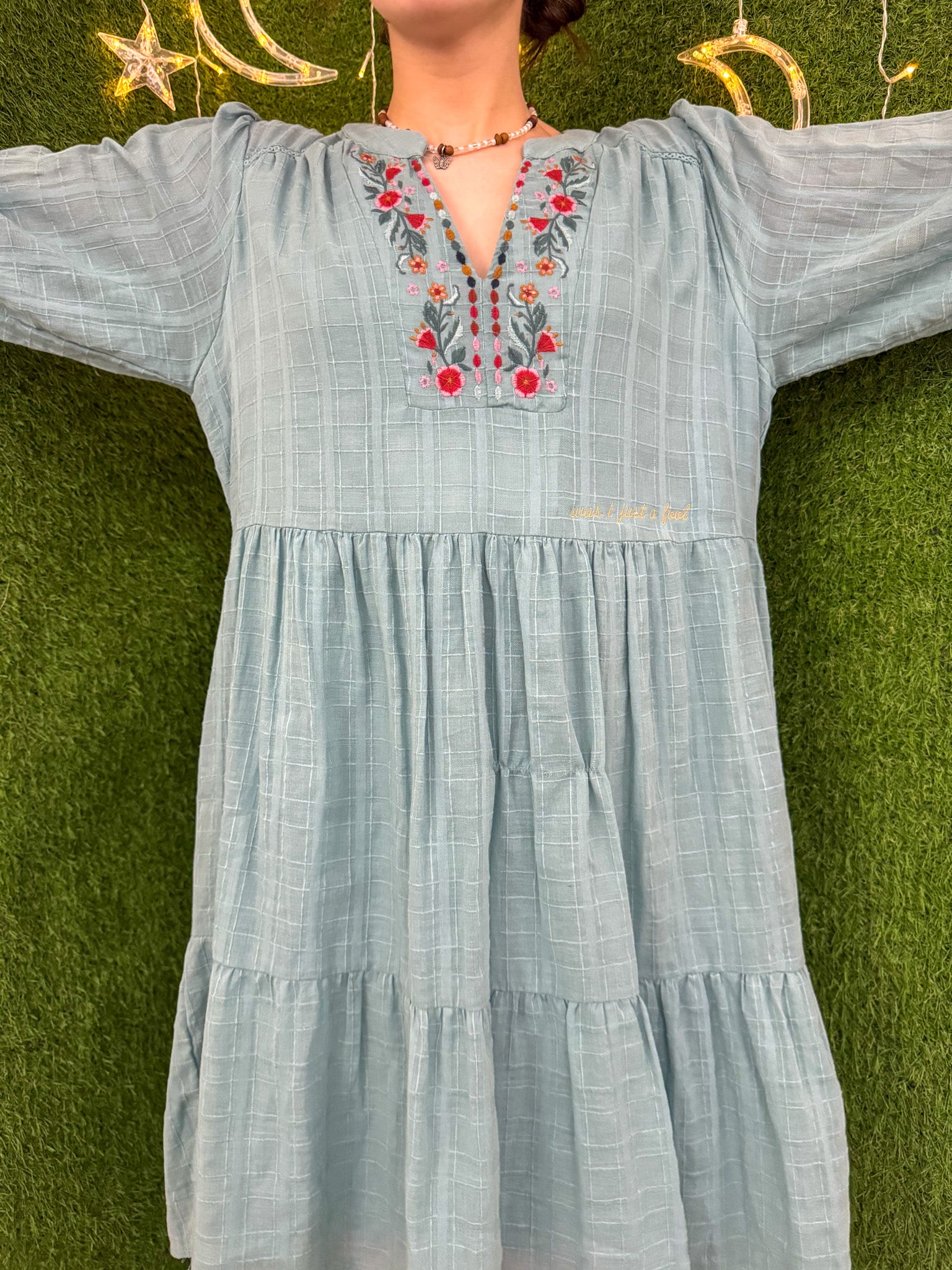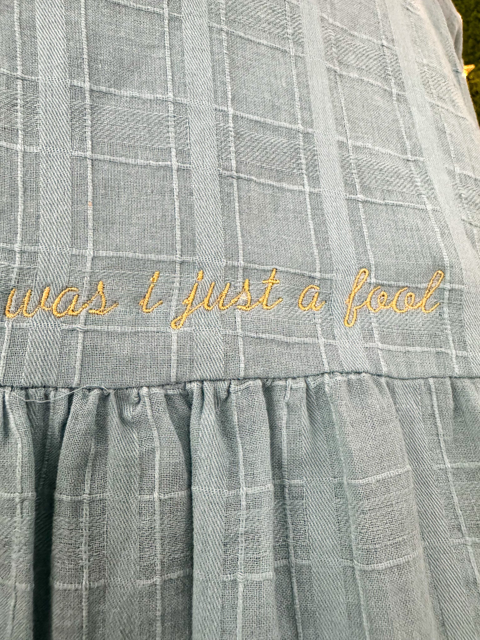 Elevate your style with our Silver Springs V-Neck Blue Dress. Intricately embroidered for a unique touch, this dress is also upcycled and sustainable, supporting our small biz and slow fashion. Be chic while making a positive impact<3
