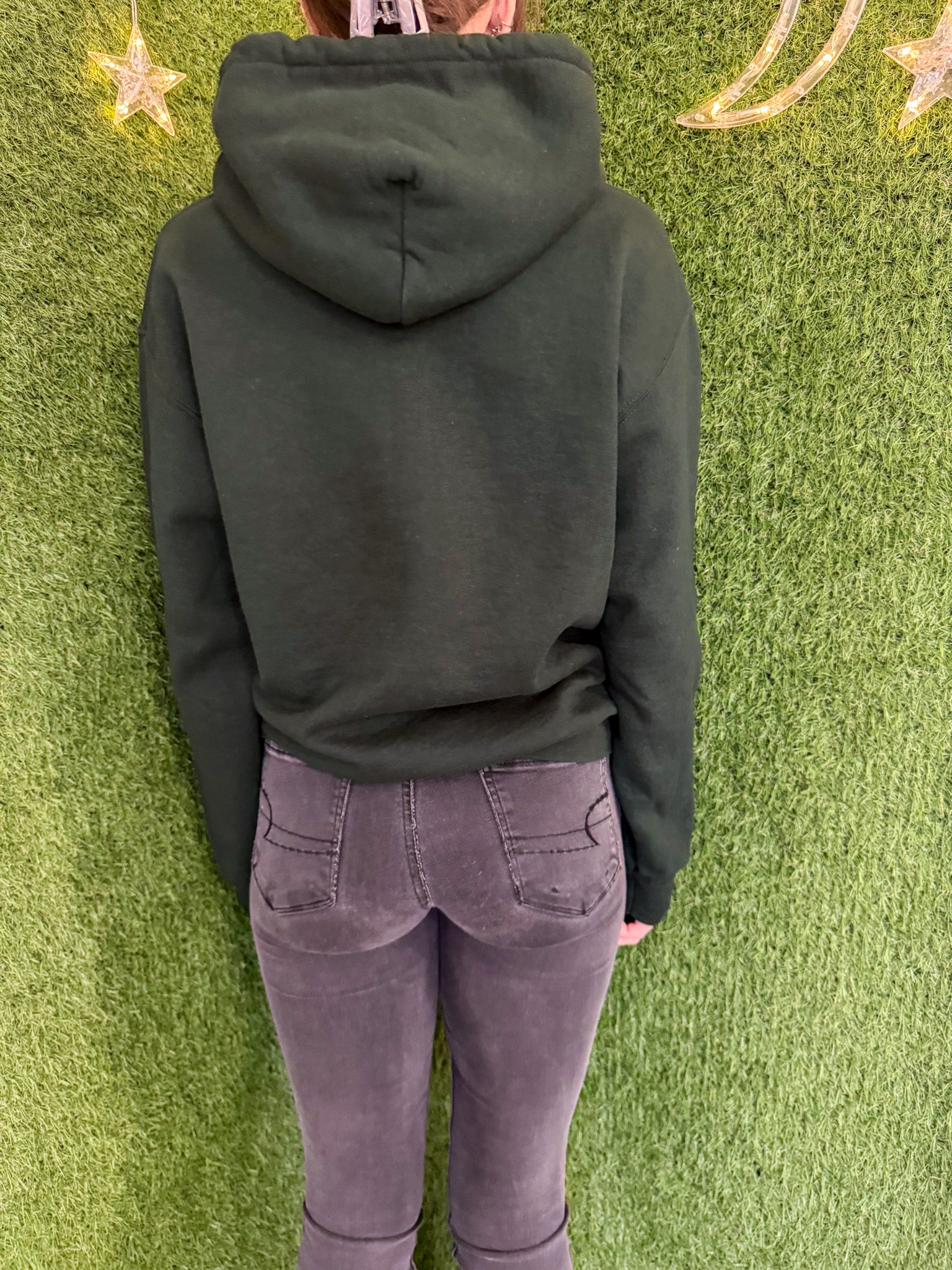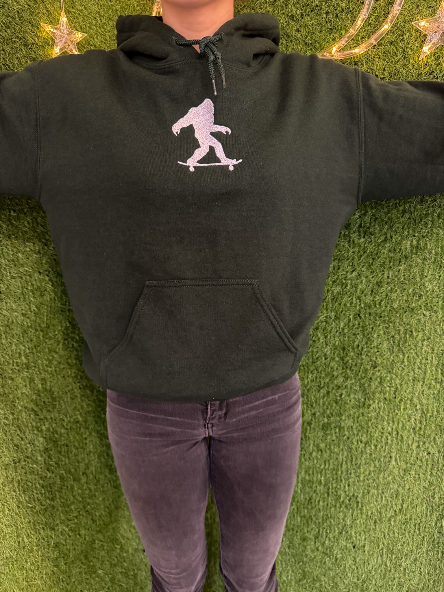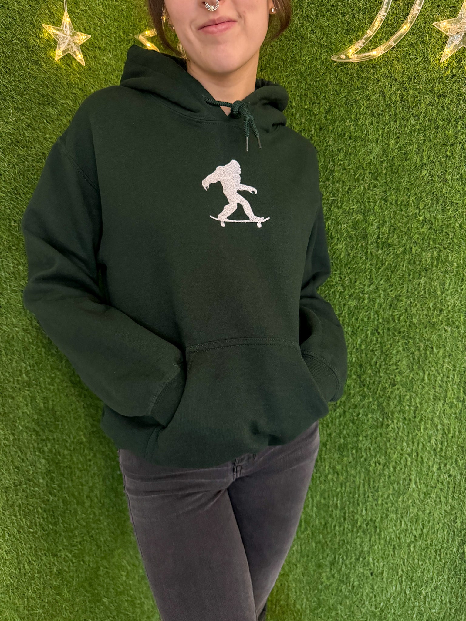 Stay cozy and support small businesses with our Skateboard Bigfoot Forest Green Hoodie. This hoodie is made from a secondhand garment, making it a sustainable and conscious choice for your wardrobe. Show off your unique style with this embroidered hoodie, perfect for the slow fashion movement!