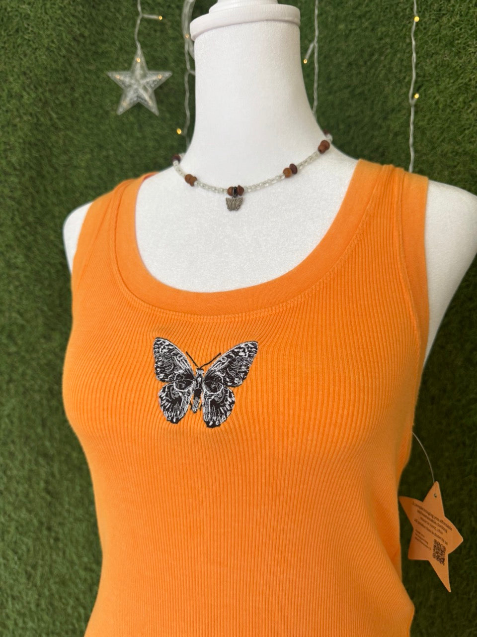 Bring bold charm to your wardrobe with this Skull Butterfly Orange Tank. Upcycled from a secondhand garment, it celebrates slow fashion with unique embroidered details that add a touch of edgy whimsy. Perfect for those who love style with a story and a splash of playful personality!