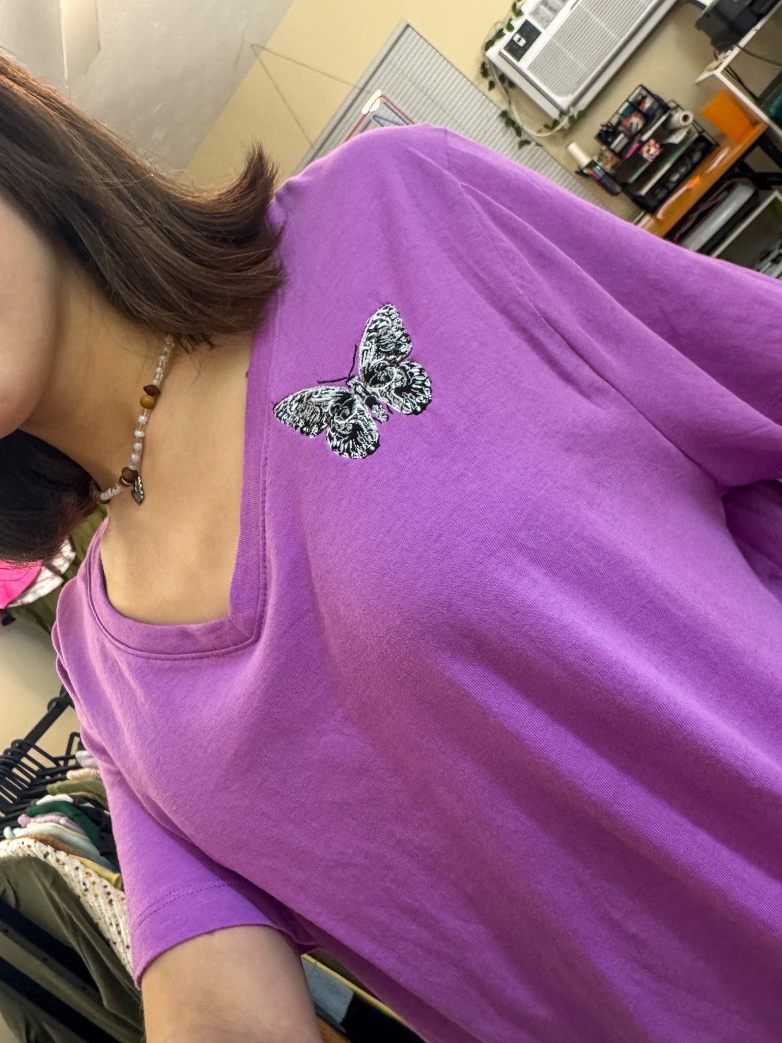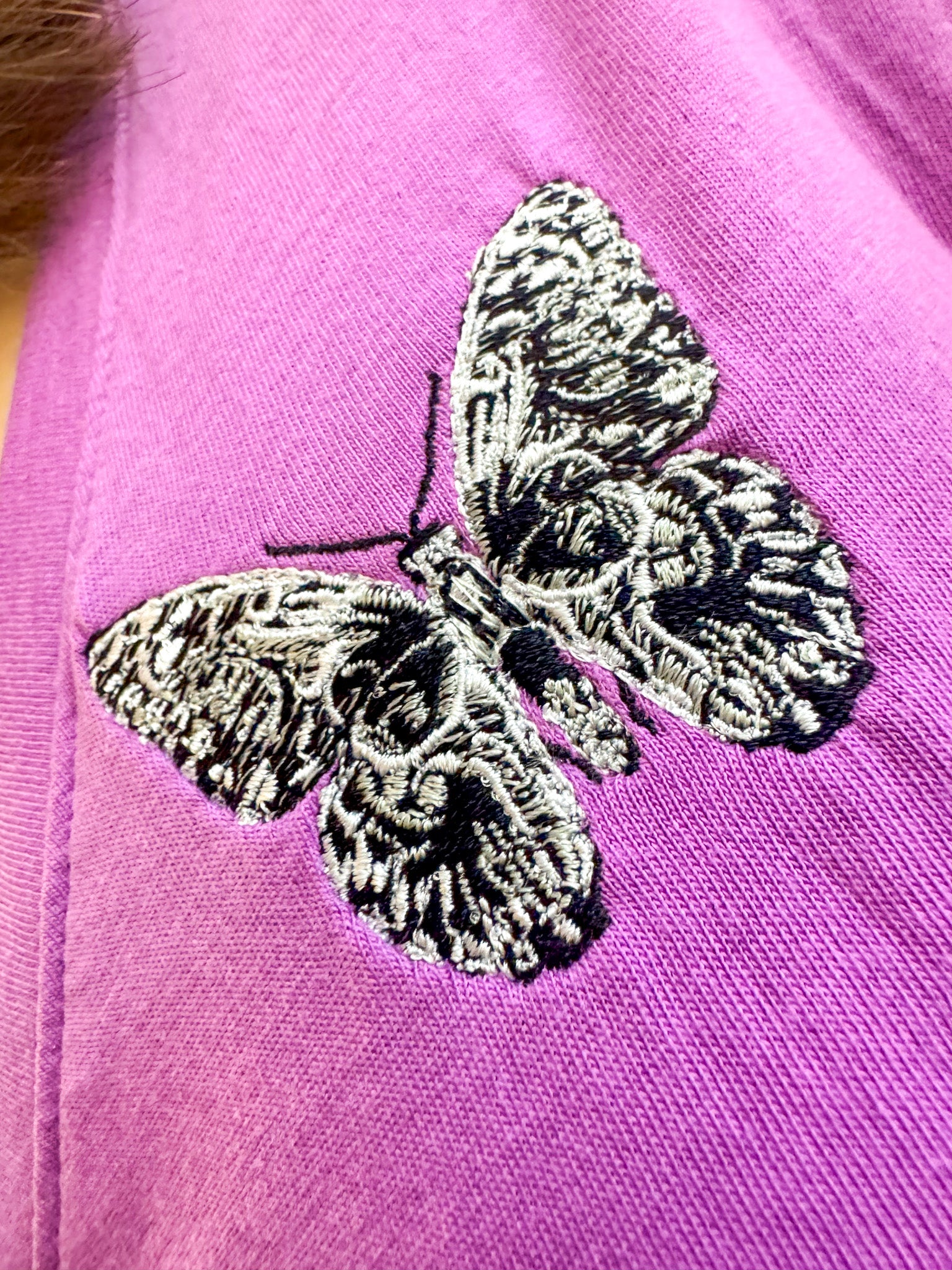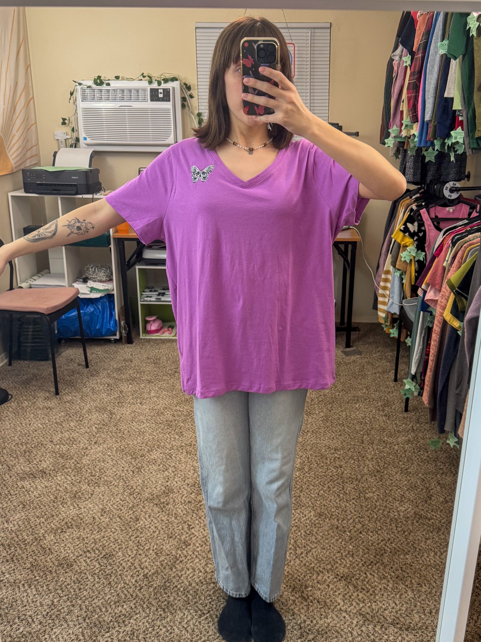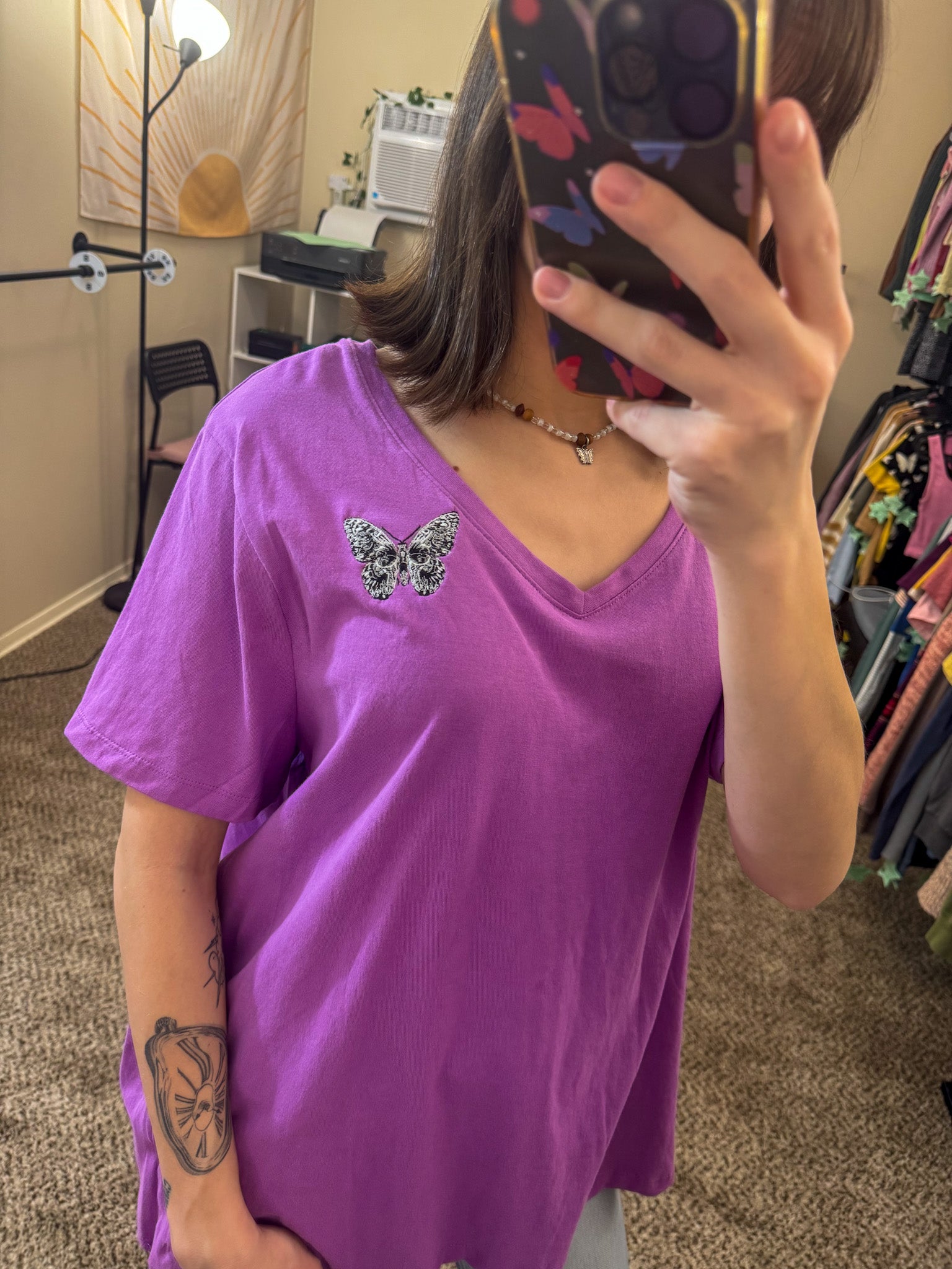 Transform your style with our Skull Butterfly Violet V-Neck Tee. This top is embroidered and upcycled by us, making it a sustainable and unique addition to your wardrobe. Show your support for small businesses and slow fashion with this discarded secondhand garment!