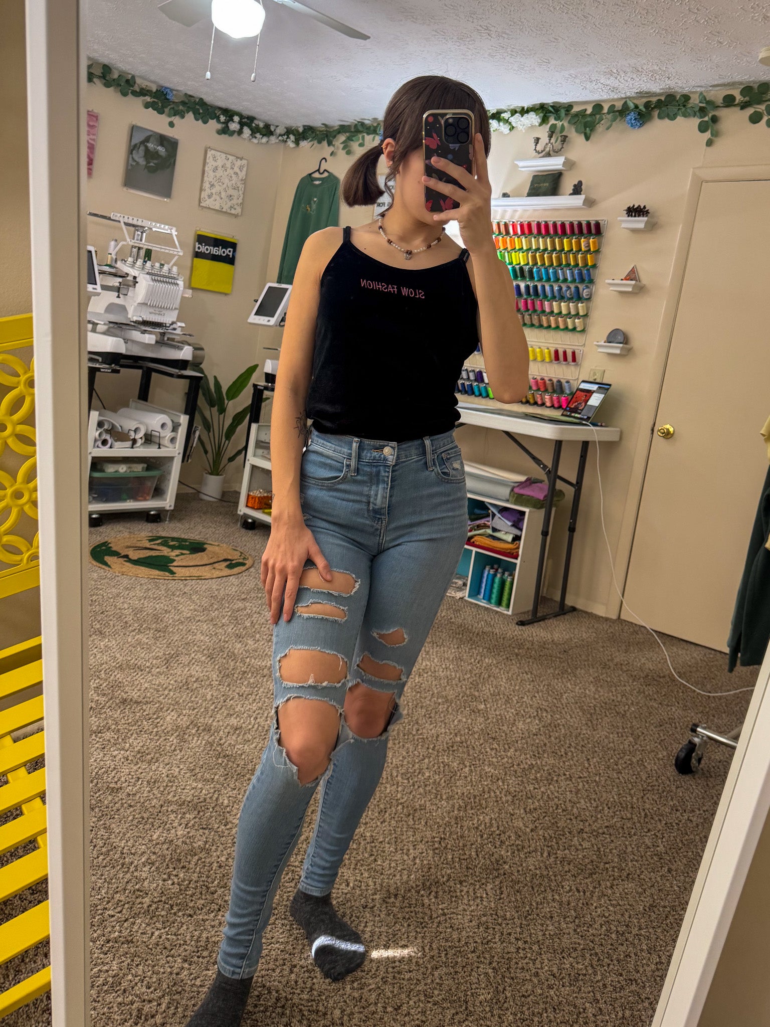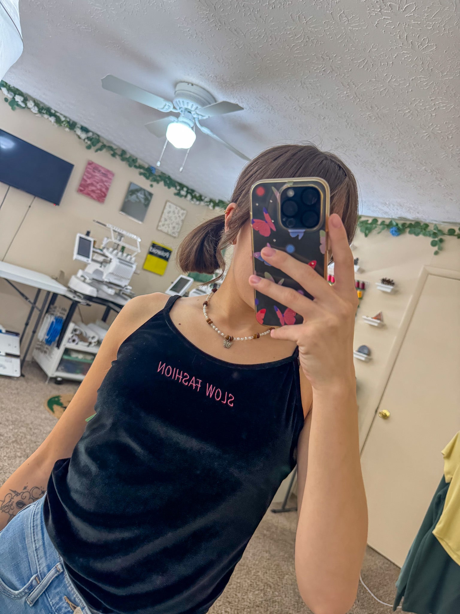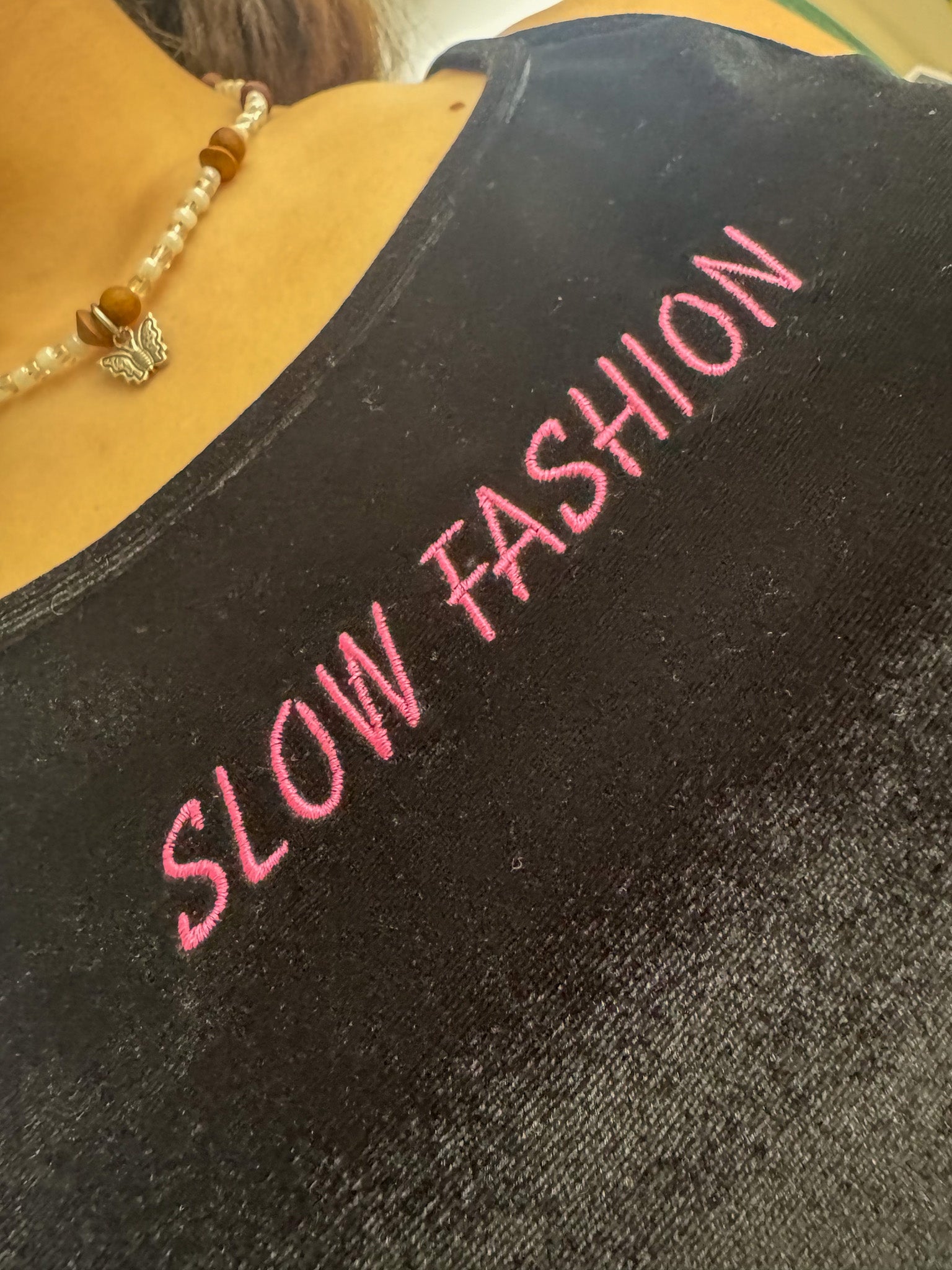 Get ready to make a statement with our Slow Fashion Body Suit Tank Top! Created with love and care, this top is embroidered by us and upcycled from a discarded secondhand garment for a sustainable and stylish choice. Show your support for small biz and embrace the slow fashion movement with this unique piece.