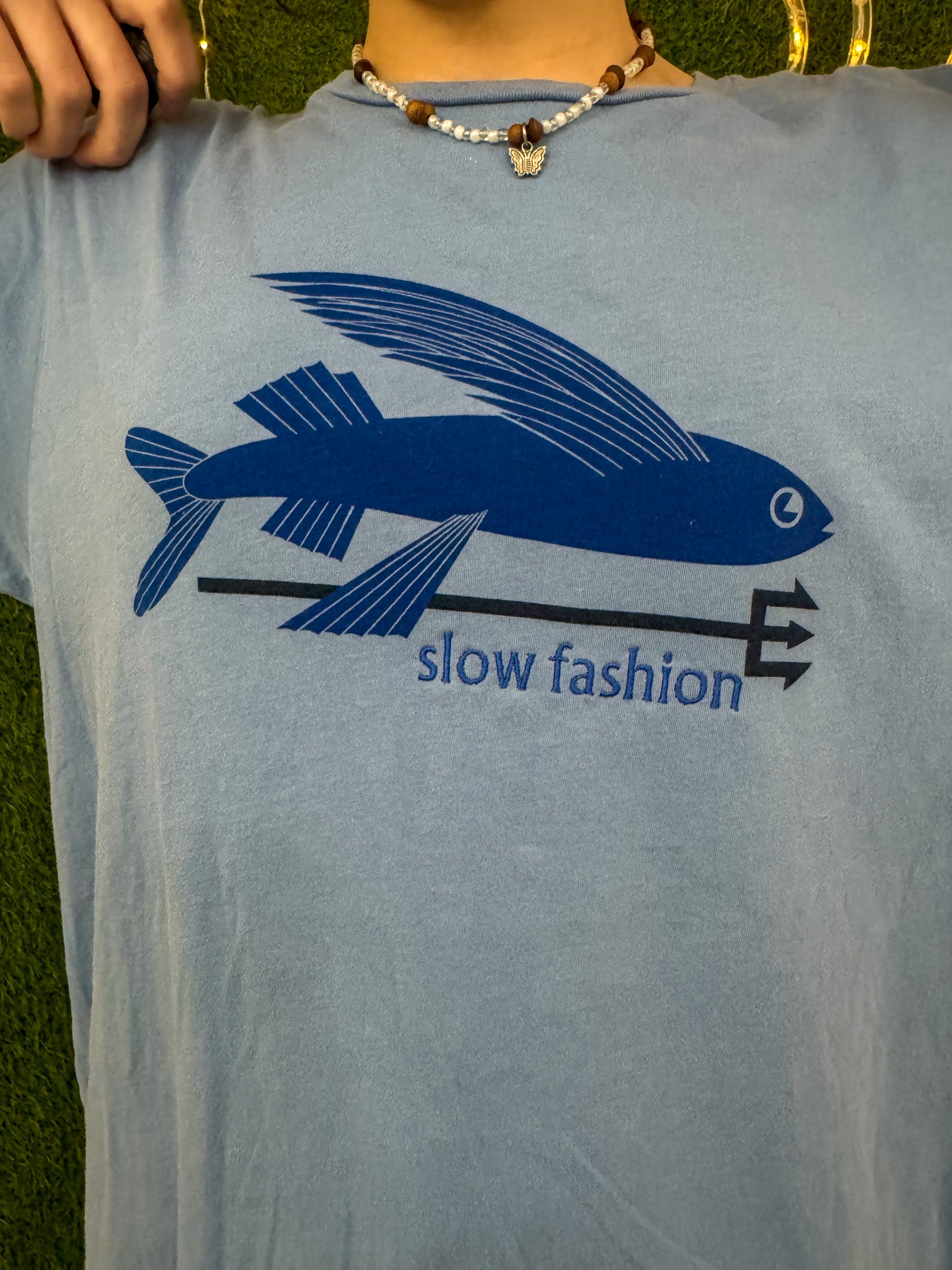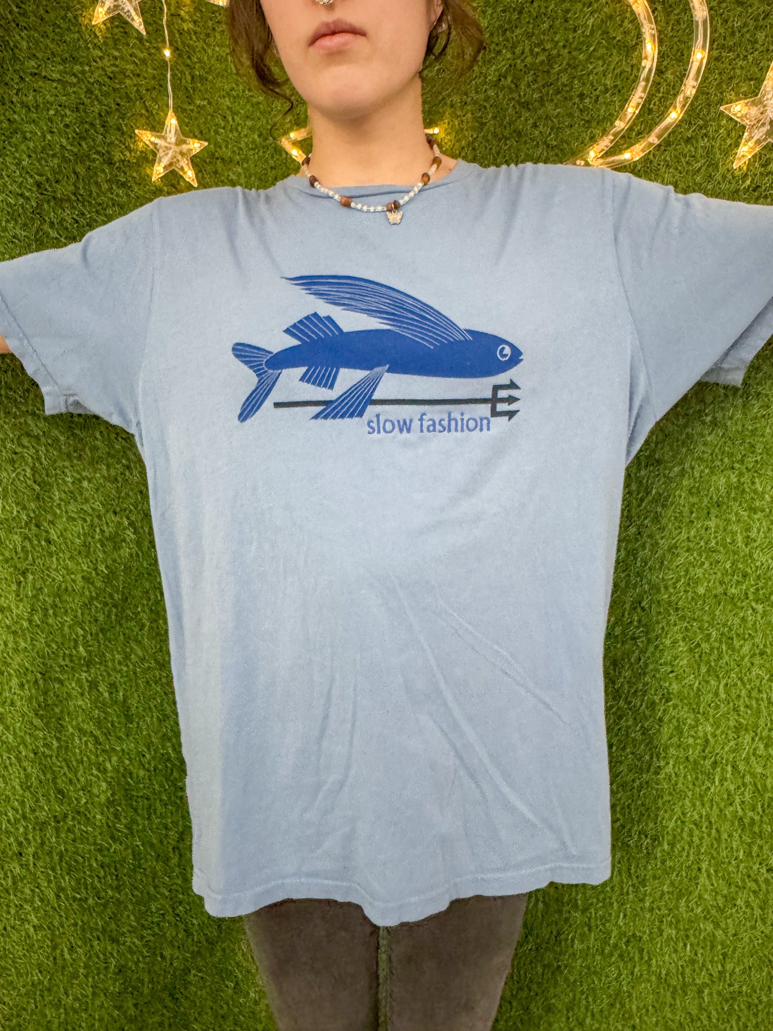 Boost your style and the environment with our Slow Fashion Fish T-Shirt. Made sustainably from upcycled materials and embroidered with a charming fish design. This secondhand garment supports small businesses and embraces the slow fashion movement. Make a statement while making a difference!