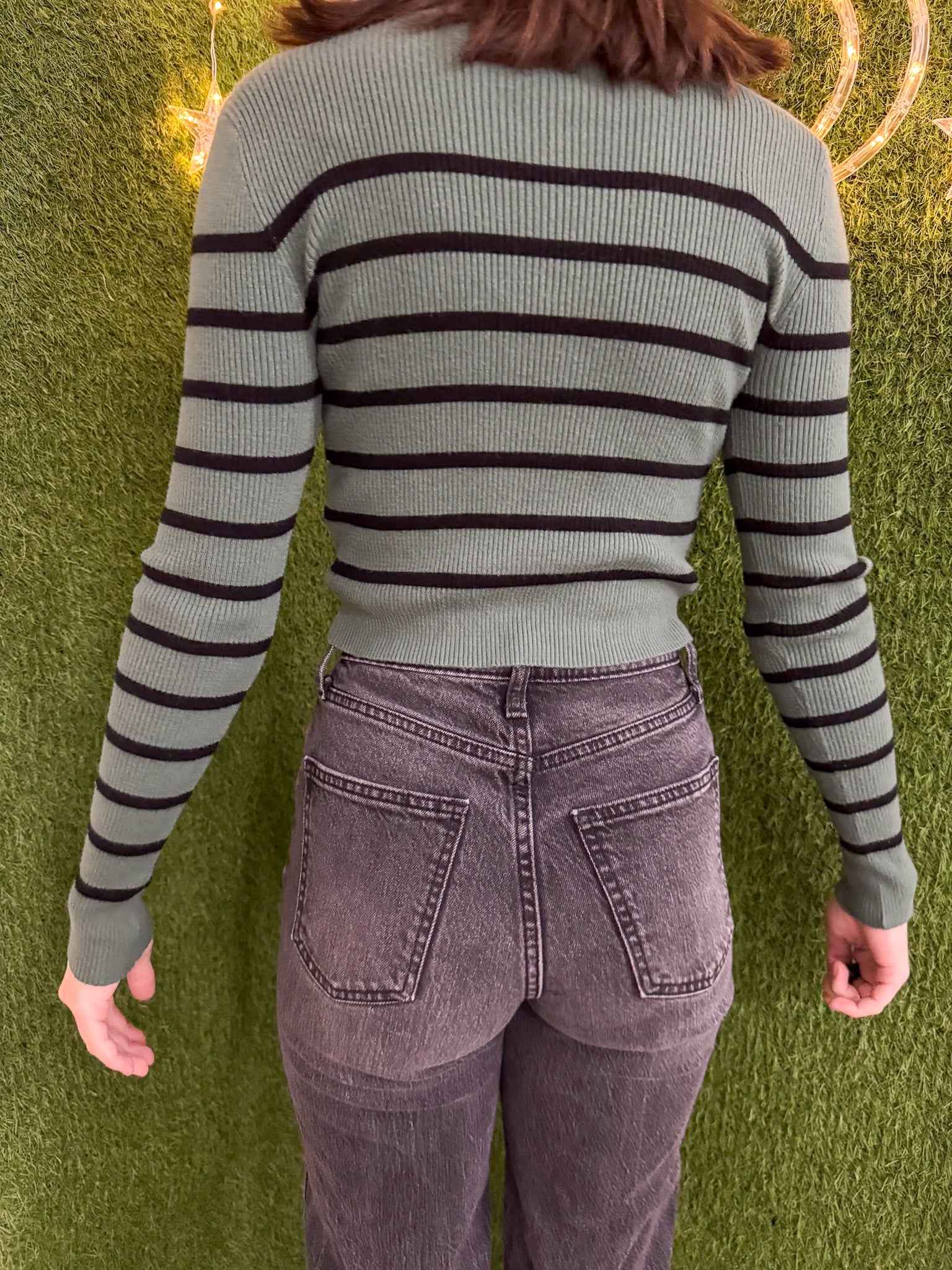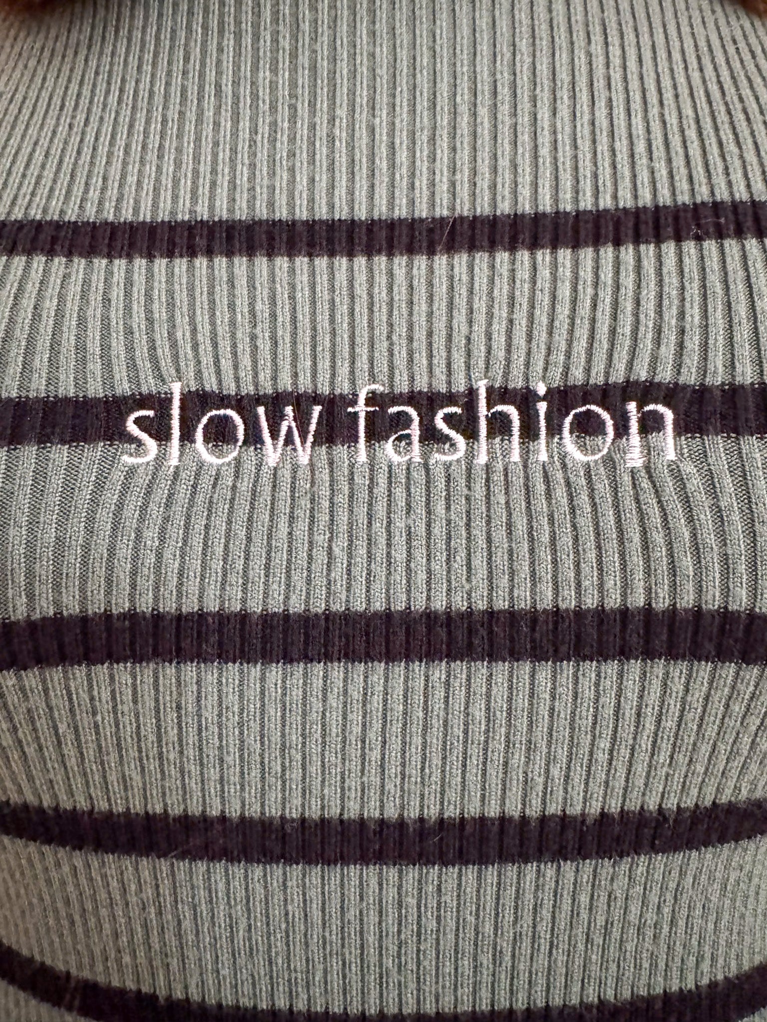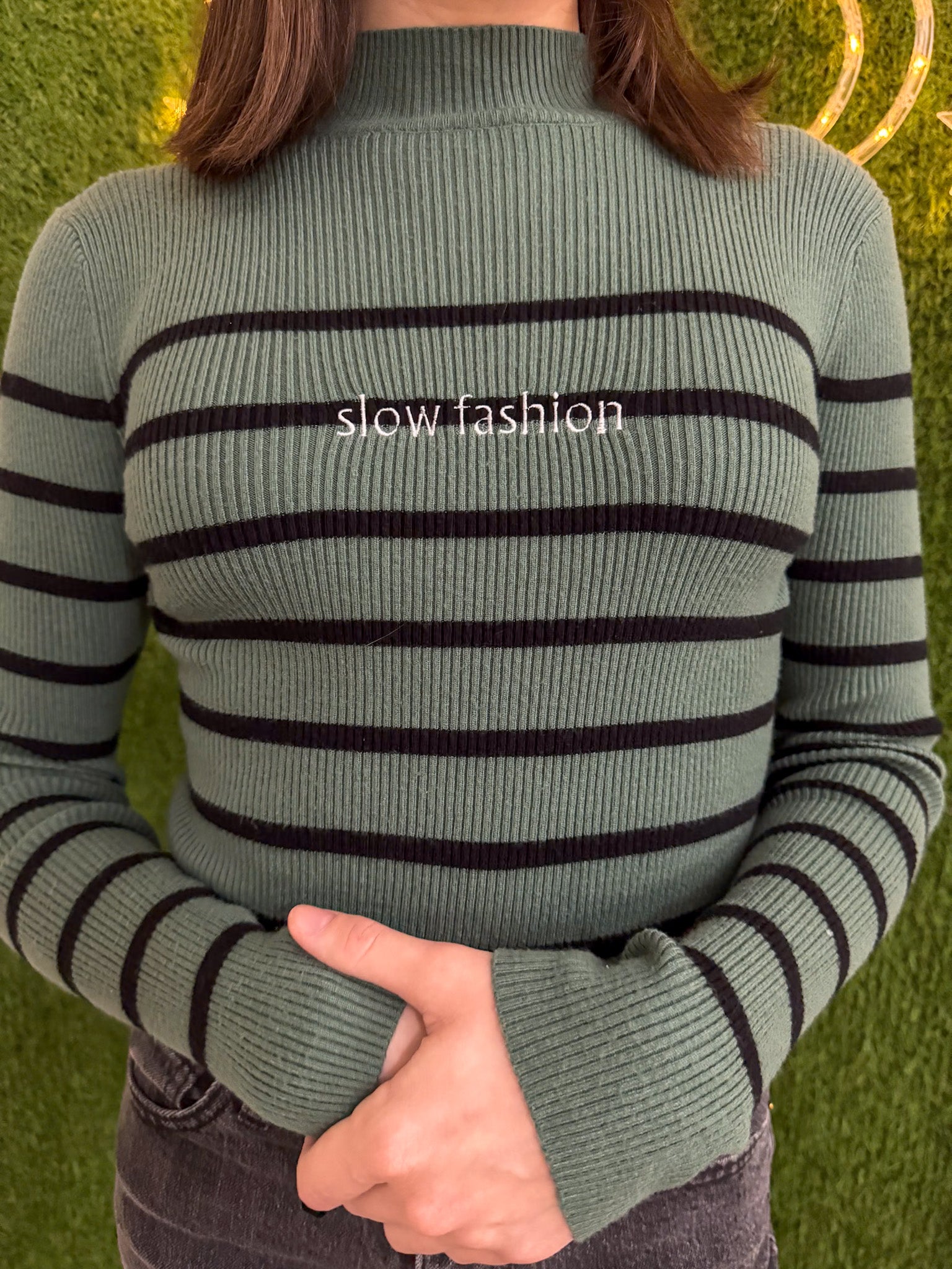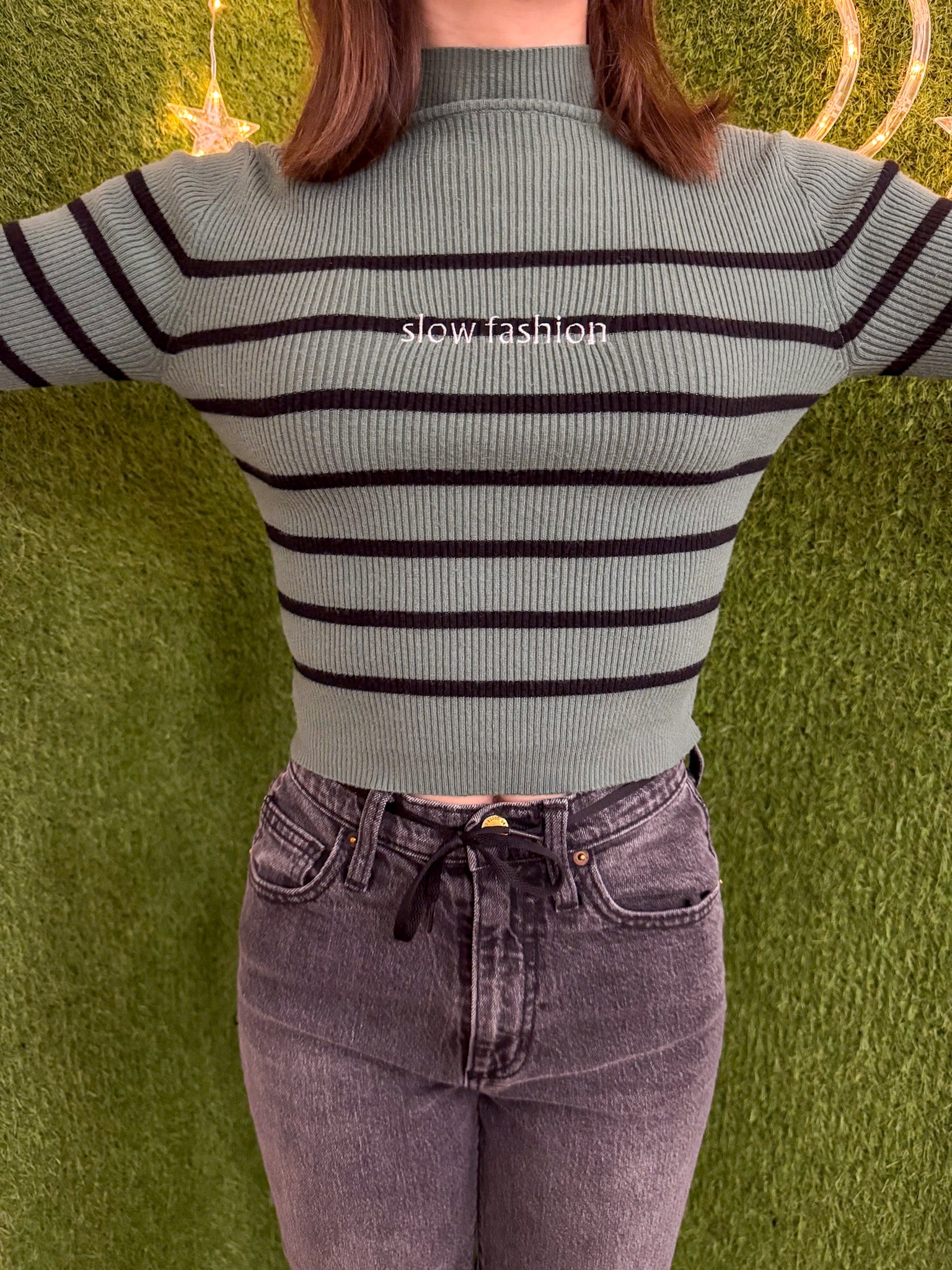 Stay on-trend with our Slow Fashion Green Striped Cropped Turtleneck. Made sustainably using upcycled materials, this secondhand garment is embroidered with love. Support our small biz while being thoughtful towards the environment<3
