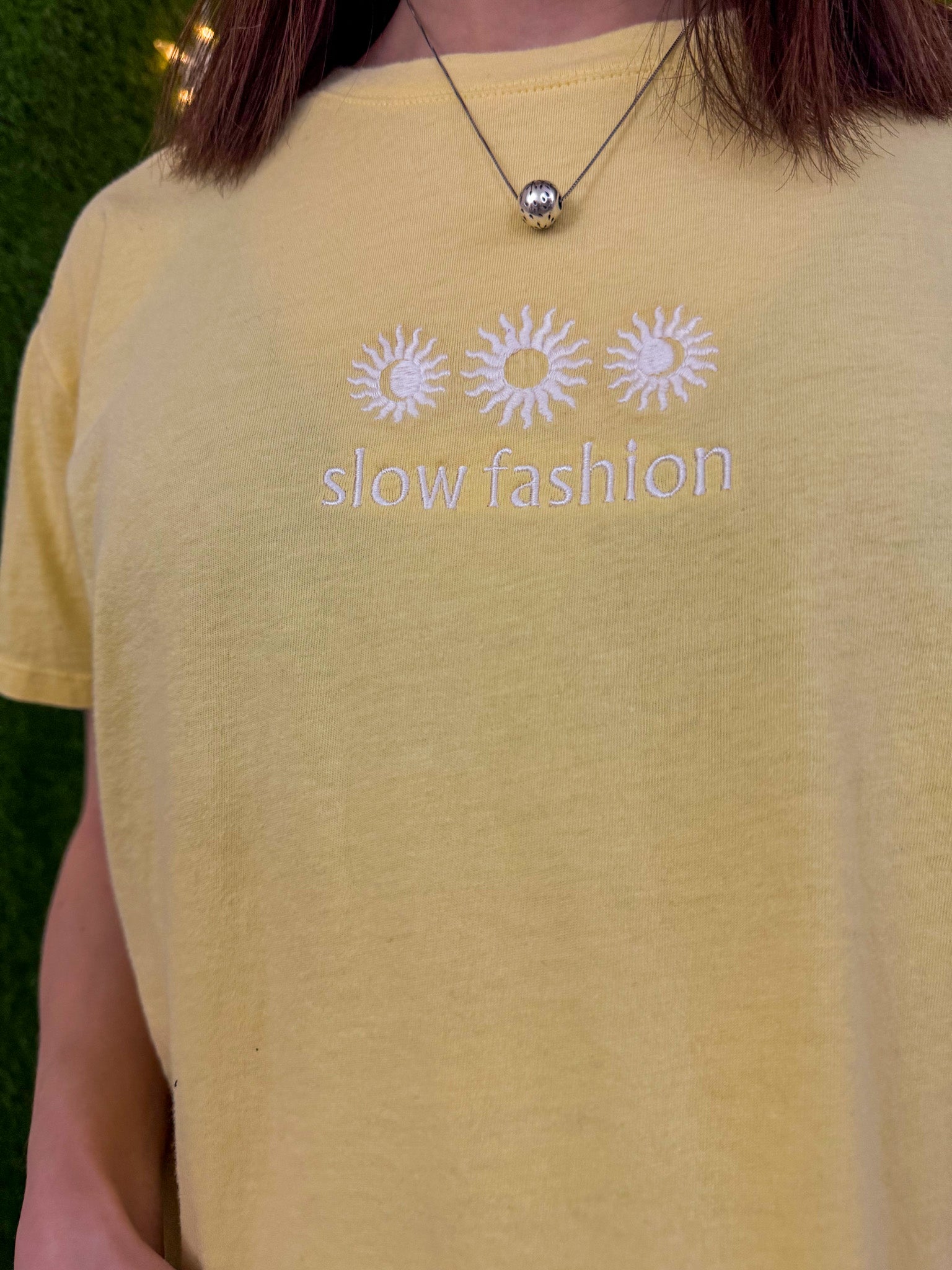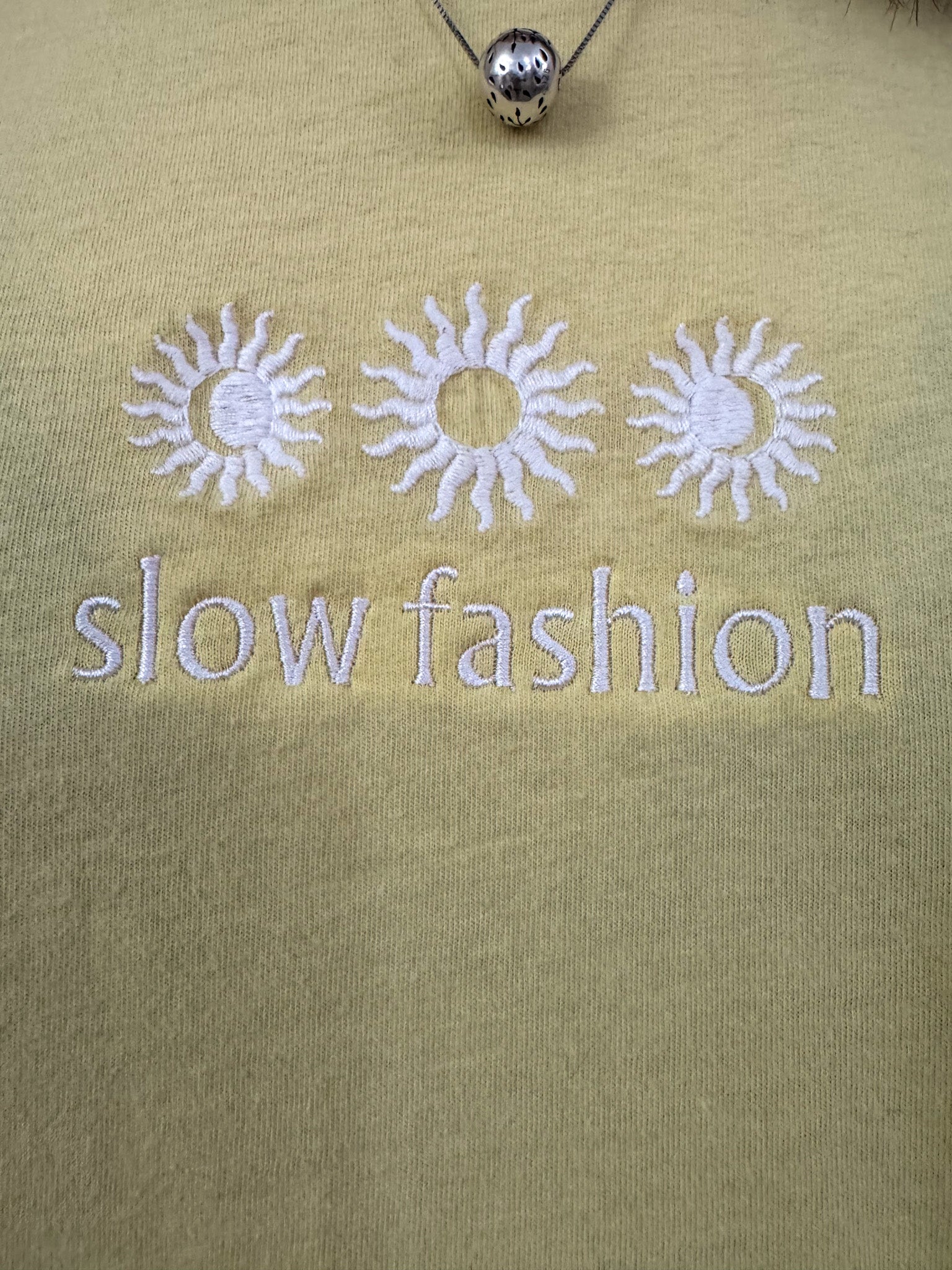 Elevate your style with our Slow Fashion Sun Cropped Yellow T-Shirt! This sustainable, upcycled, secondhand garment features an embroidered design. You'll not only look great, but also support our small biz and the slow fashion movement!