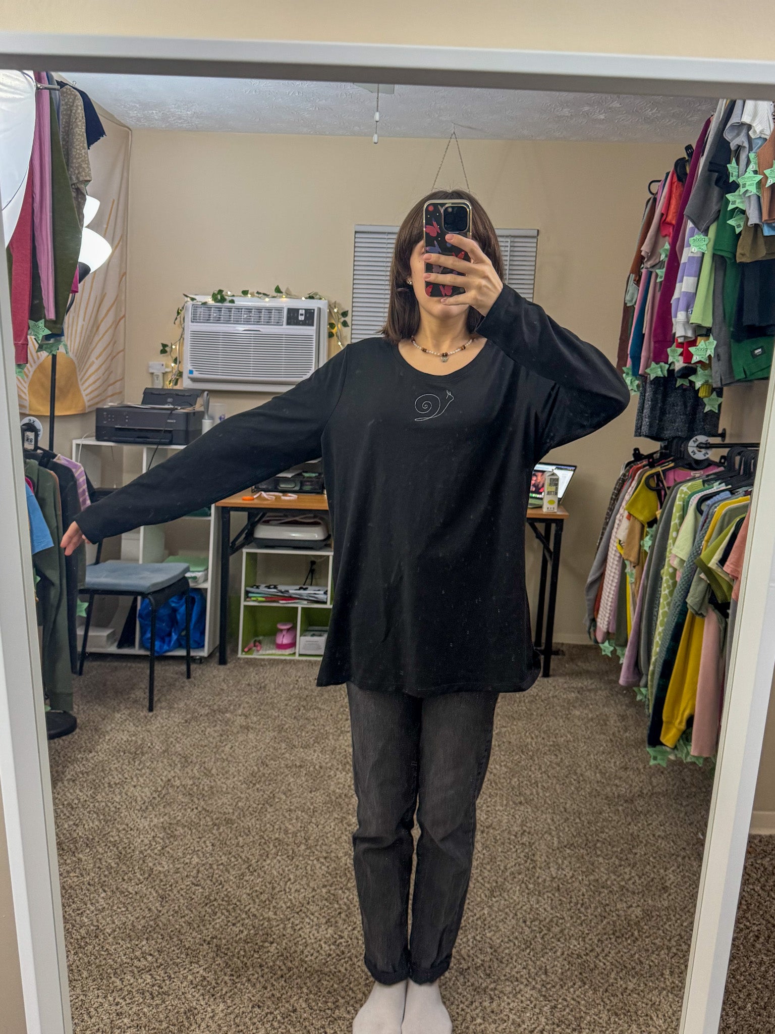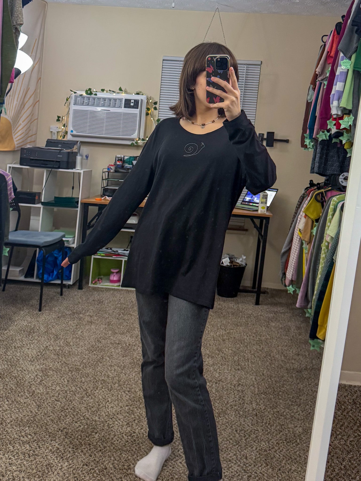Introducing our Snail Tee, embroidered by us to add a unique touch to your wardrobe. Support our small biz while rocking this upcycled, sustainable, and slow fashion piece made from a discarded secondhand garment.