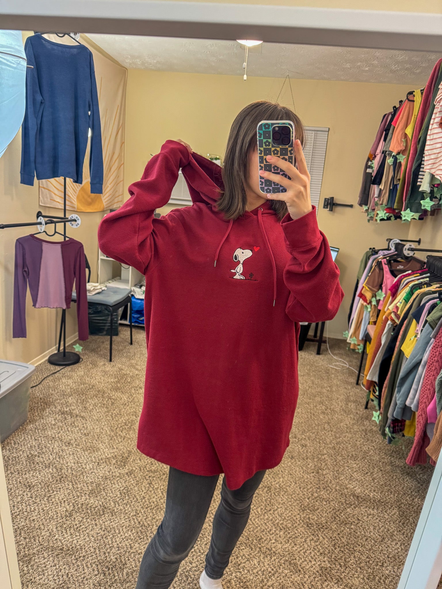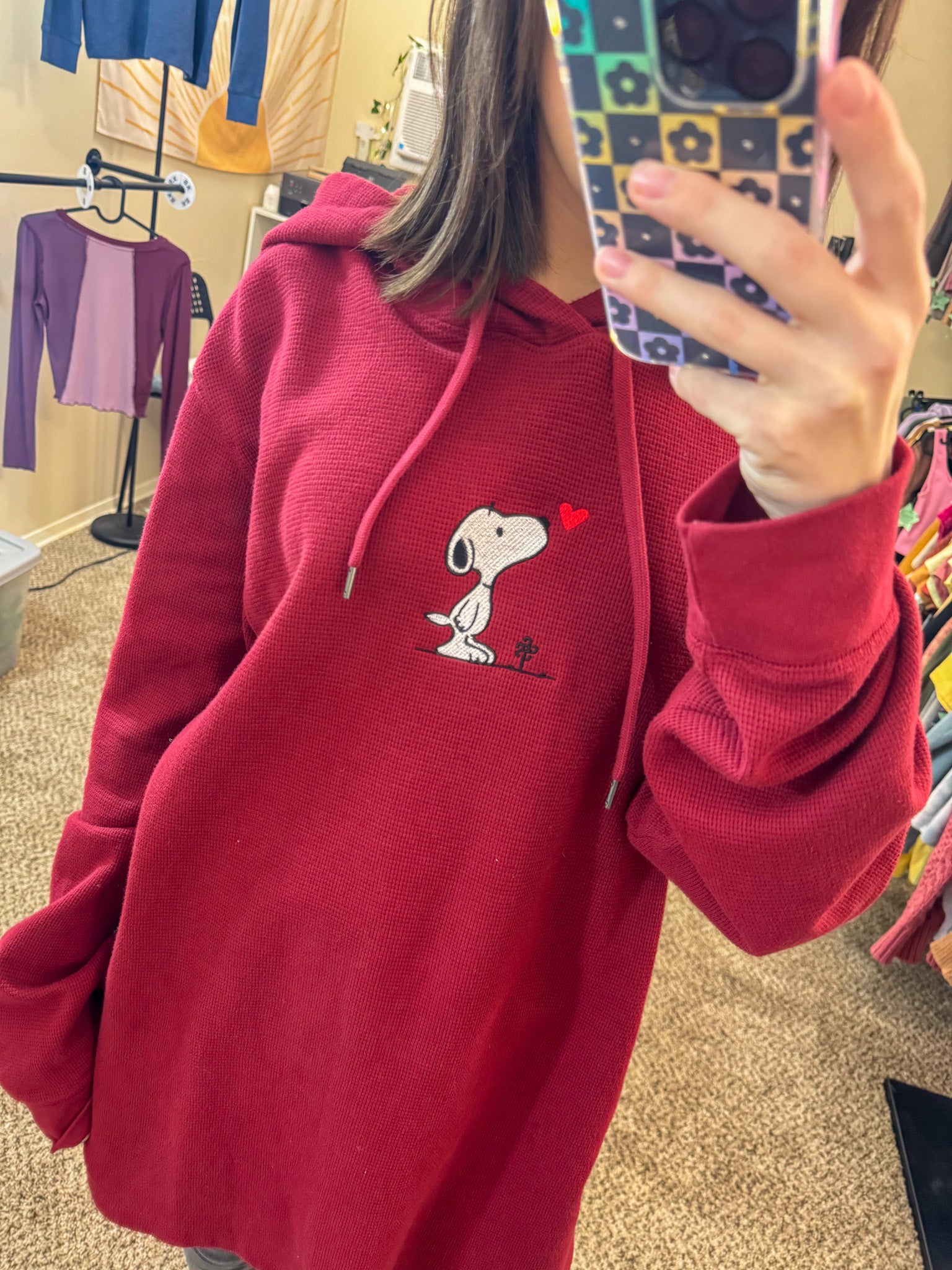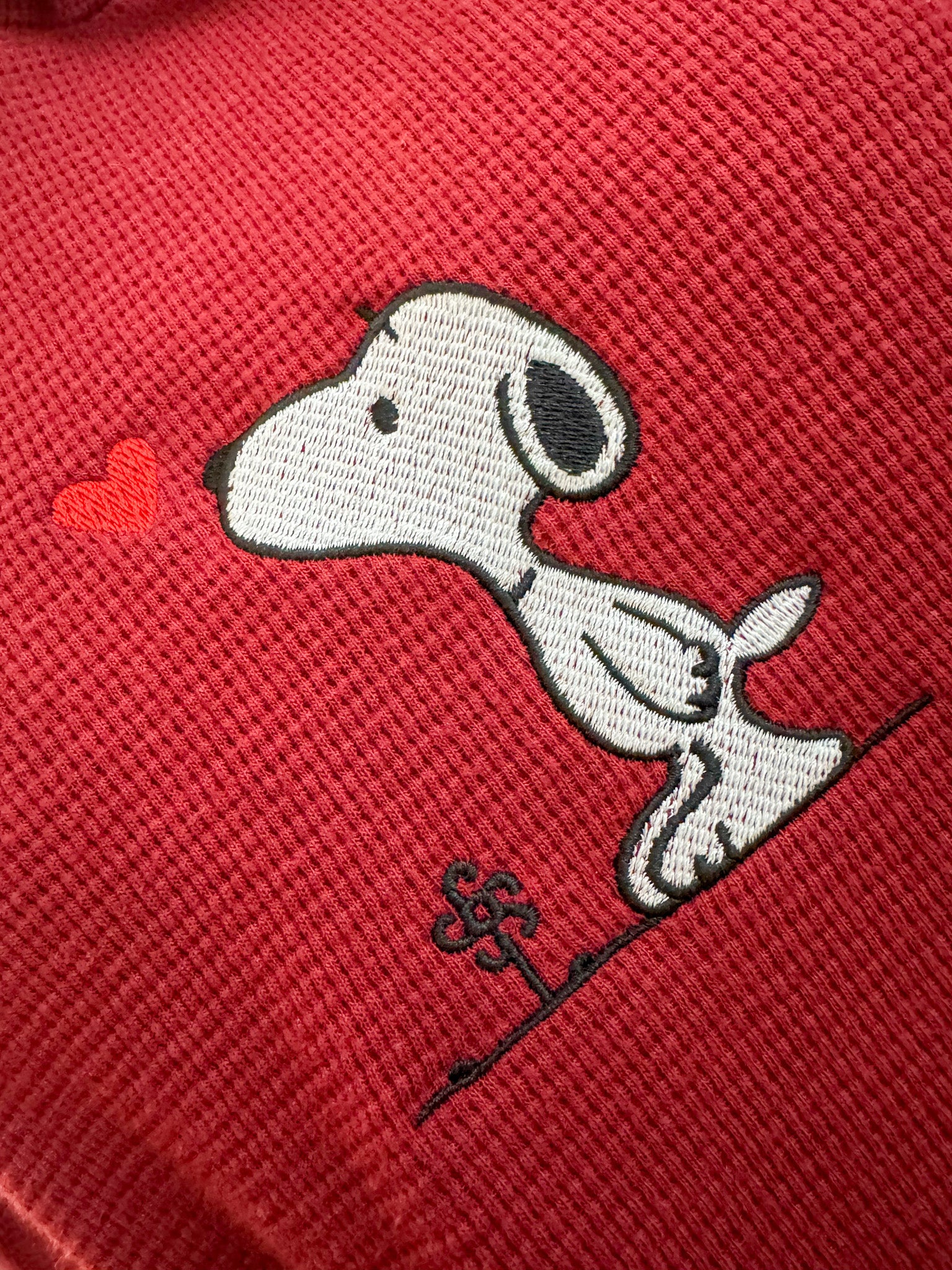 Stay cozy and stylish in our Snoopy Thermal Hoodie! This unique piece is not only embroidered by us, but it also supports our small biz and the environment. Upcycled from a discarded secondhand garment, it's the perfect choice for sustainable and slow fashion lovers!