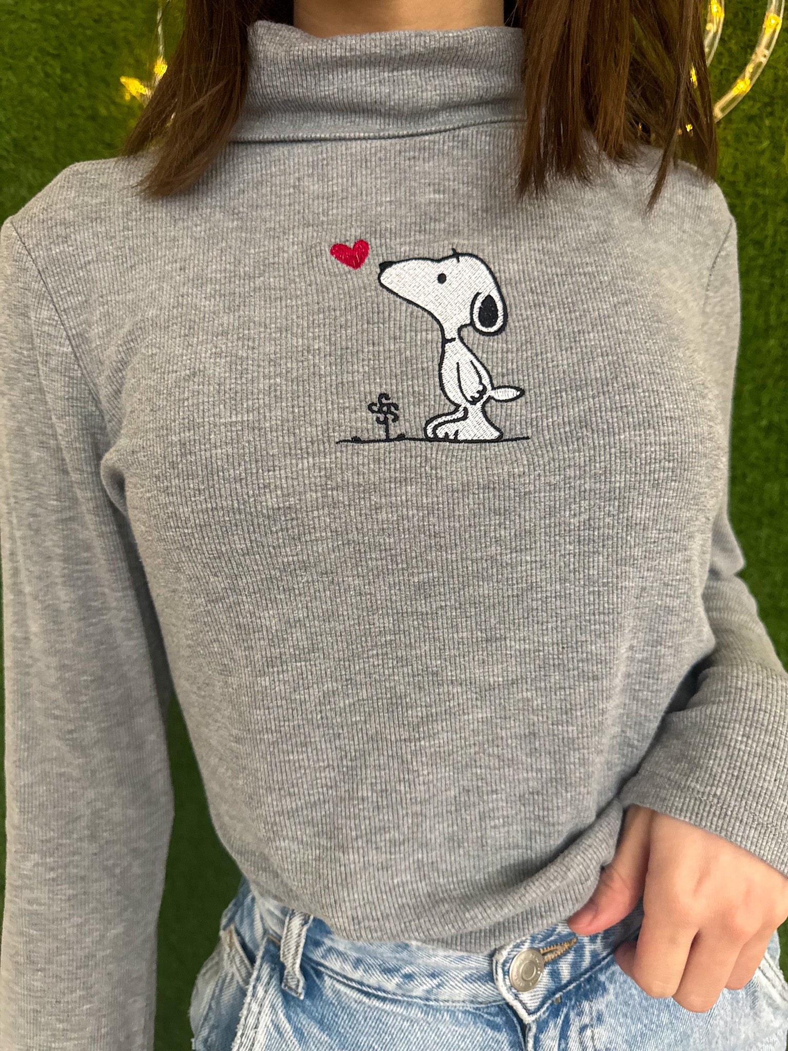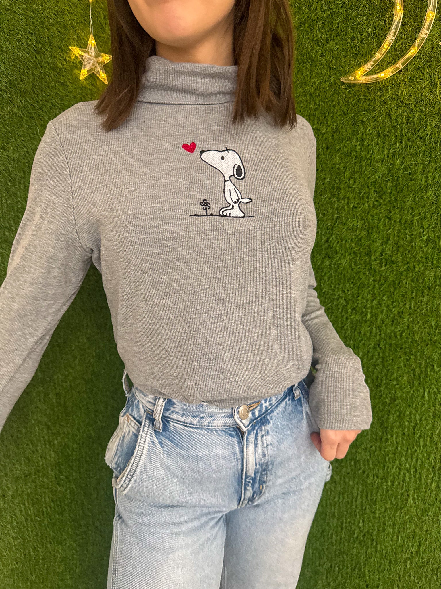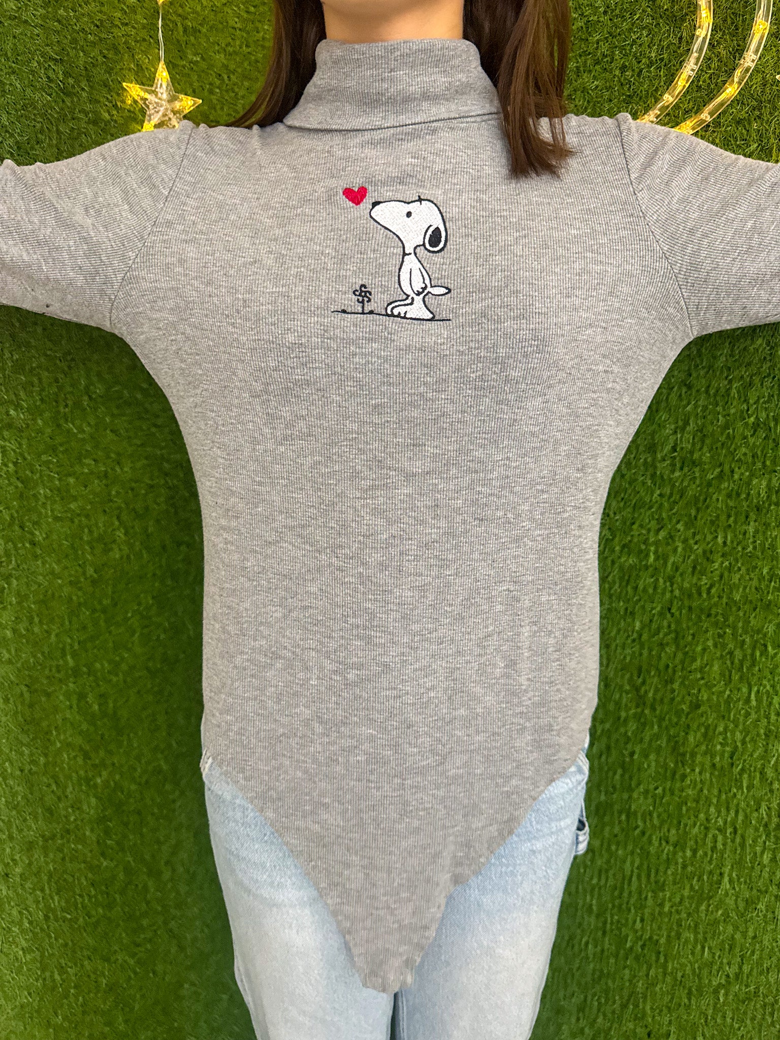 Discover the Snoopy Turtleneck Grey Bodysuit, an embroidered piece that supports our small biz. Made from upcycled and sustainable materials, this secondhand garment is the perfect slow fashion addition to your wardrobe<3