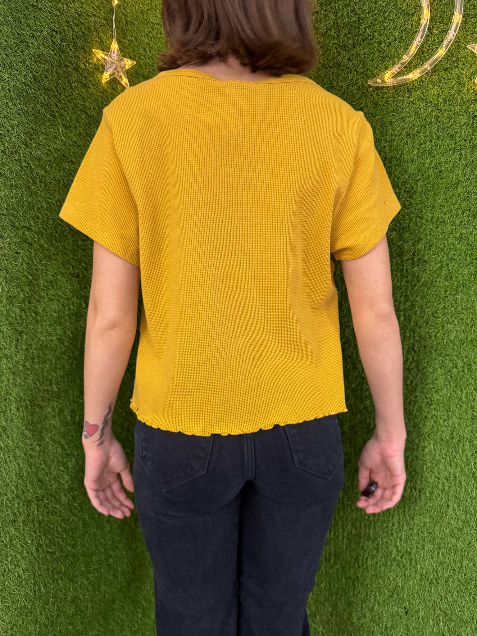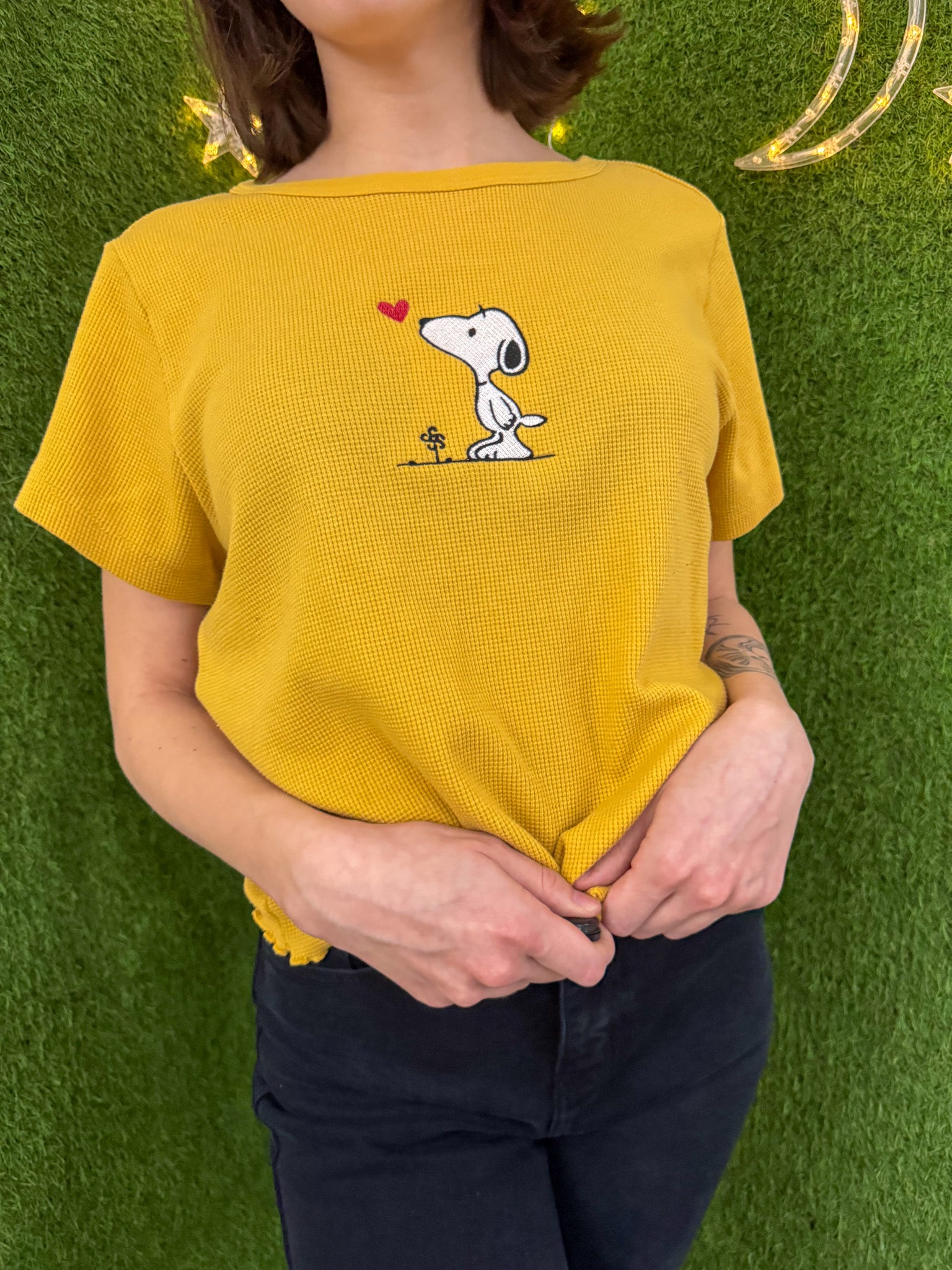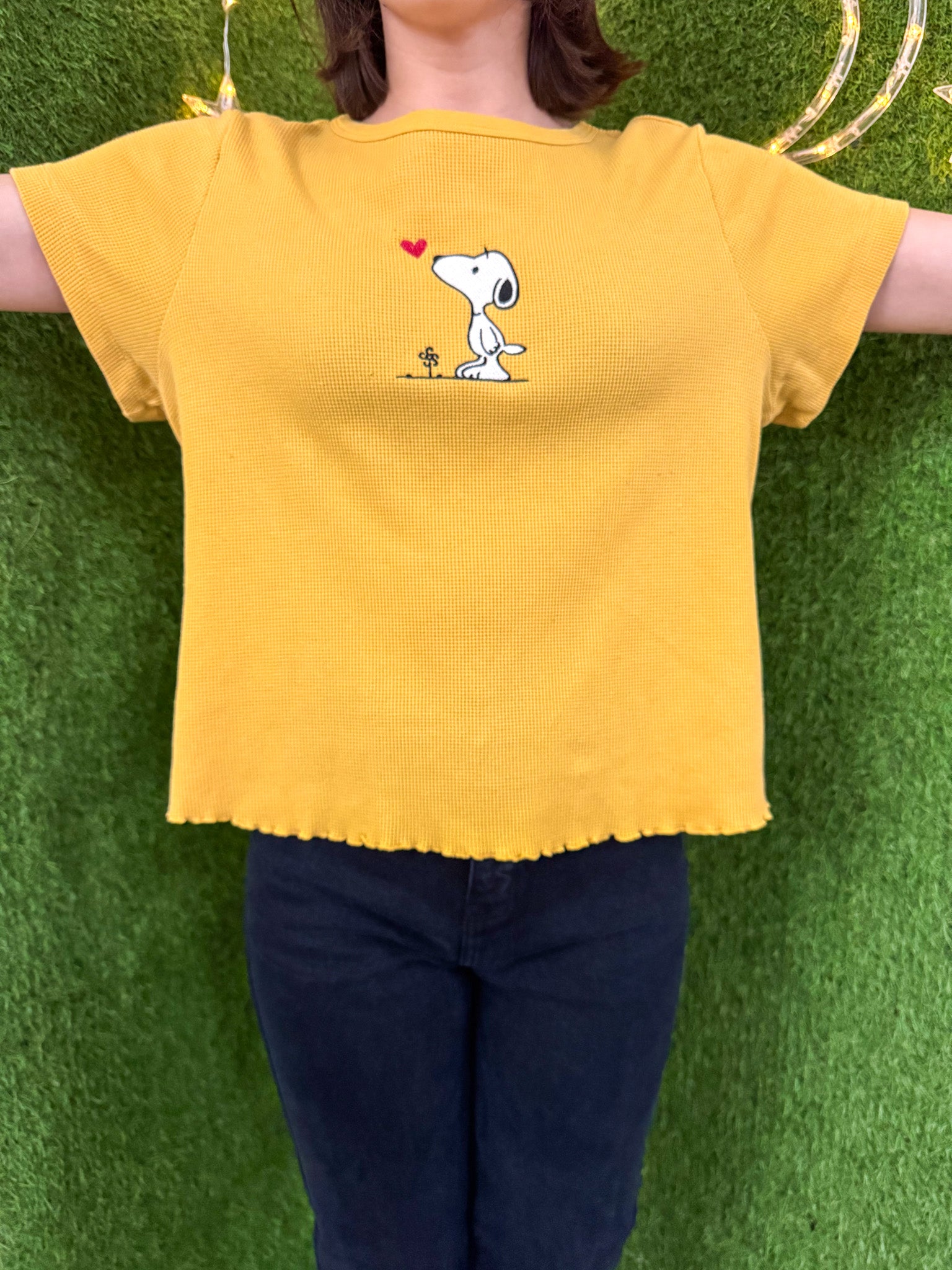 Support sustainable fashion with our Snoopy Yellow Scalloped Baby Tee. This upcycled, embroidered top is a secondhand garment that supports our small biz and promotes slow fashion. Look cute and feel good about your eco-friendly fashion choices!!