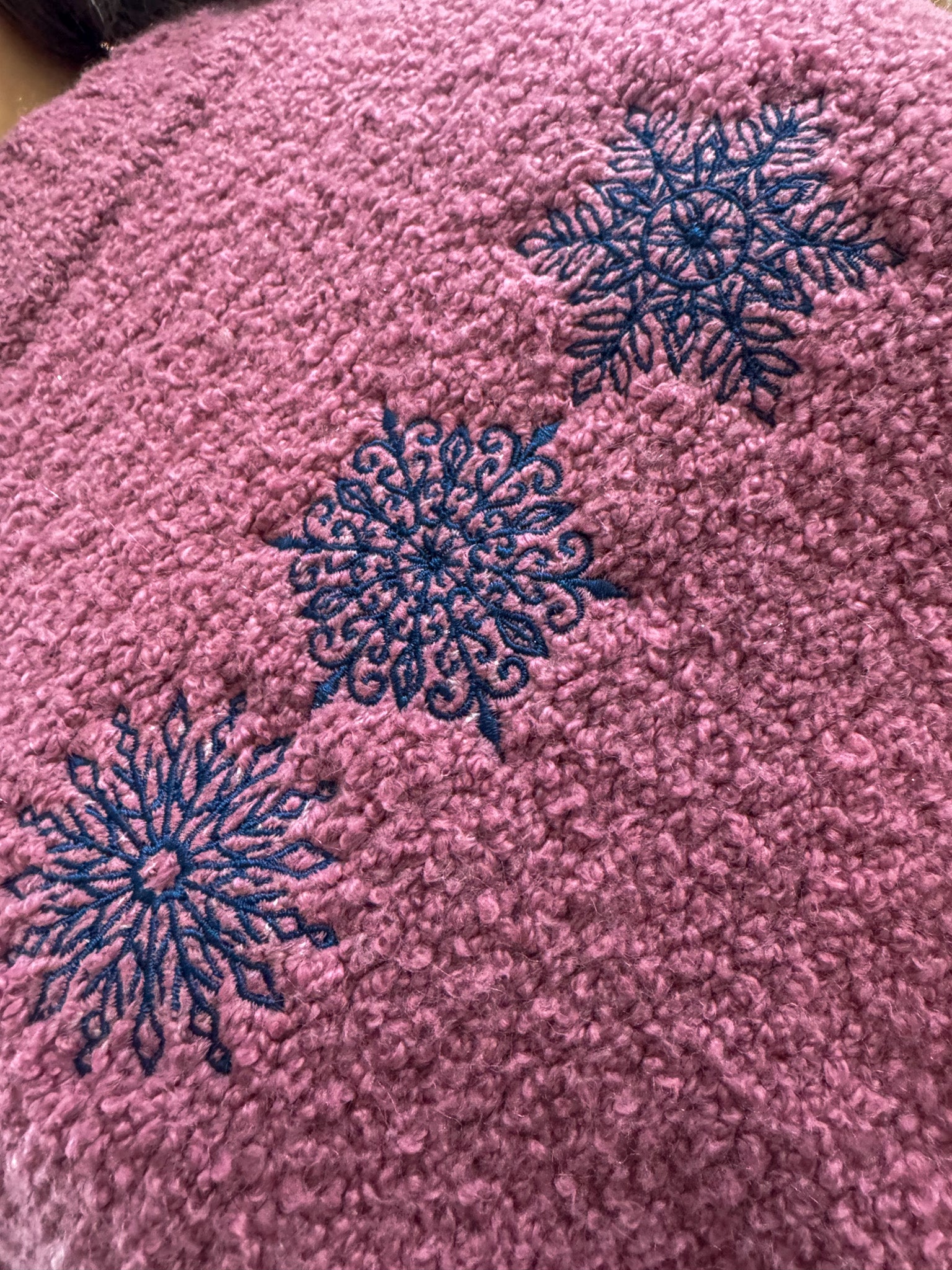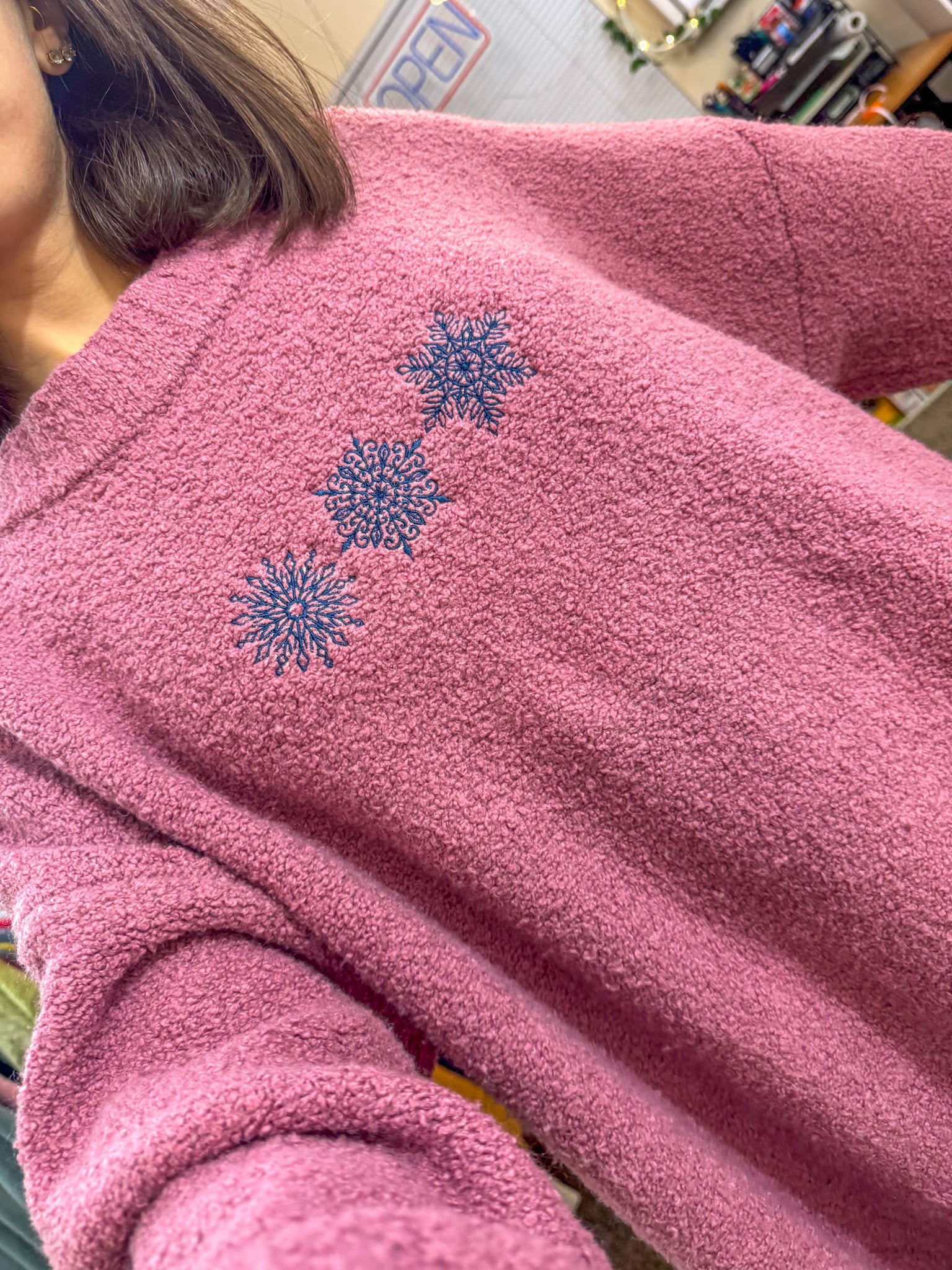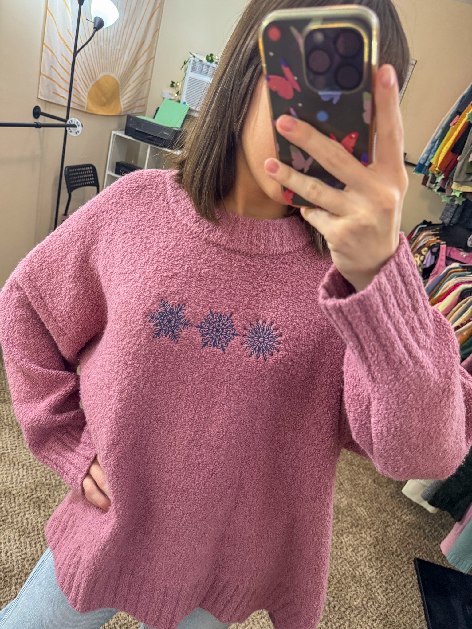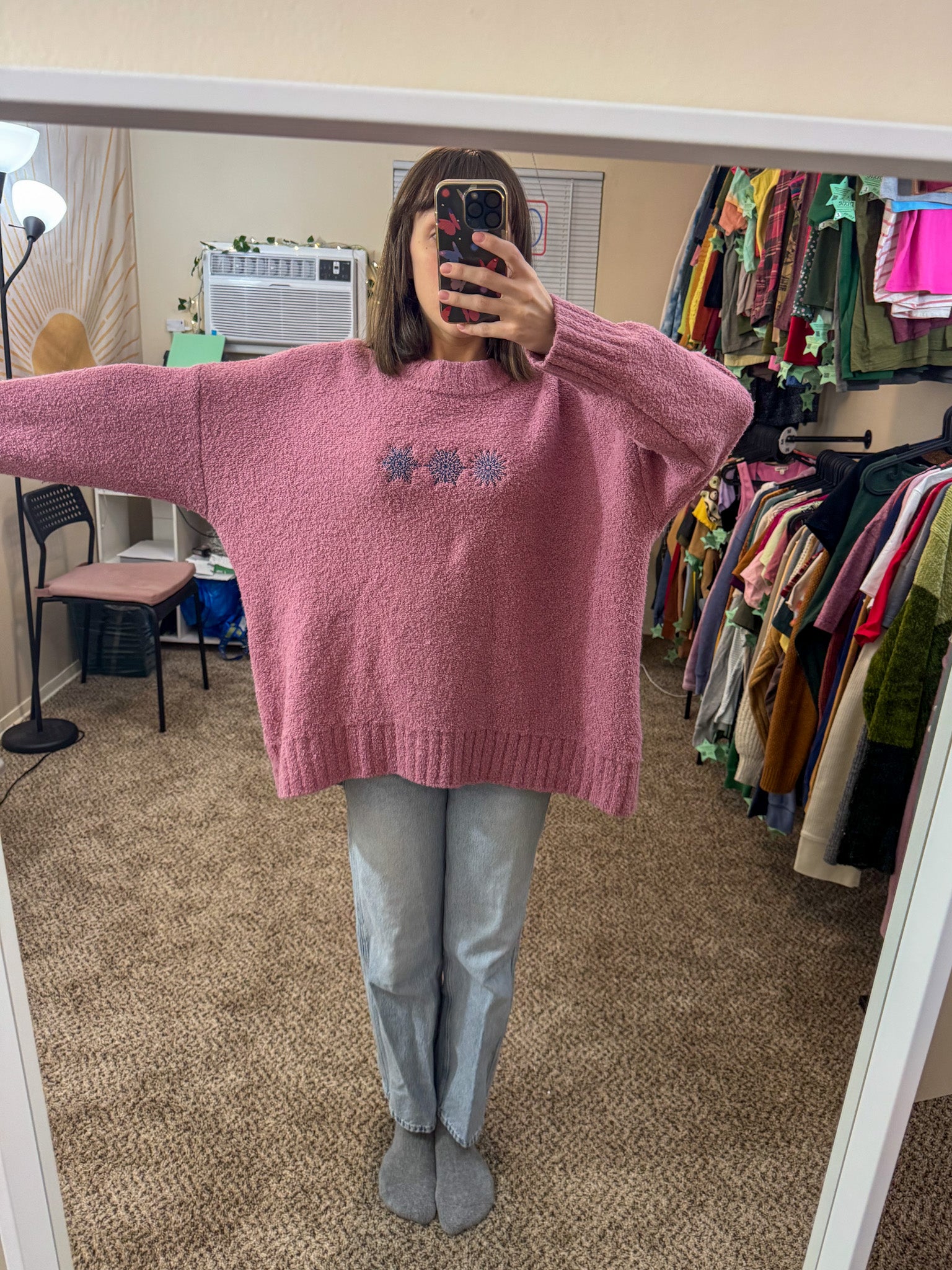 This Snowflake Pink Sweater is embroidered by us and upcycled from a discarded secondhand garment. Support our small biz with this sustainable and slow fashion piece!
