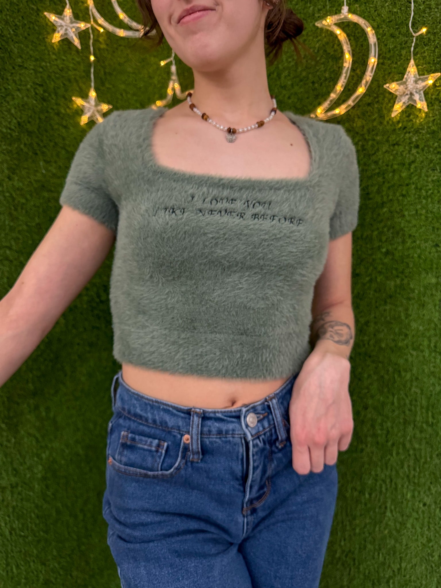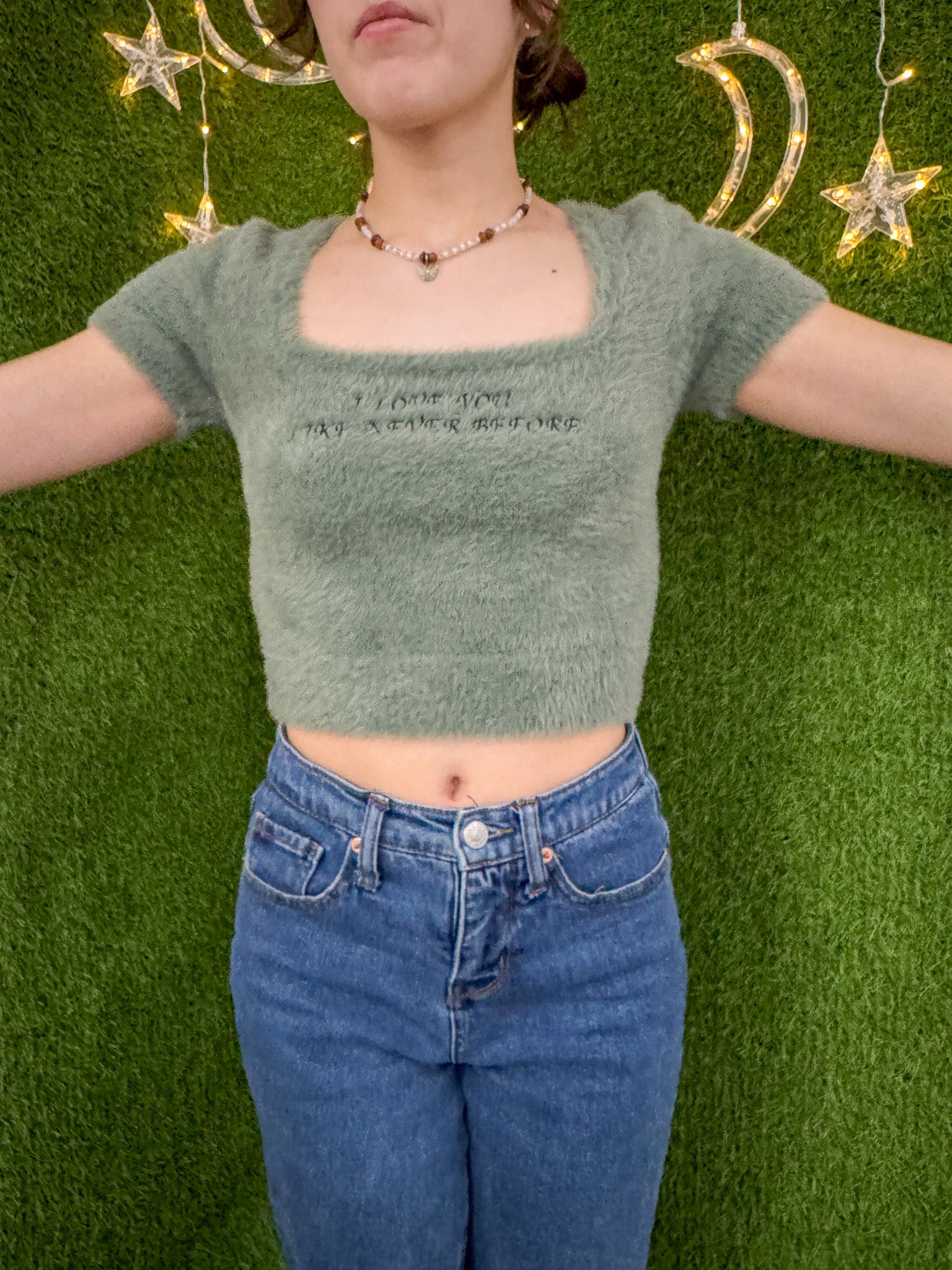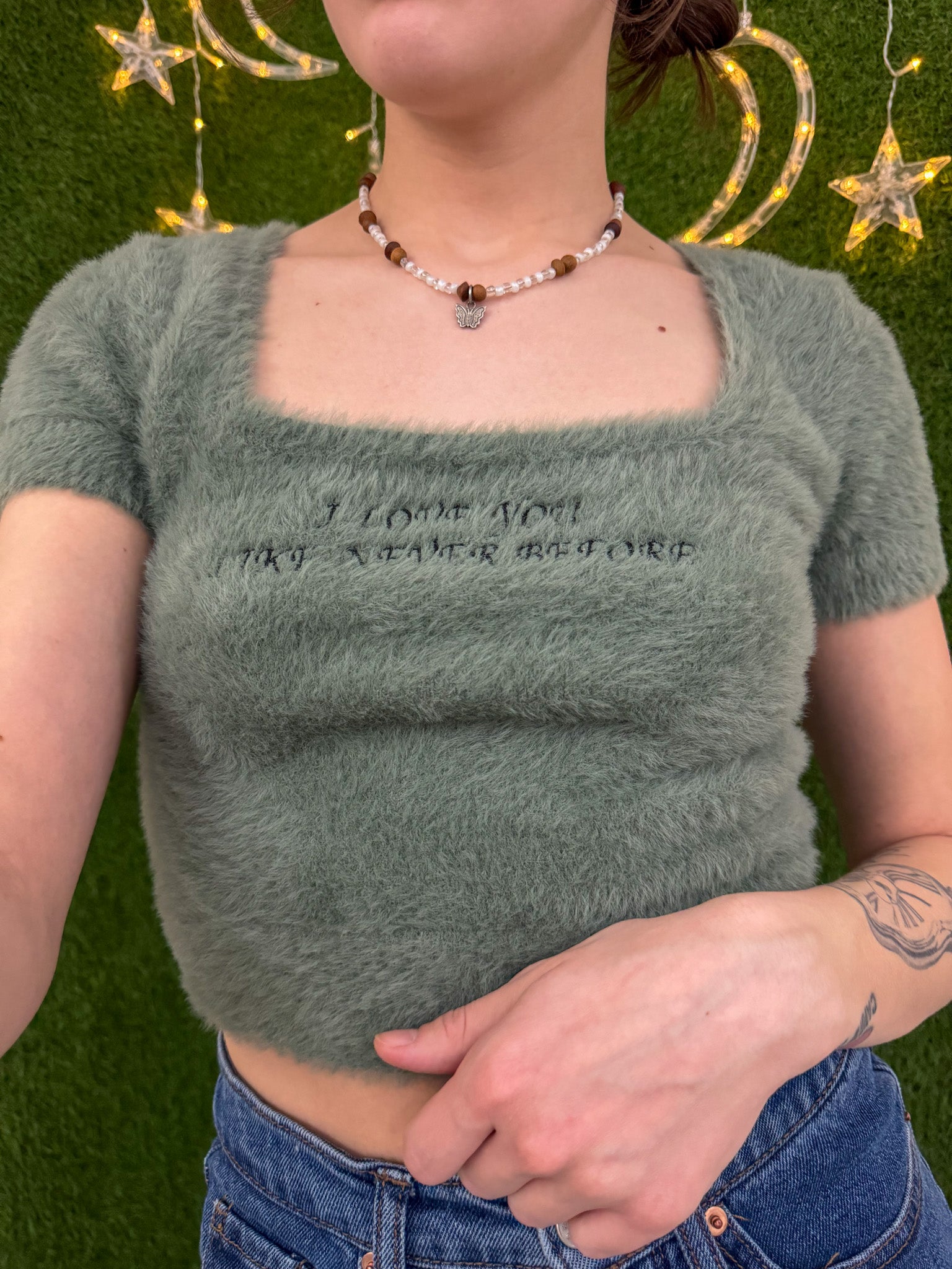 Add a touch of playful charm to your wardrobe with the Songbird Fuzzy Baby Tee. This embroidered tee not only supports our small biz, but it is also upcycled from a secondhand garment, making it a sustainable choice in slow fashion!