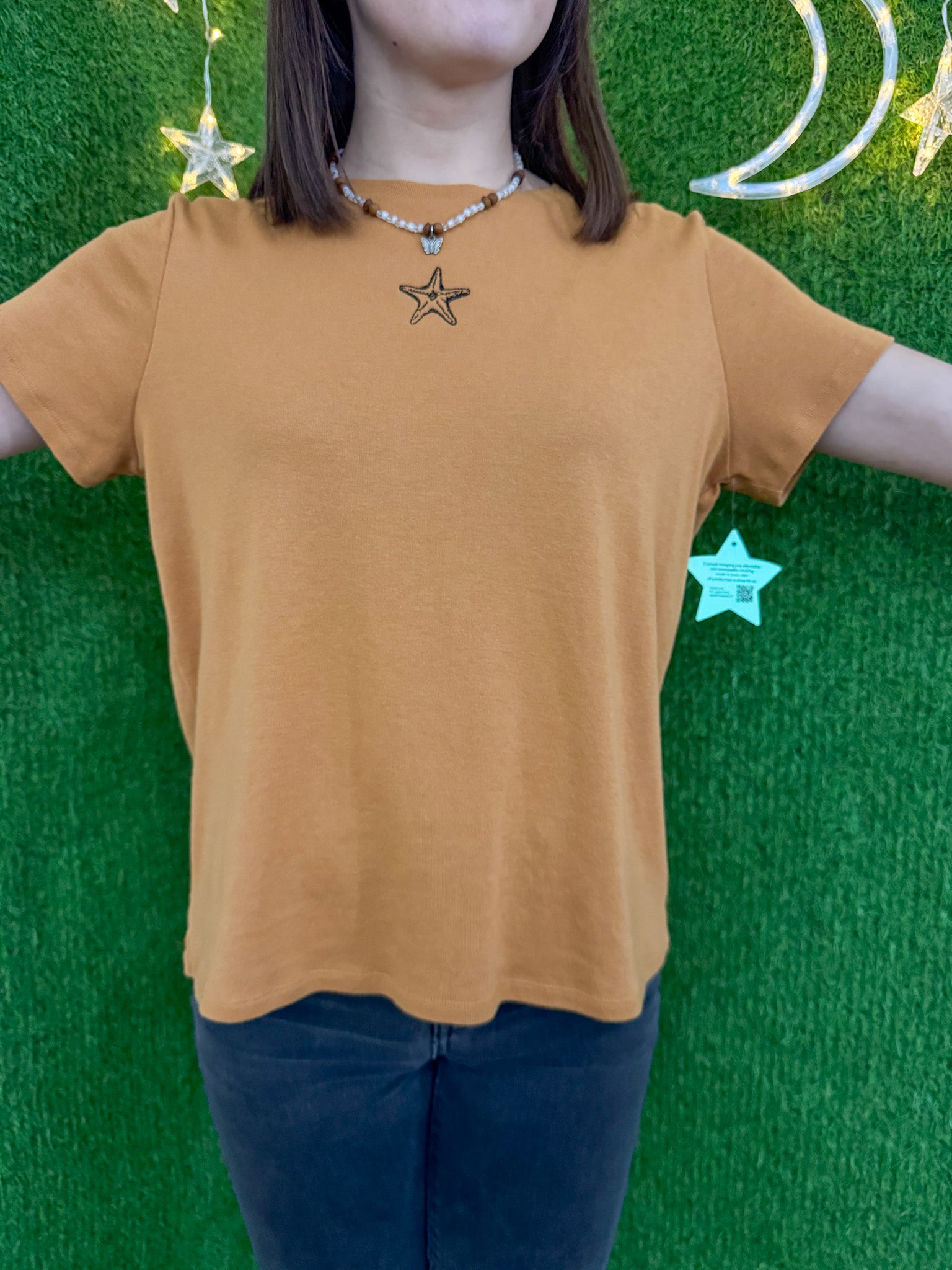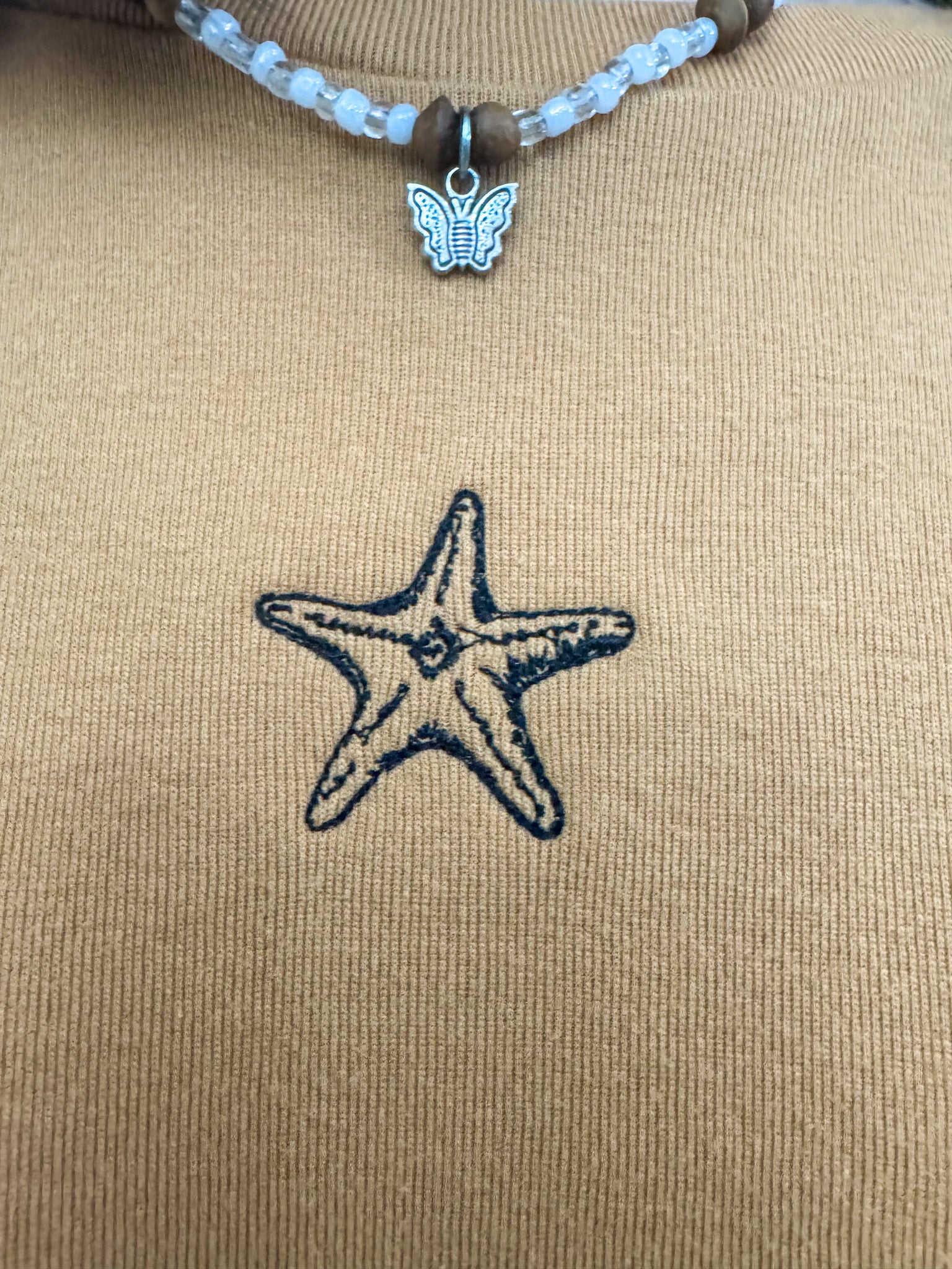 Be the star of sustainable fashion with our Starfish Tan Tee! Made from upcycled fabric and embroidered with love, it's a perfect choice to support small businesses and the environment. This discarded secondhand garment is a stylish example of slow fashion. Wear it and make a statement!