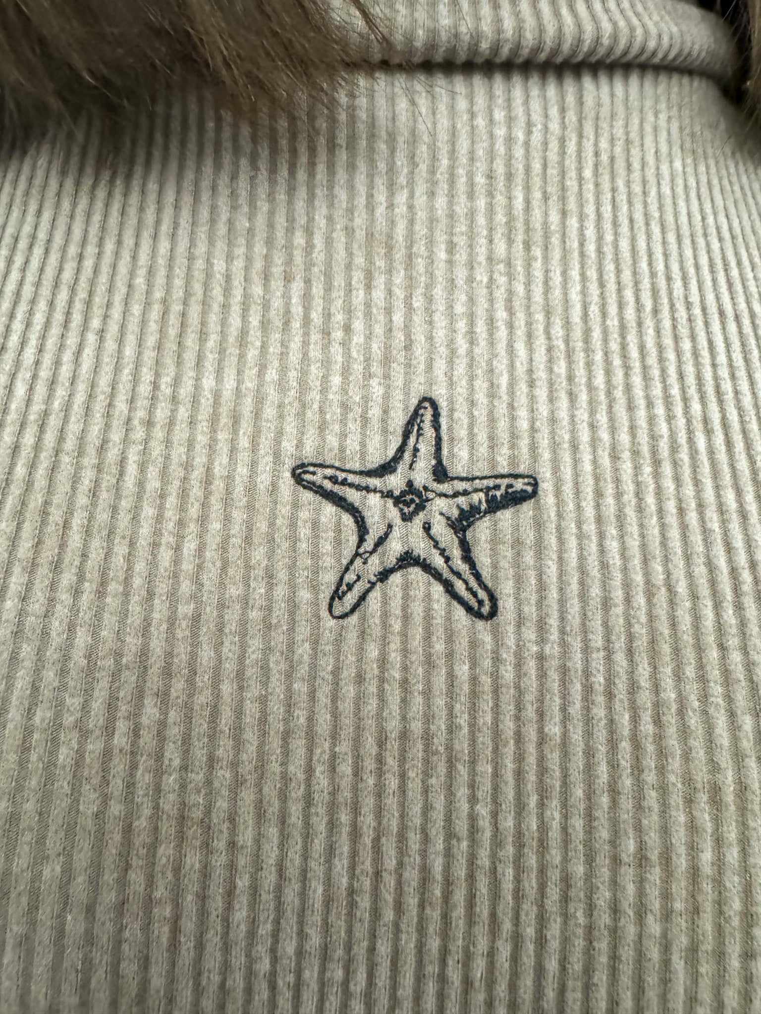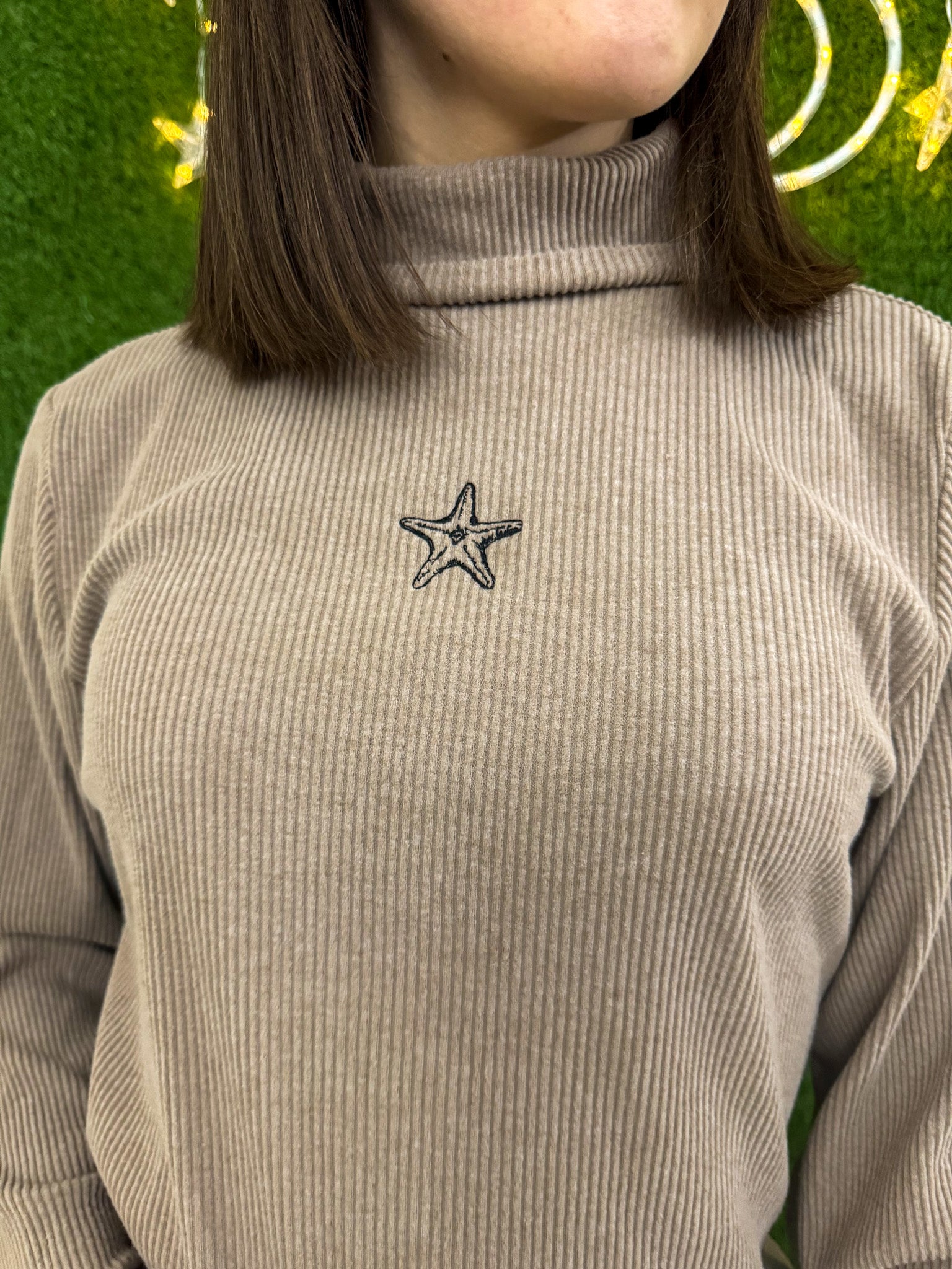 This embroidered Starfish Tan Turtleneck is more than just a stylish piece, it's a sustainable and upcycled garment which supports small businesses and promotes slow fashion. Made from discarded secondhand clothing, it's a unique addition to your wardrobe with a positive impact!