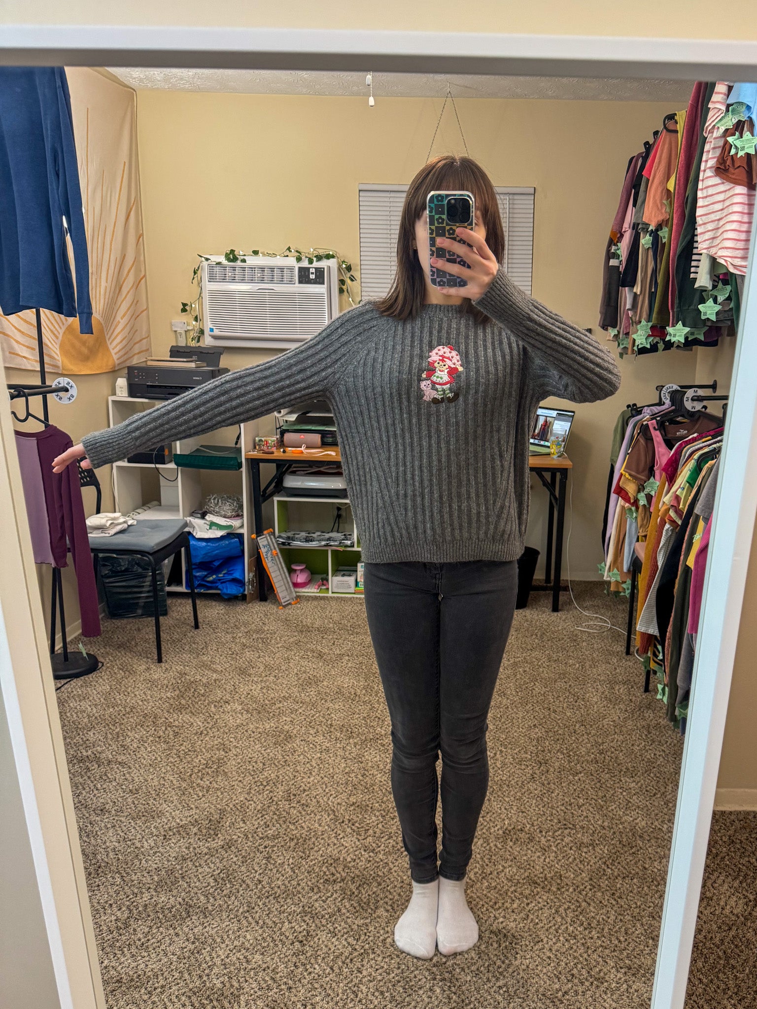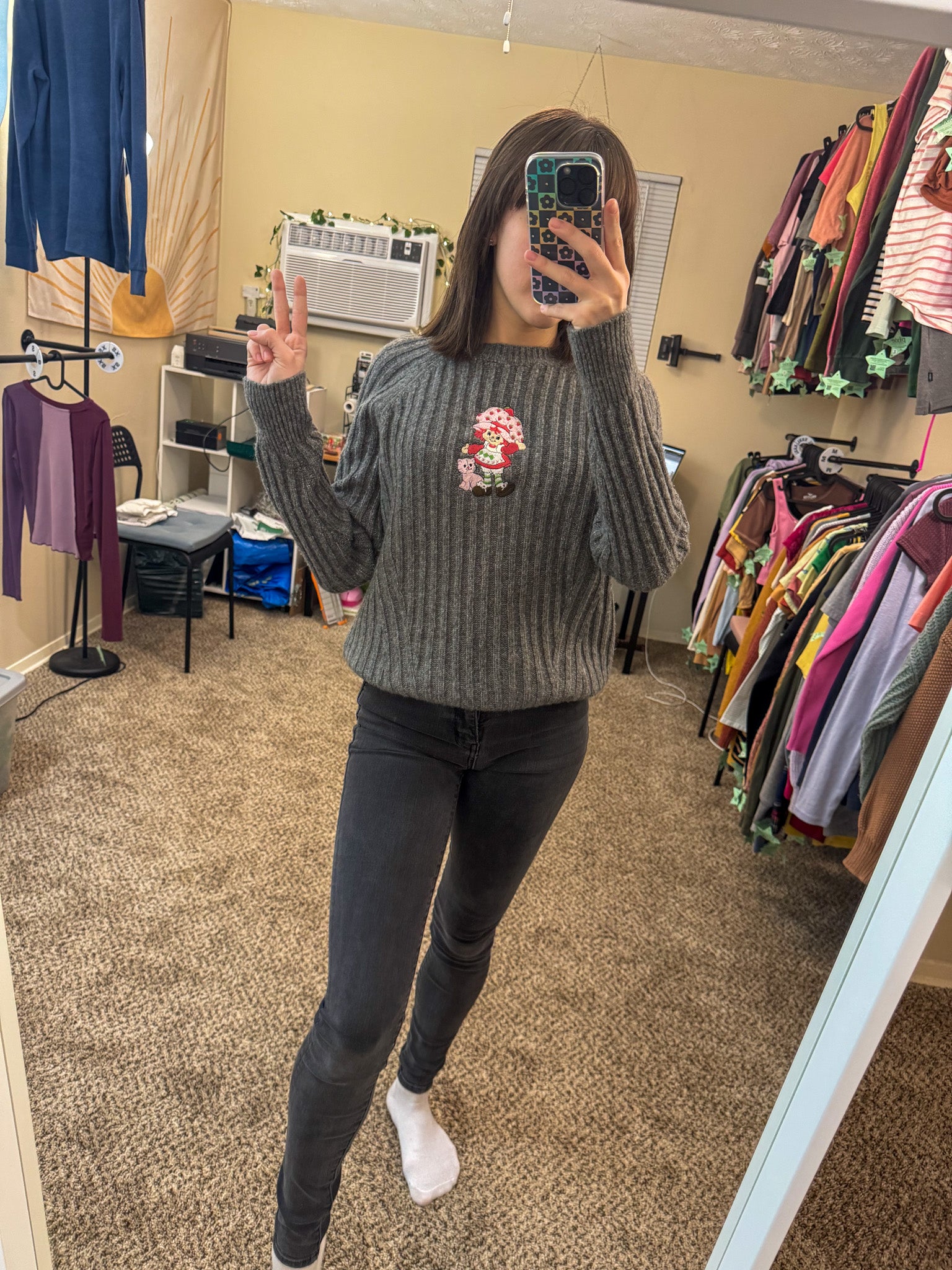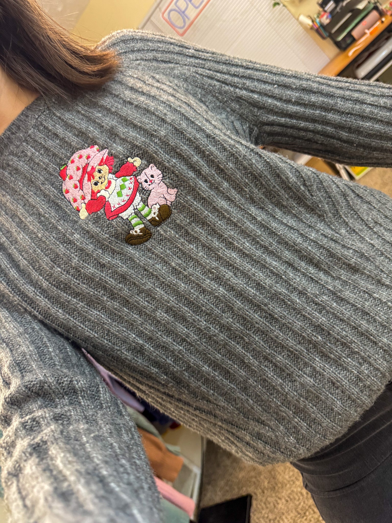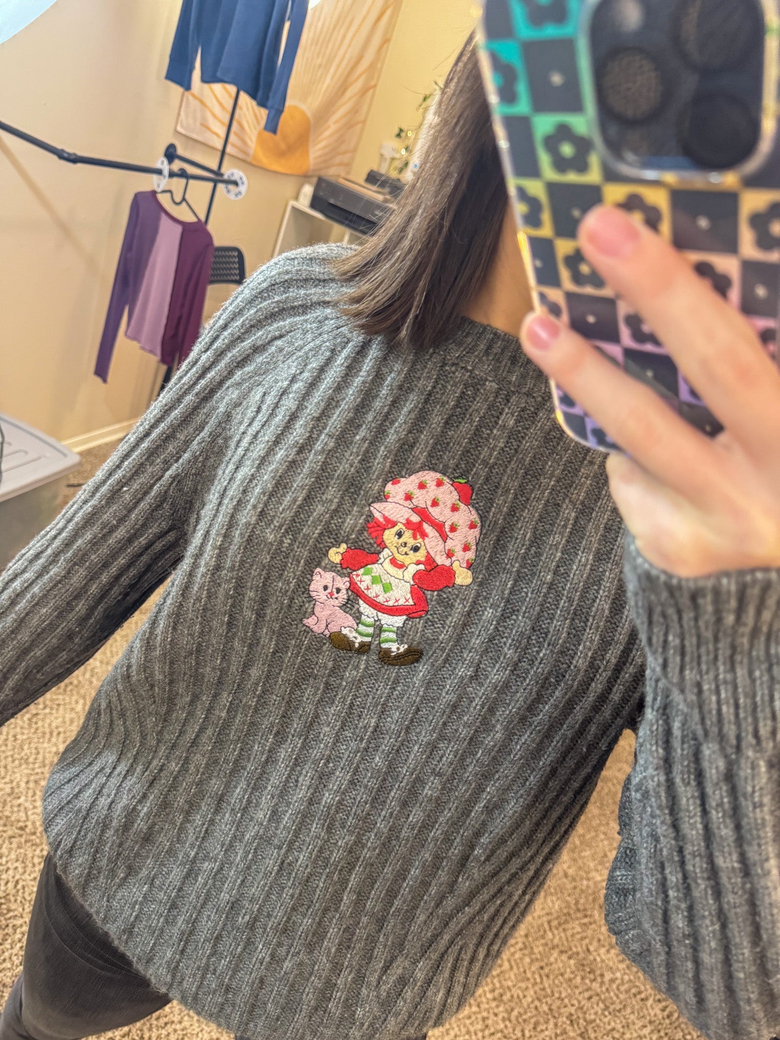 This Grey Sweater is embroidered by us and upcycled from a discarded secondhand garment, supporting our small biz. It's sustainable and a part of the slow fashion movement. Keep cozy and quirky in this Strawberry Shortcake sweater!