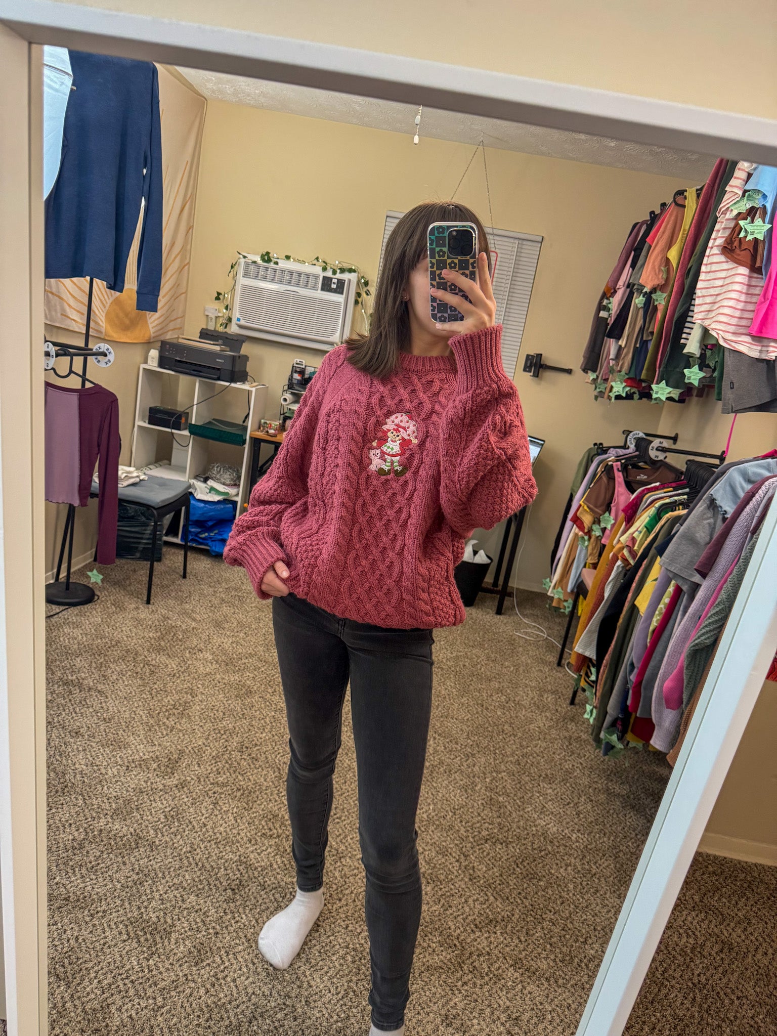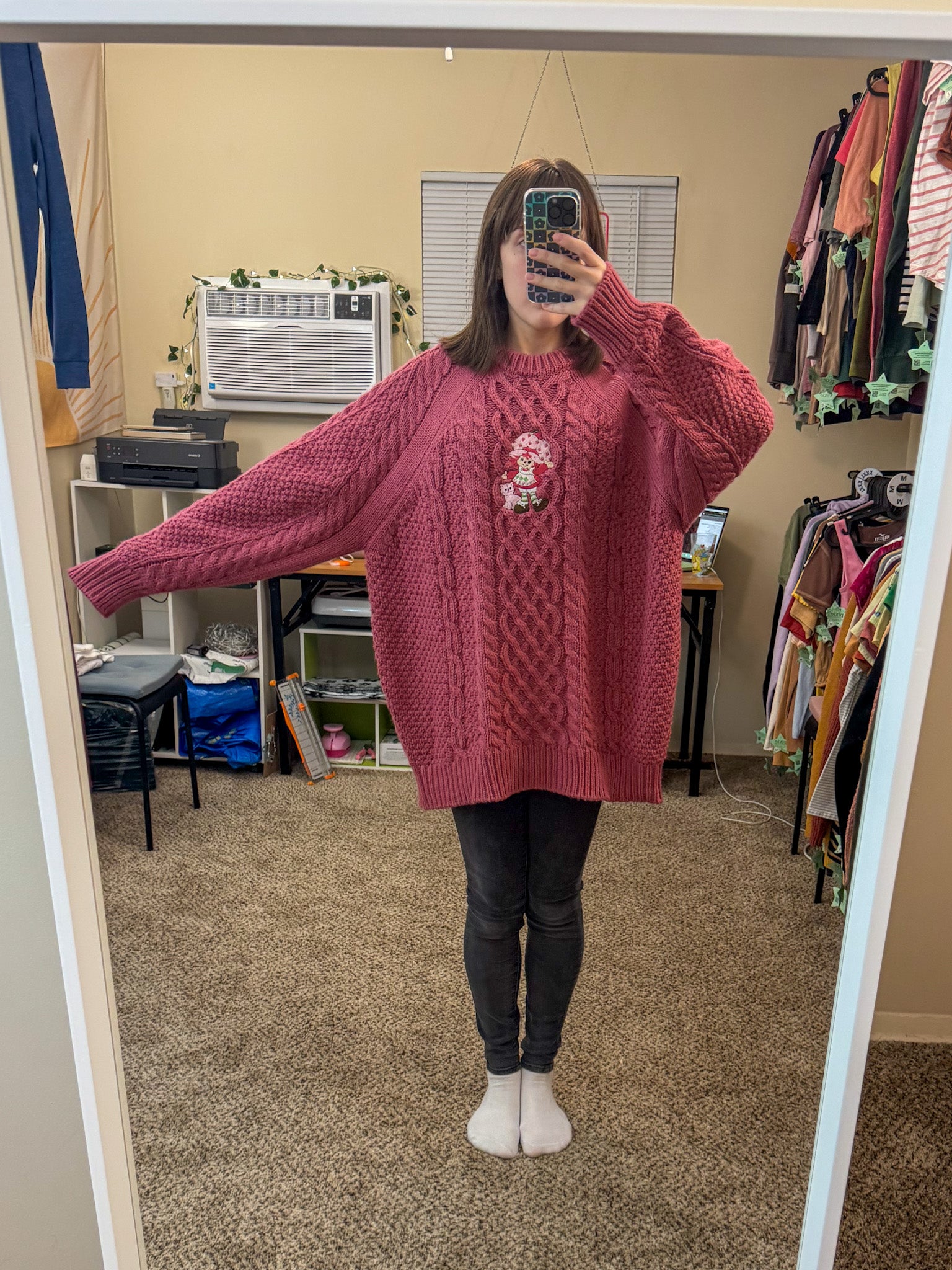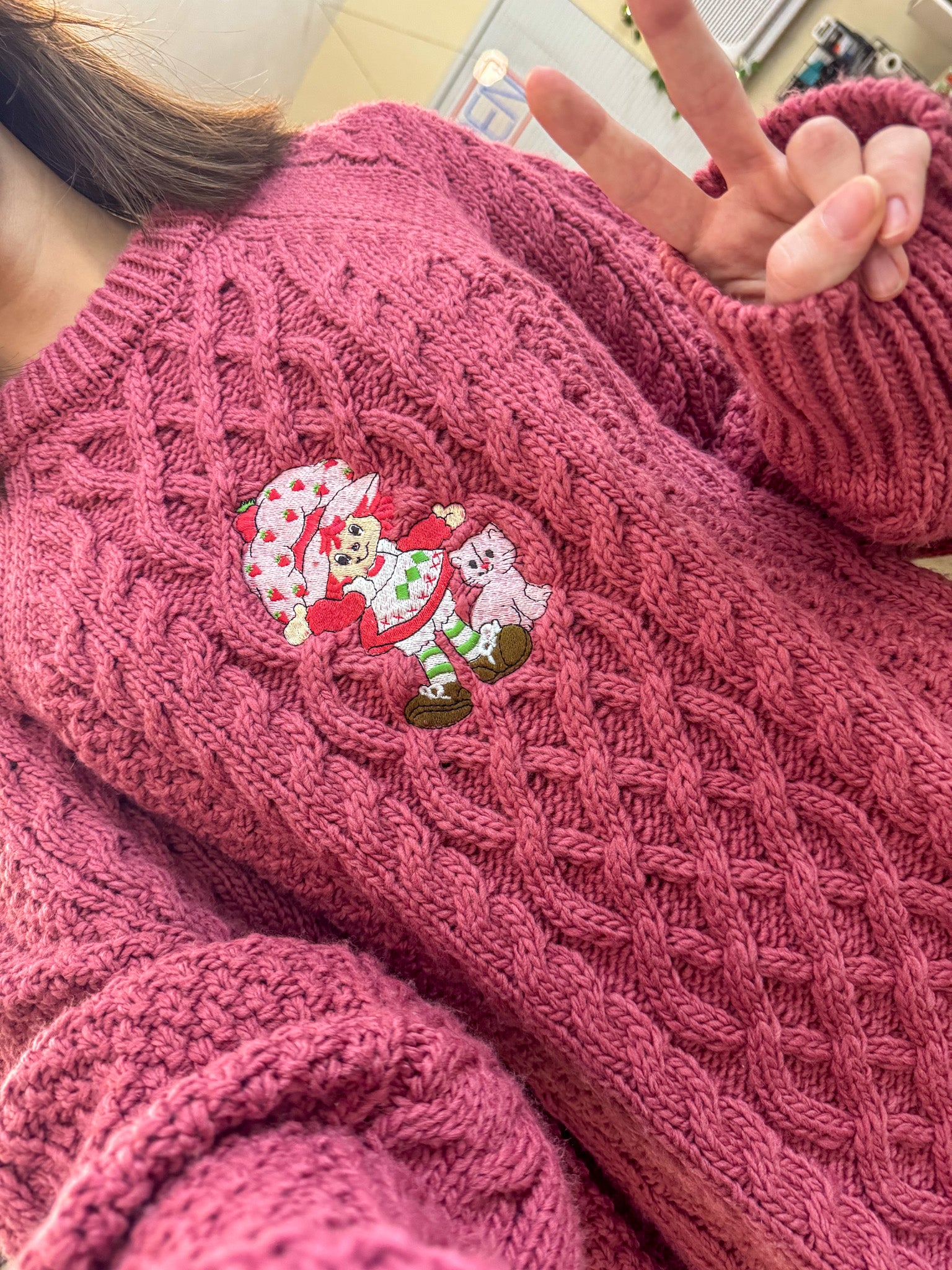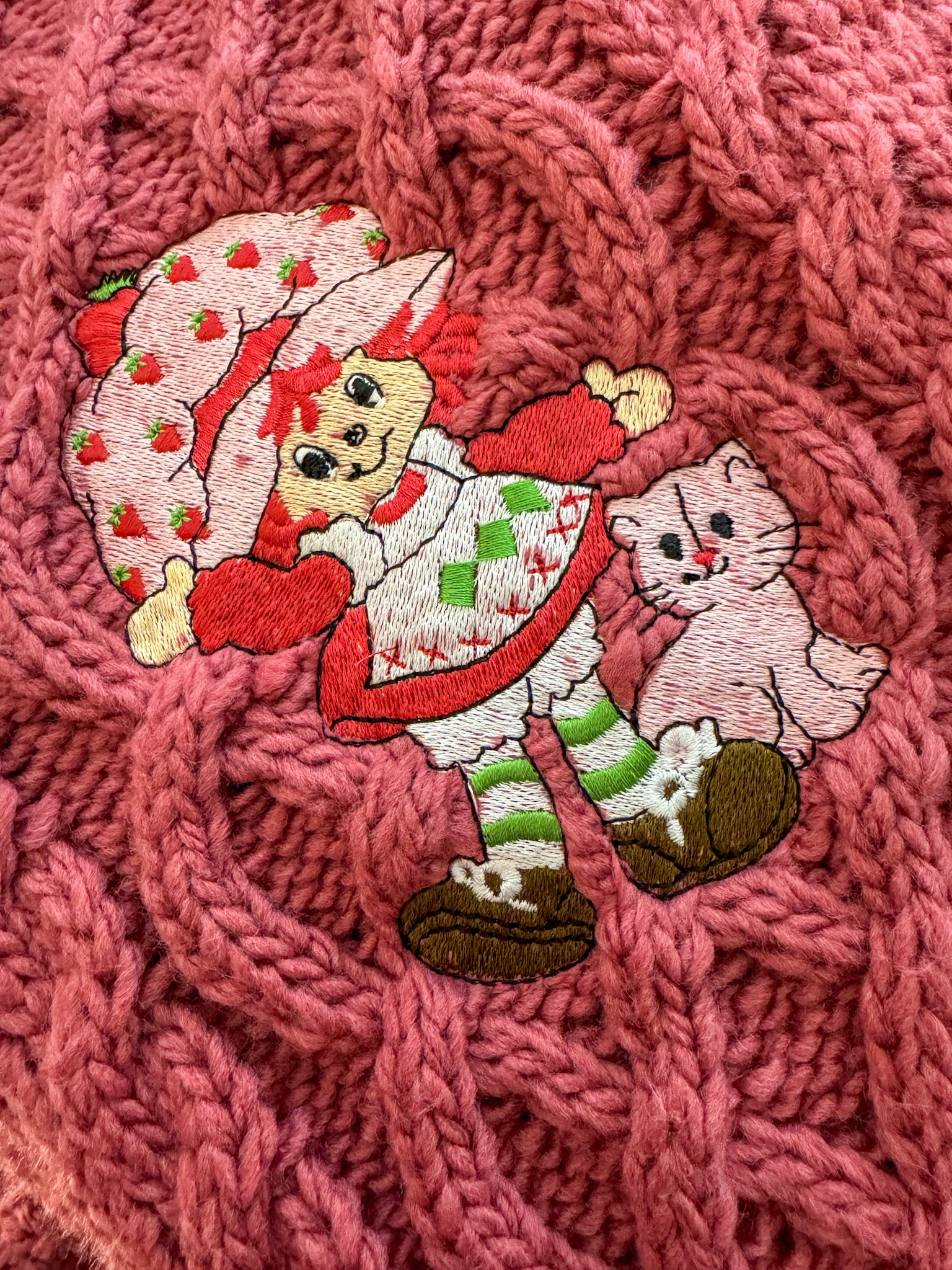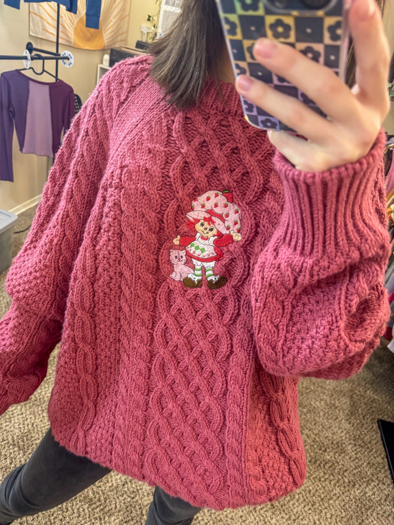 Get cozy and support sustainability with our Strawberry Shortcake Pink Sweater! This upcycled and embroidered secondhand garment is perfect for those who love slow fashion and supporting small businesses. Join the movement and stay warm in style!