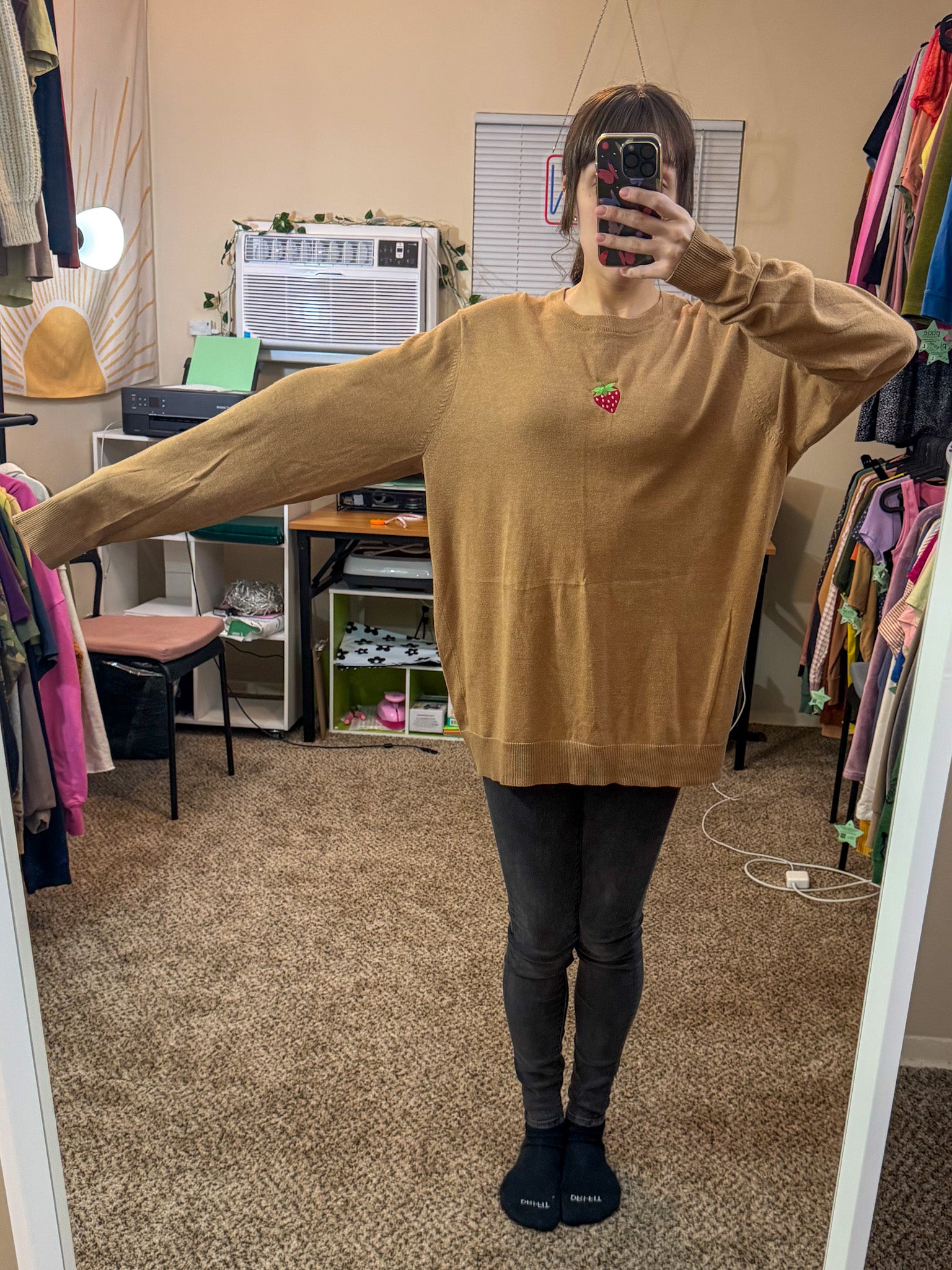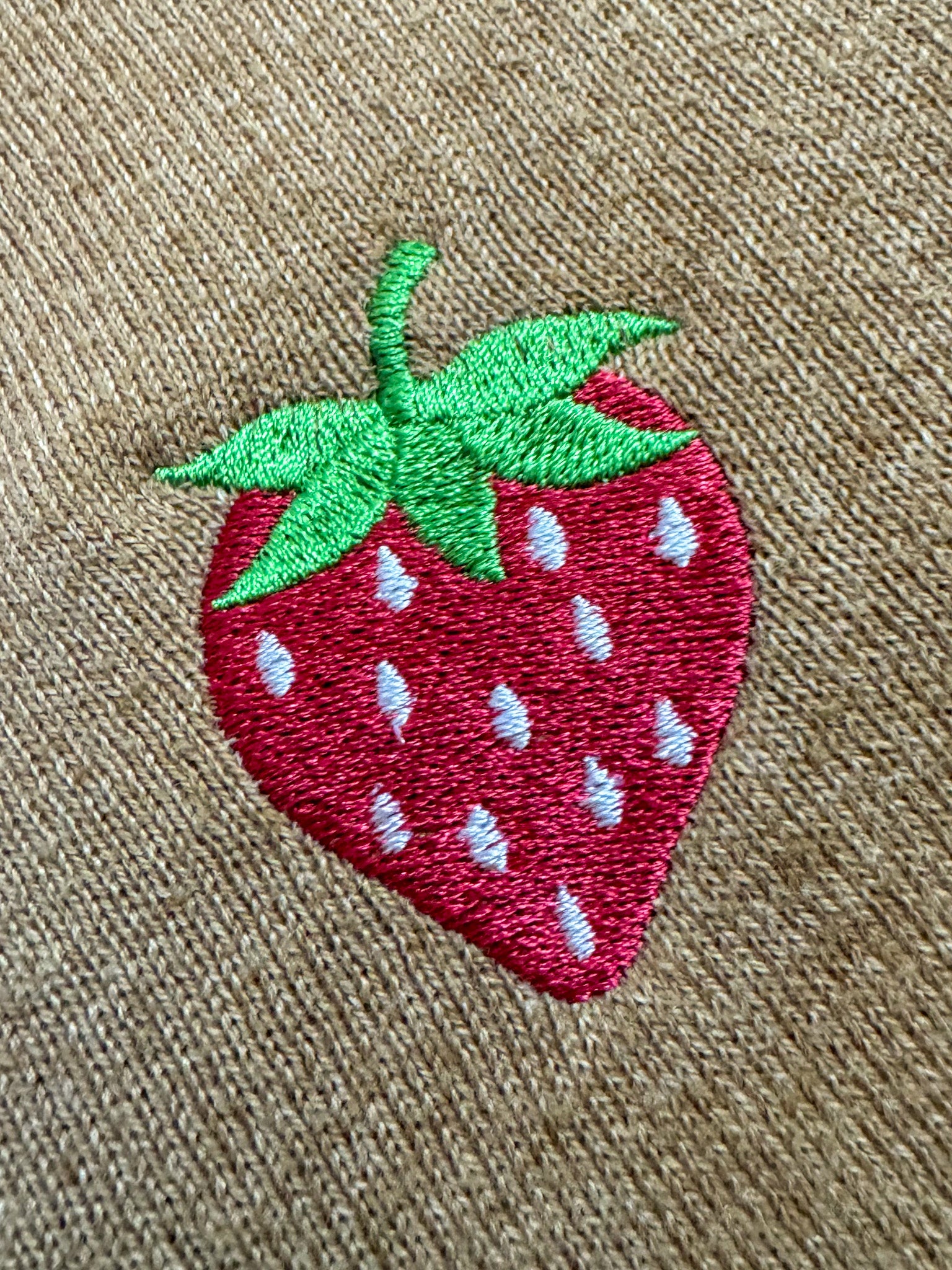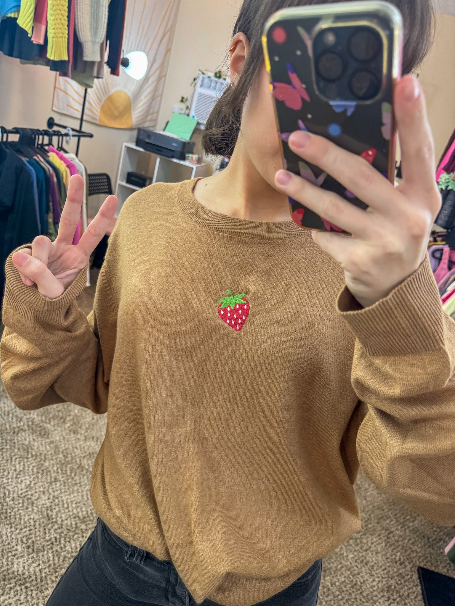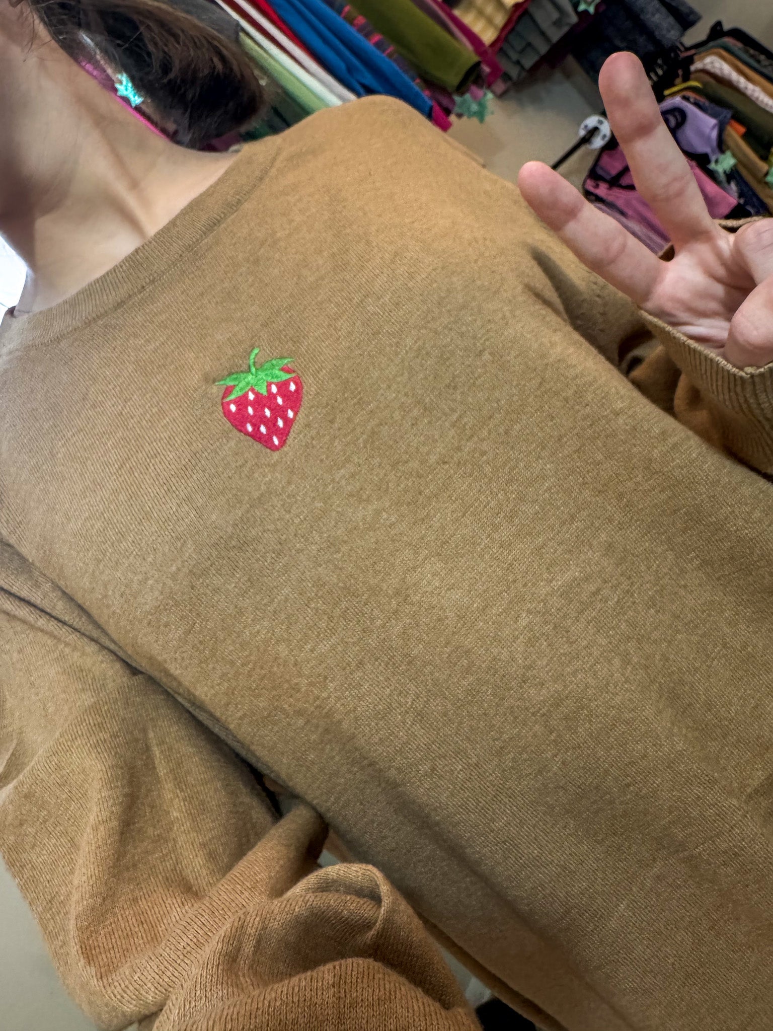 Get cozy in our Strawberry Tan Sweater, embroidered by us with love and upcycled from a discarded secondhand garment. Not only are you supporting our small biz, but you're also contributing to sustainable and slow fashion. Join the movement and rock this unique piece!
